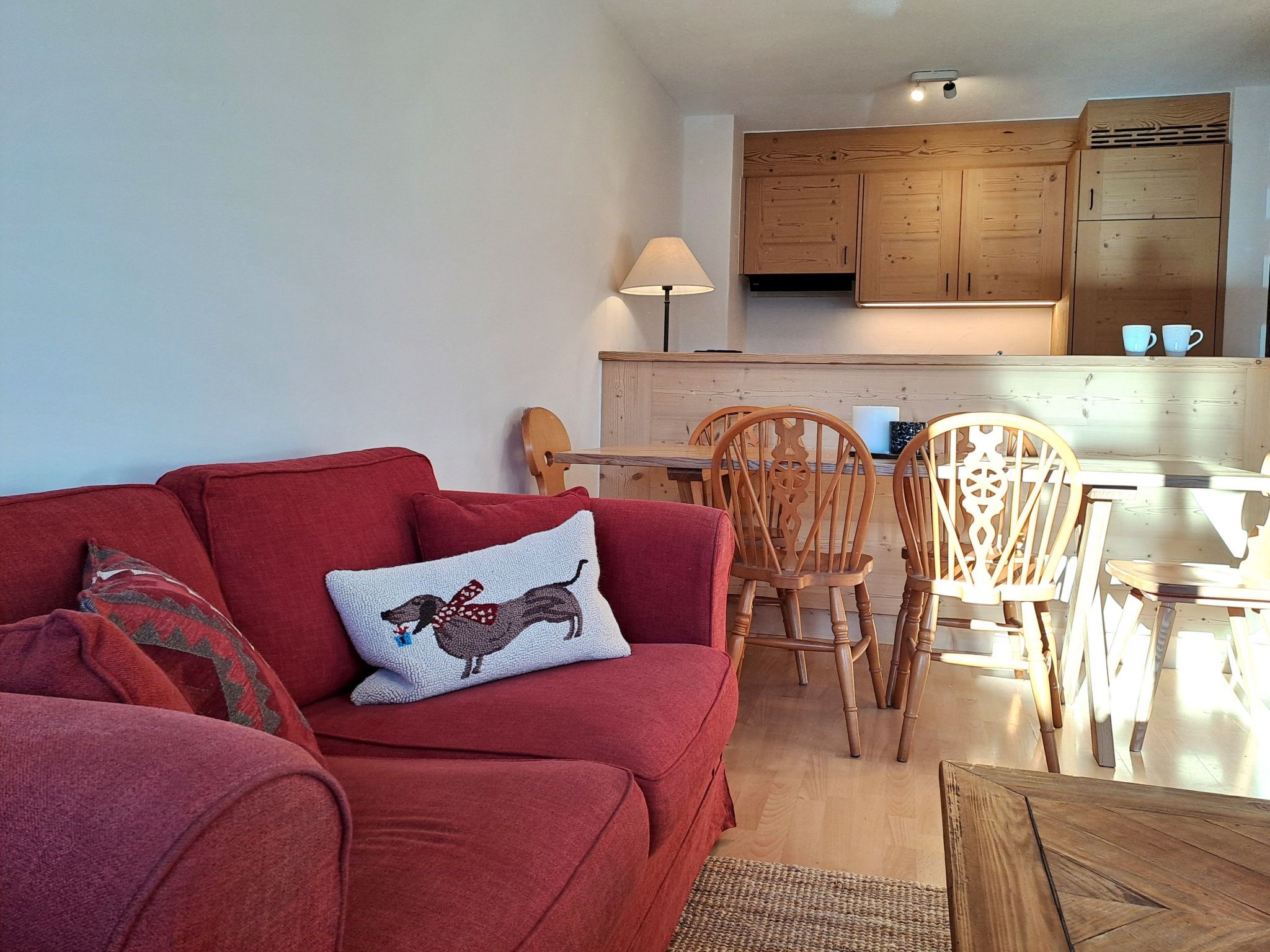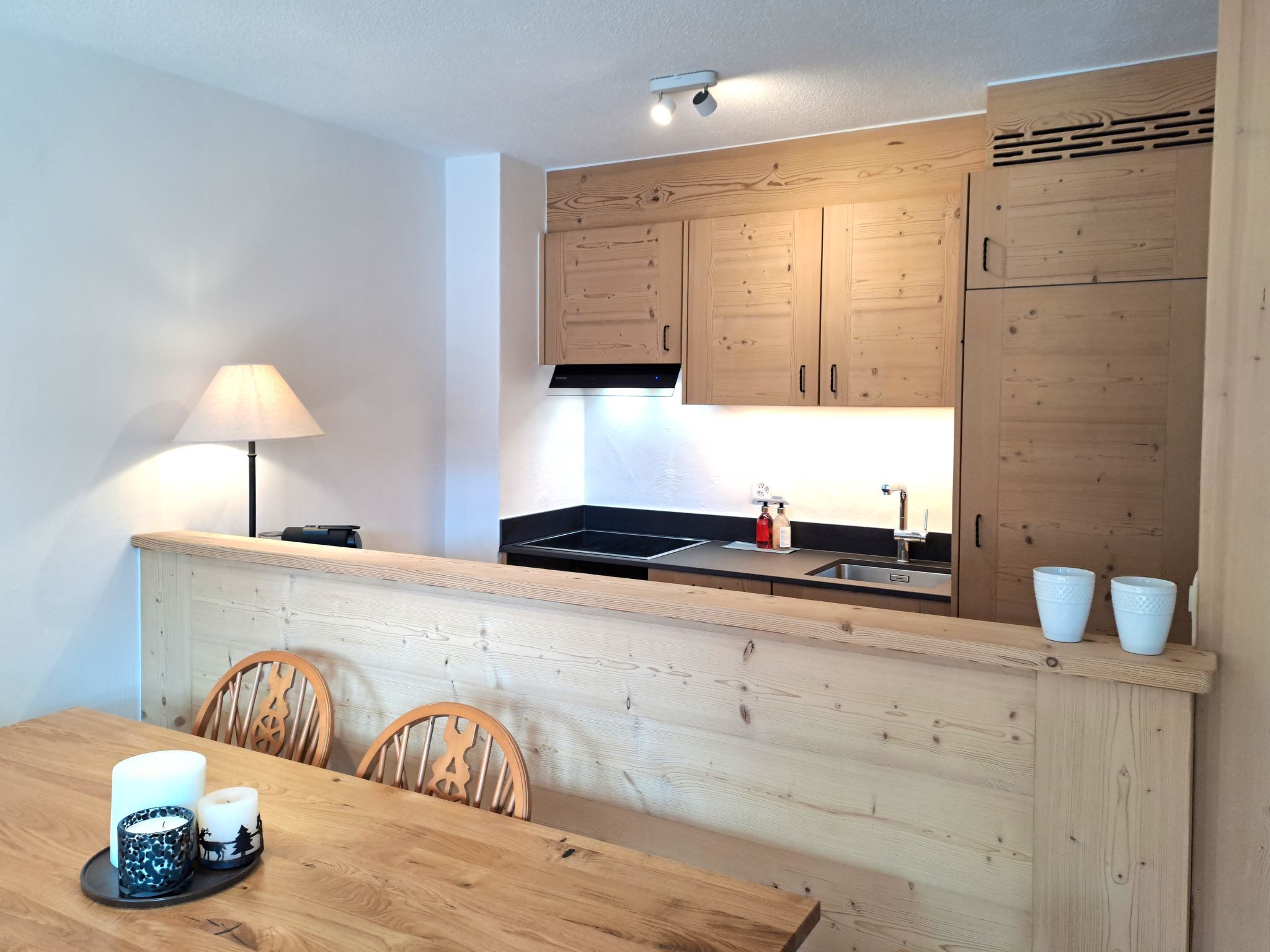 Galaxie 003, 2-Zimmer-Wohnung 42 m2, im erhöhten Erdgeschoss. Objekt geeignet für 2 Erwachsene. Geräumig, komfortabel und schön eingerichtet: 1 Zimmer mit 1 Bett (160 cm, Länge 200 cm). Wohn-/Esszimmer. Ausgang zur Terrasse. Kochnische (3 Kochplatten, Backofen, Toaster, Wasserkocher, elektrische Kaffeemaschine, Kapseln für die Kaffeemaschine (nespresaso) extra, Fondue Set (Käse)) mit Bad/WC. Parkettboden. Balkon, Südlage. Schöne Sicht auf die Berge. Zur Verfügung: Haartrockner. Bitte beachten: Nichtraucher-Unterkunft.