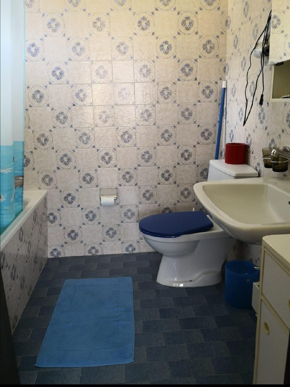 Badezimmer: WC, Lavabo und Spiegelschrank, Fenster, Badewanne mit Duschvorhang und Vorrichtung zum