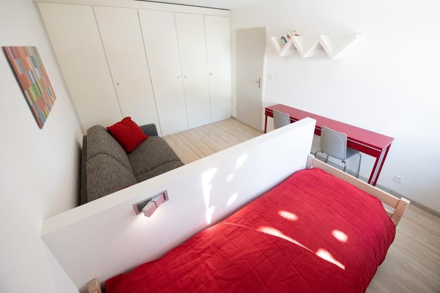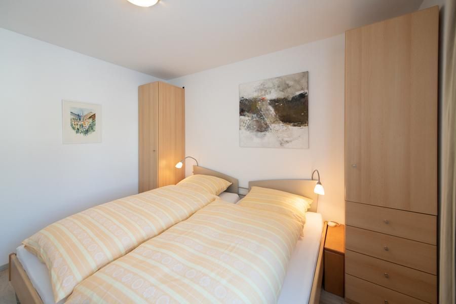 Schlafzimmer mit 2 Einzelbetten (Doppelbett). Schlafzimmer mit sep. Einzelbett und Schlafcouch sowie moderne Konsole als Schreibtisch nutzbar.