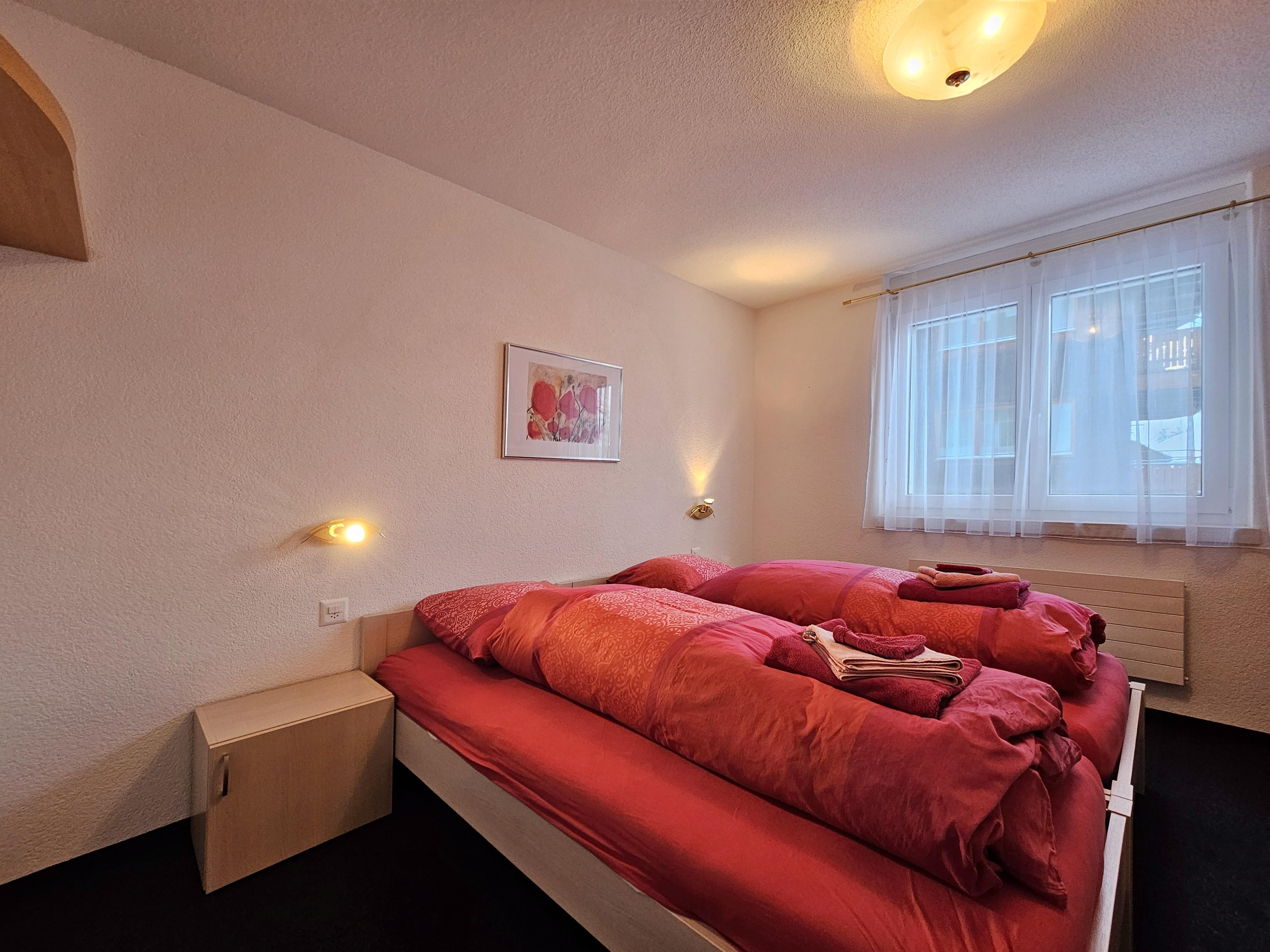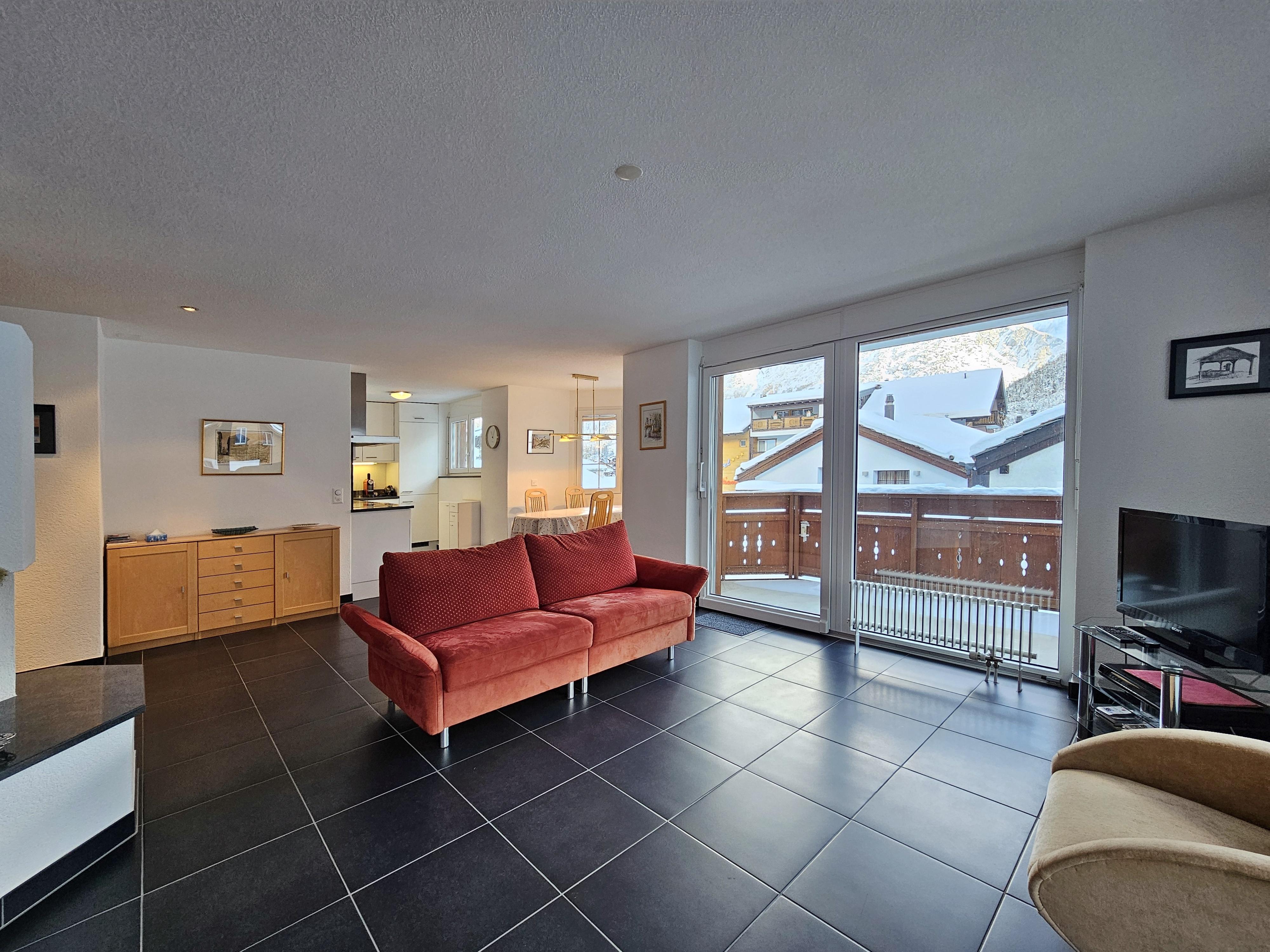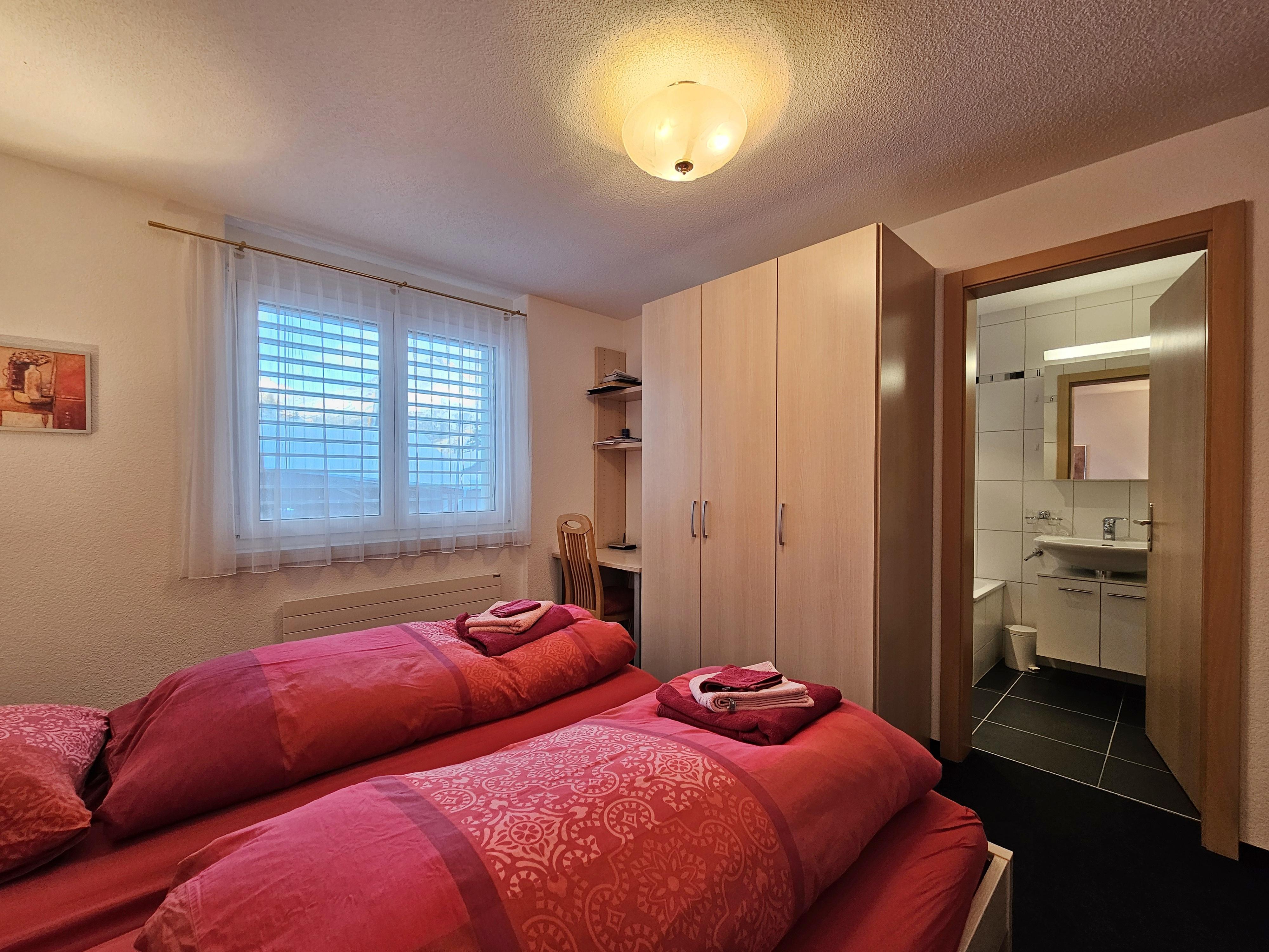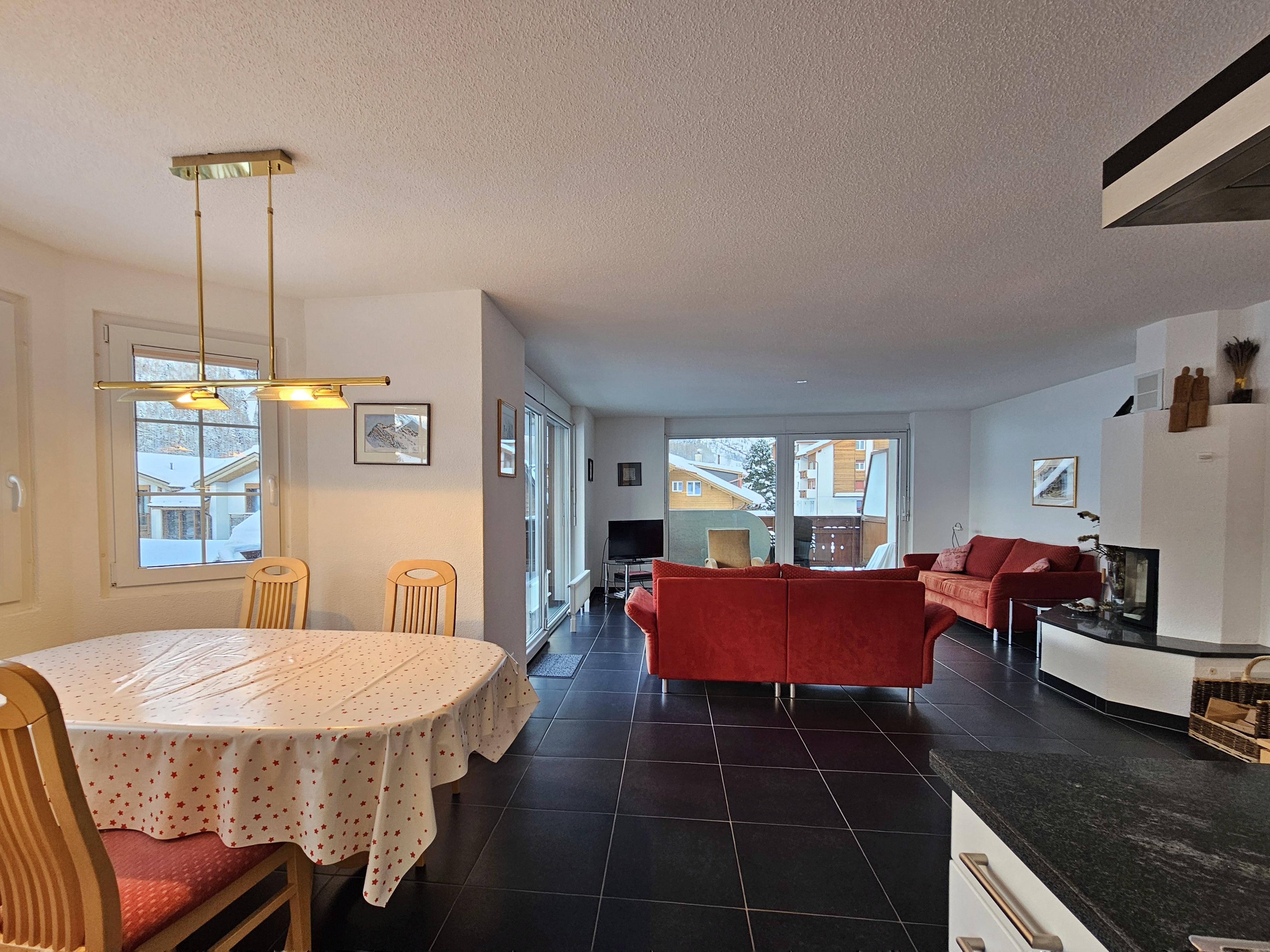 Die Wohnung befindet sich im 2.OG und hat 2 Schlafzimmer und 2 Badezimmer. Beide Schlafzimmer haben je zwei Einzelbetten. 1 Schlafzimmer verfügt über ein en-Suite Badezimmer mit Badewanne/WC/Waschbecken. Das 2. Badezimmer verfügt über Dusche/WC/Waschbecken. Im Wohnzimmer befindet sich neben den Sofa ein Holzkamin für gemütliche Abende. Die offene Küche ist gut ausgestattet und grenzt an die Essecke. Vom Wohnzimmer haben die Gäste Zugang zum grossen Balkon mit tolle Sicht über das Dorf und die Berge.