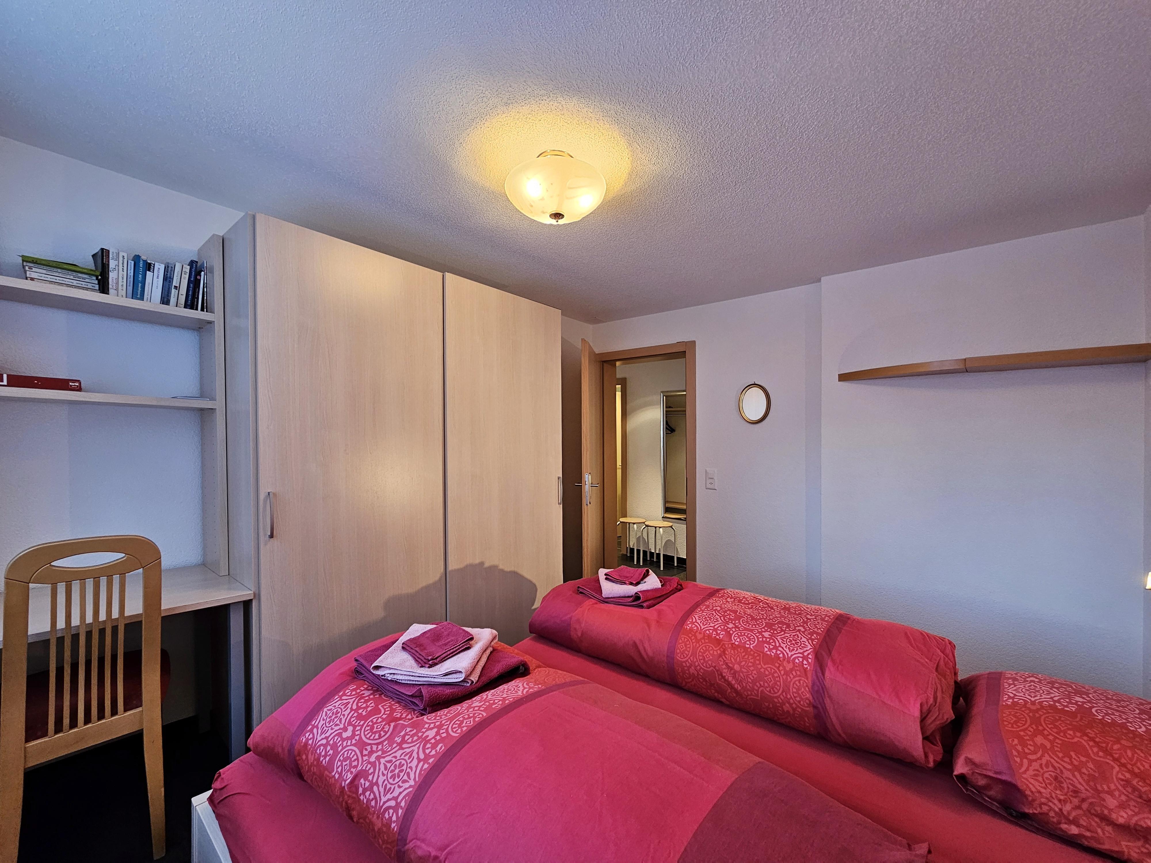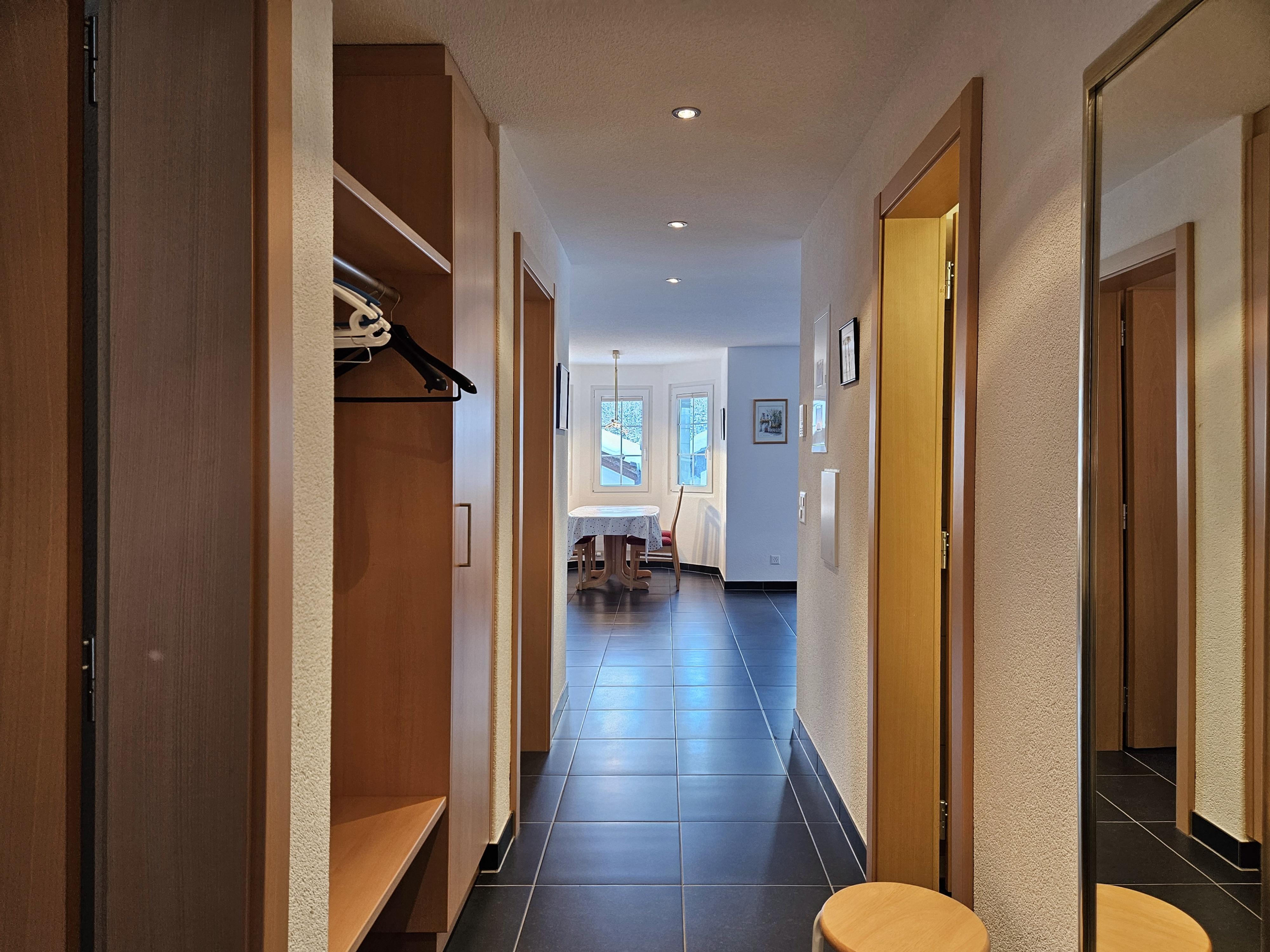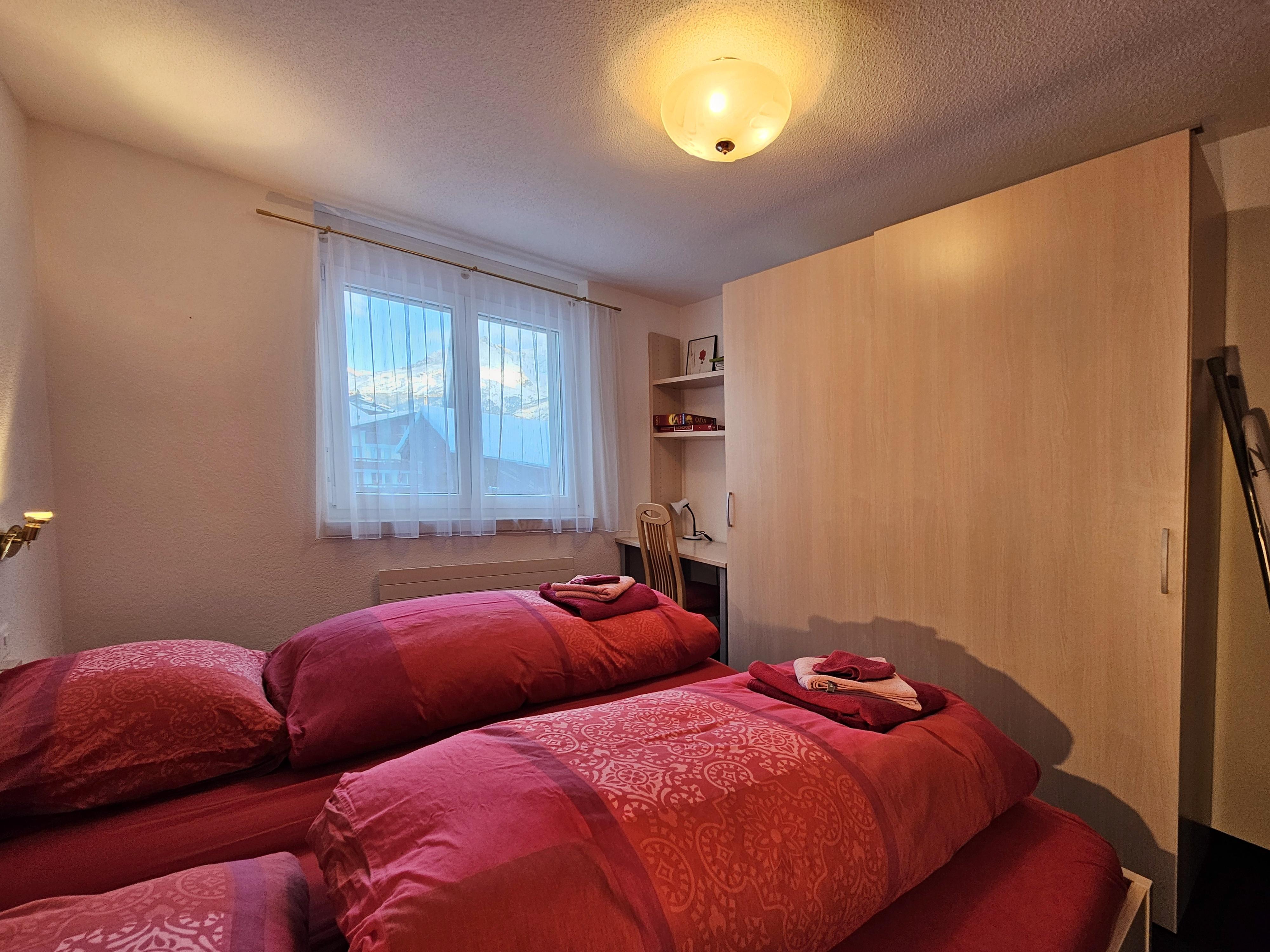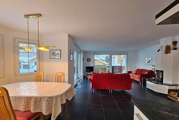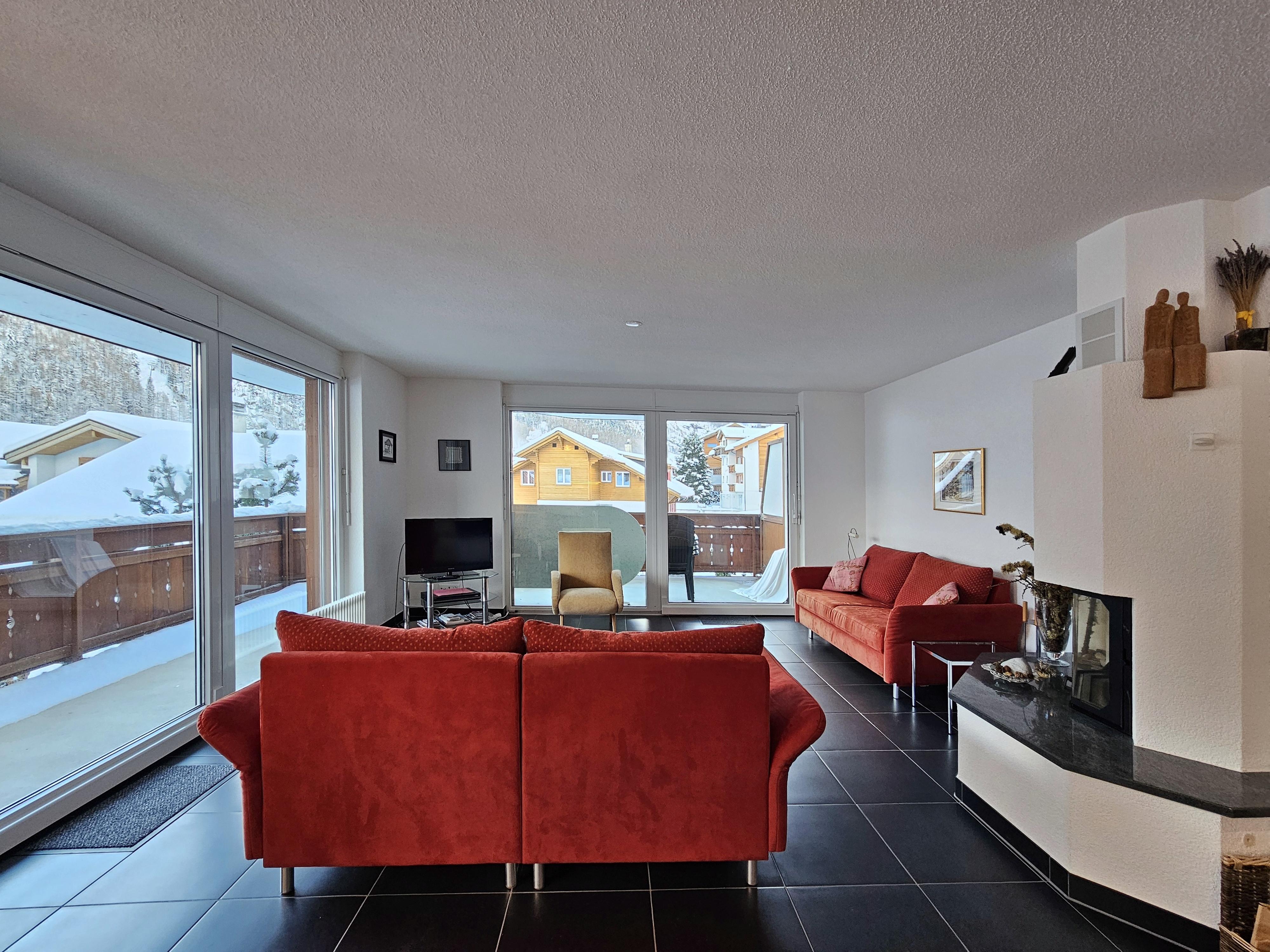 Die Wohnung befindet sich im 2.OG und hat 2 Schlafzimmer und 2 Badezimmer. Beide Schlafzimmer haben je zwei Einzelbetten. 1 Schlafzimmer verfügt über ein en-Suite Badezimmer mit Badewanne/WC/Waschbecken. Das 2. Badezimmer verfügt über Dusche/WC/Waschbecken. Im Wohnzimmer befindet sich neben den Sofa ein Holzkamin für gemütliche Abende. Die offene Küche ist gut ausgestattet und grenzt an die Essecke. Vom Wohnzimmer haben die Gäste Zugang zum grossen Balkon mit tolle Sicht über das Dorf und die Berge.