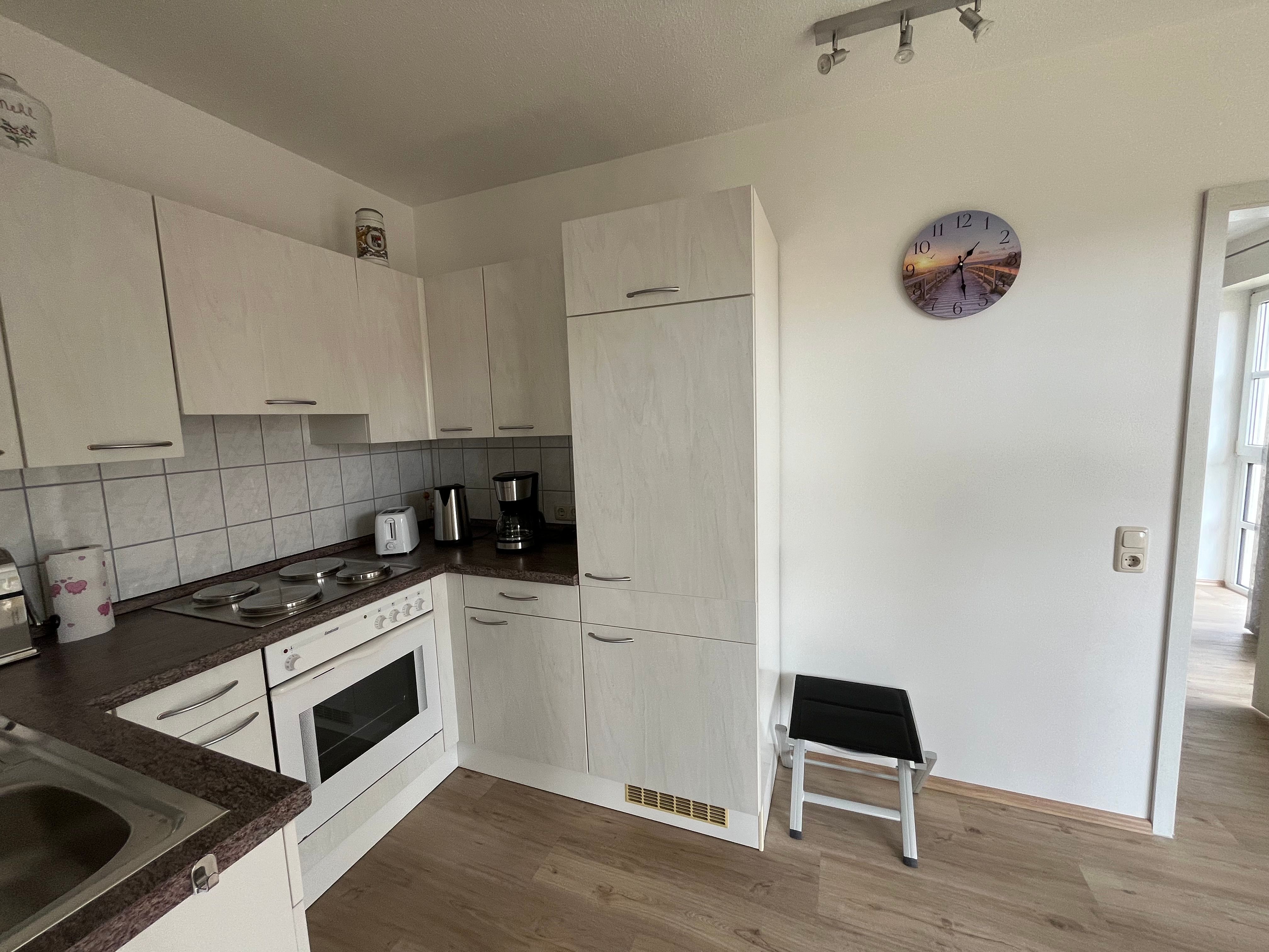 Die Küche ist mit Backofen, Kochfelder, Kühlschrank mit Gefrierfach, Kaffeemaschine, Wasserkocher und Toaster ausgestattet. Geschirr, Besteck und Küchenutensilien sind vorhanden.