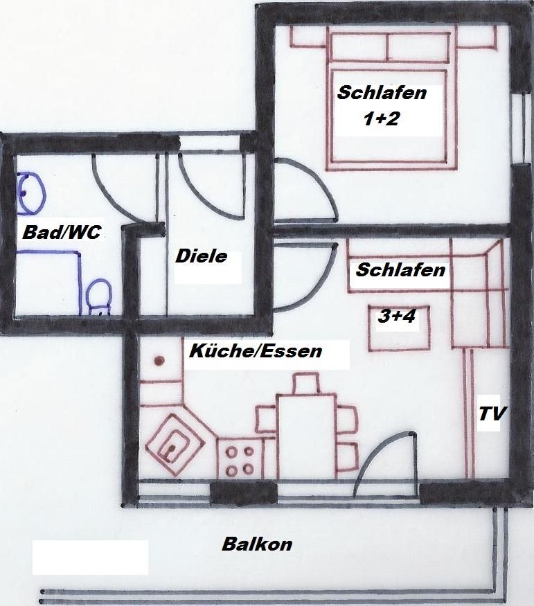 1 separater Schlafraum Doppelbett (1,80x2,00m), TV, Wohnen (Sofabett 2 Pers.), TV, Esstisch, Küche: Ceran-Kochfeld, Backofen, Mikrowelle, Spülmaschine, Kühl-/Gefrierschrank, Kaffeemaschine, Eier-/Wasserkocher, Toaster