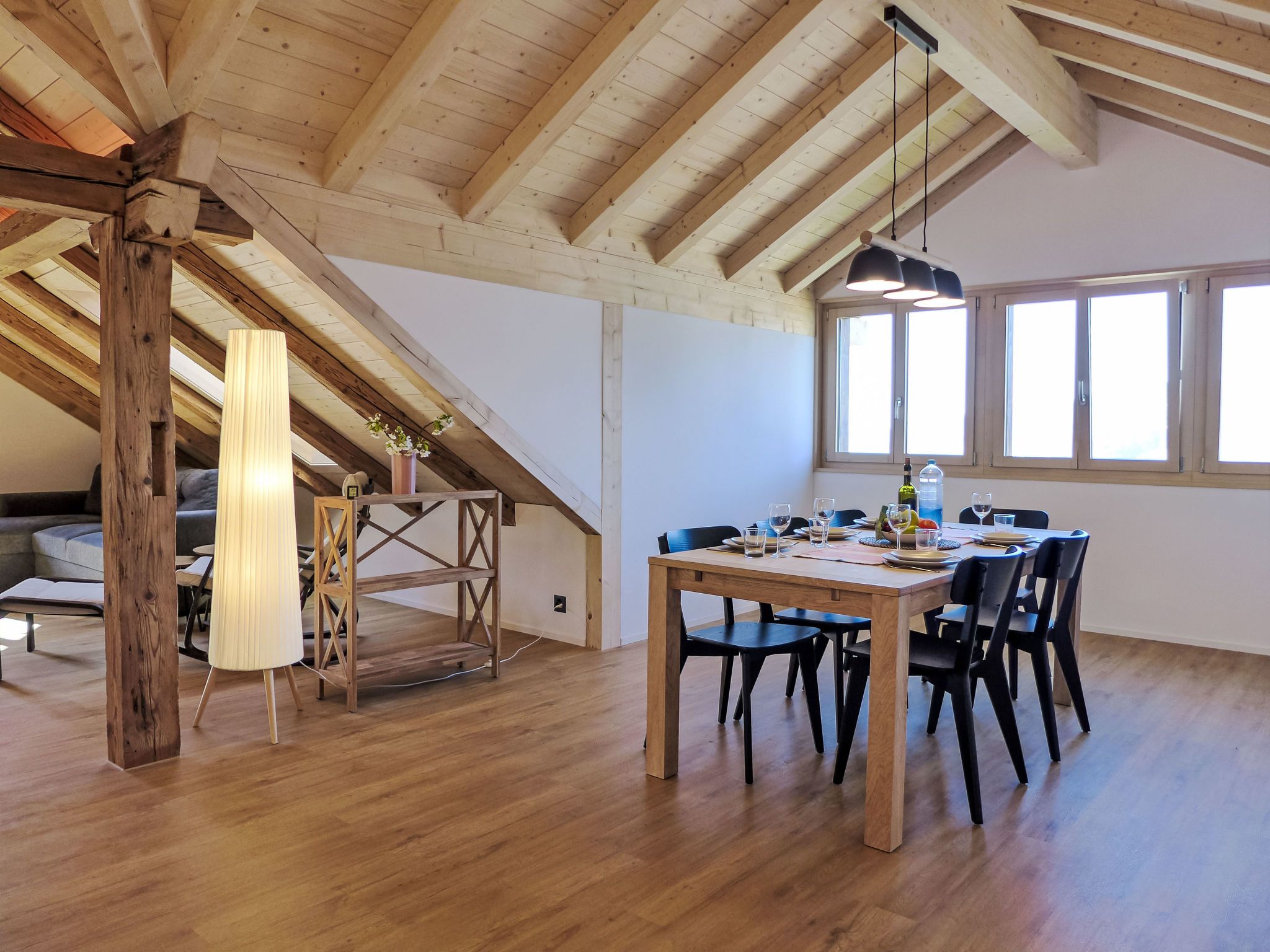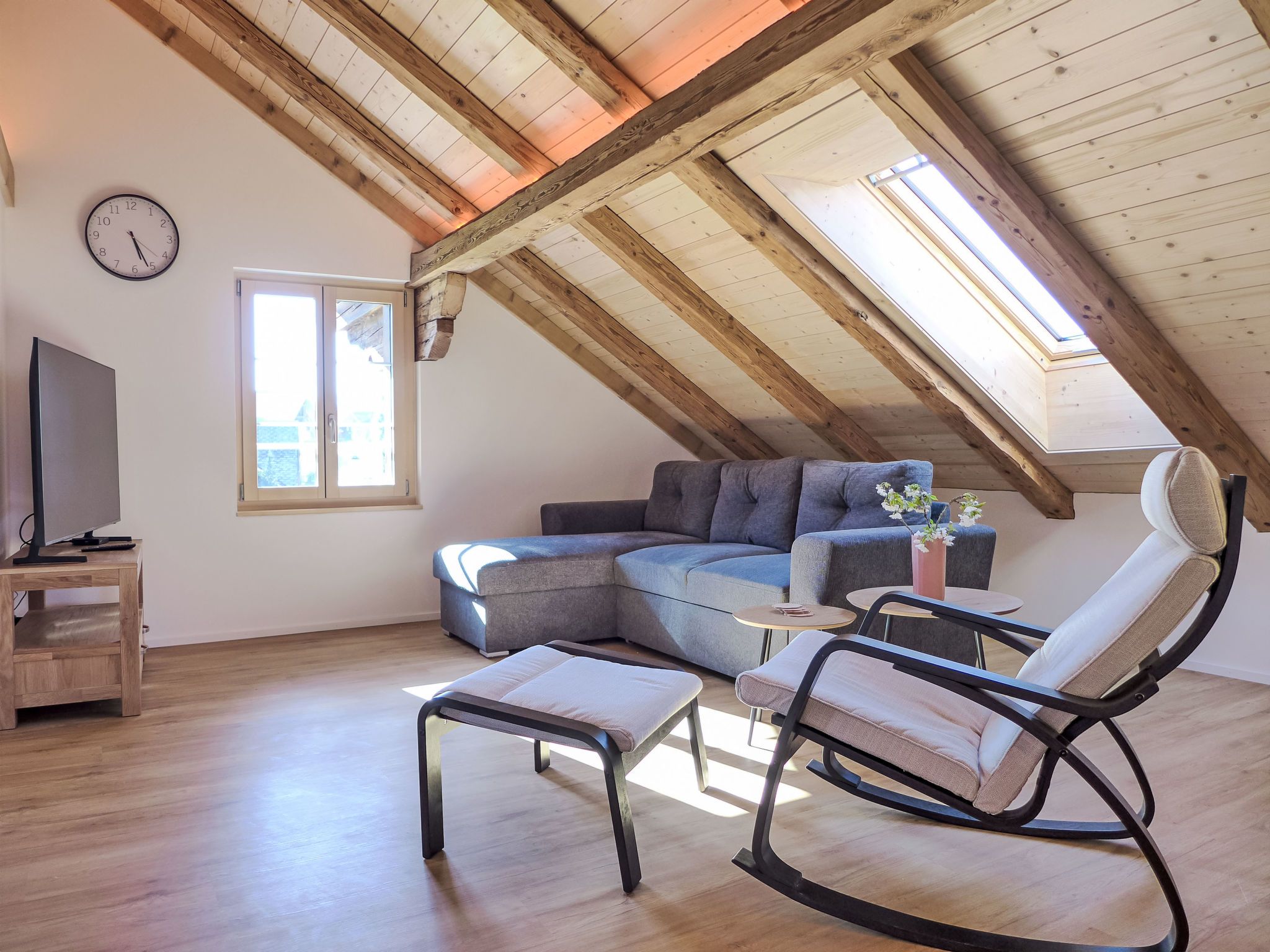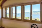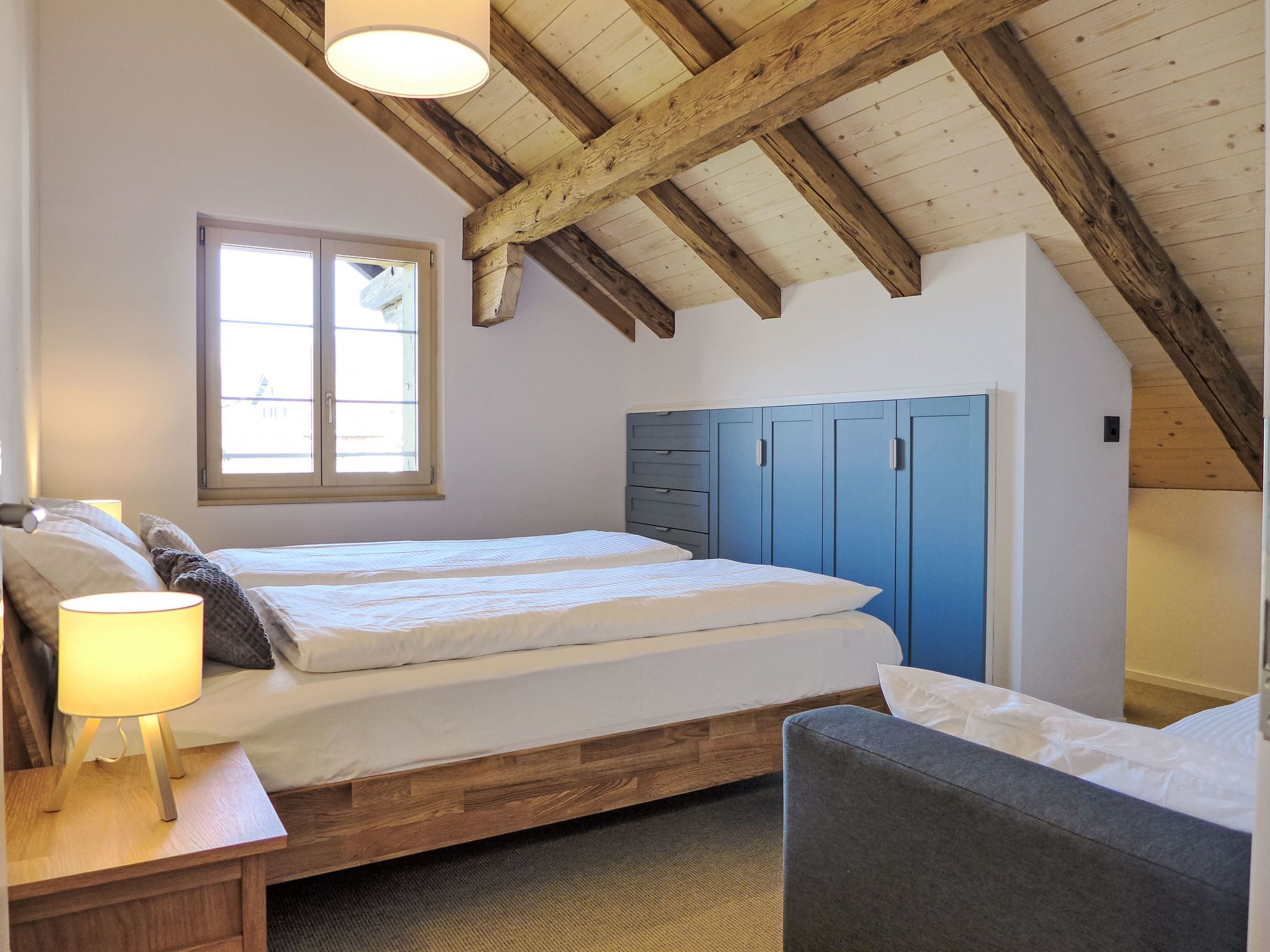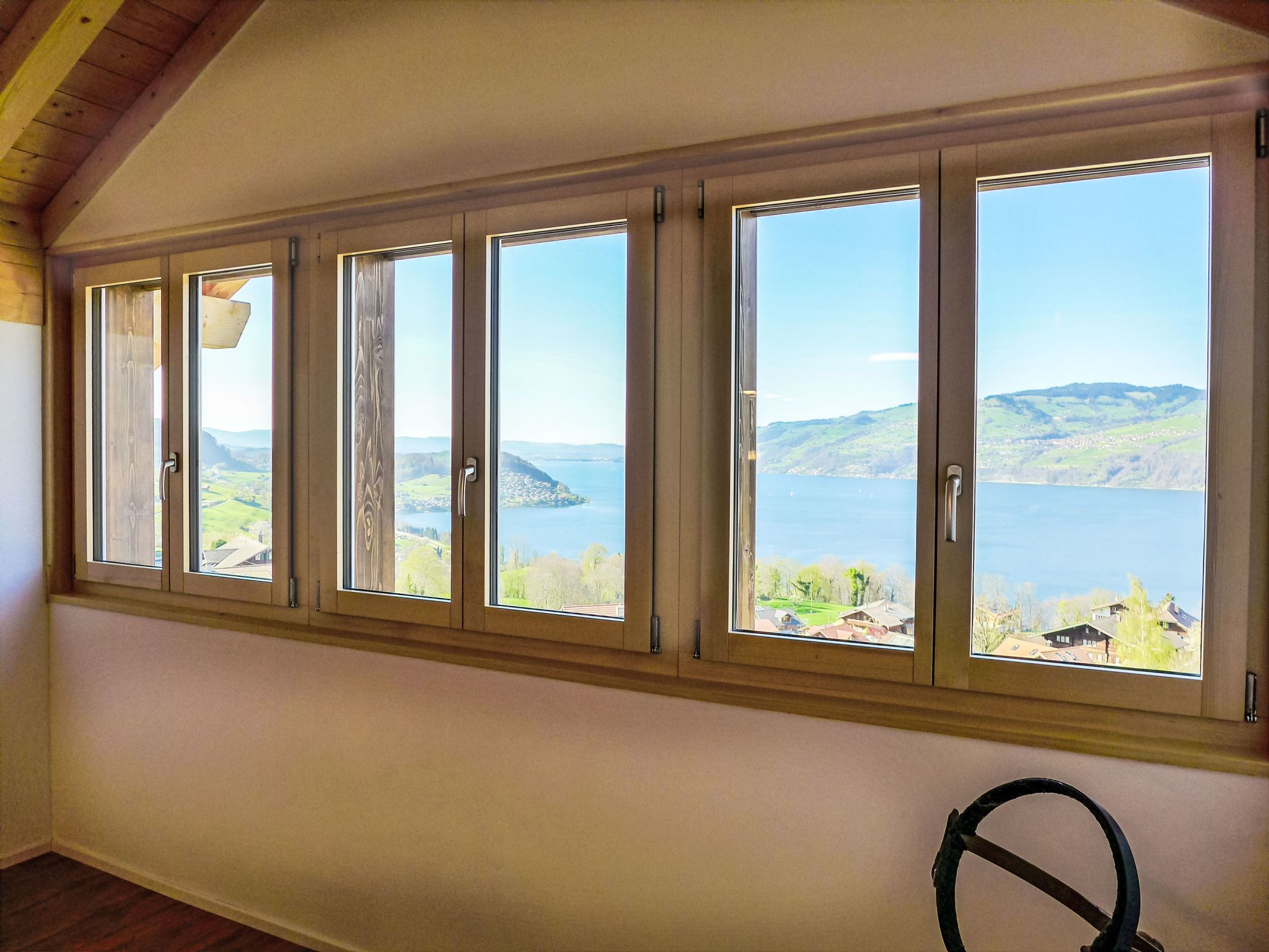 Huus Chloster, Apt Büel, 3-Zimmer-Wohnung 100 m2, im Dachgeschoss. Geräumig und hell, vollständig renoviert im Jahre 2025, sehr komfortabel und geschmackvoll eingerichtet: offenes grosses Wohn-/Esszimmer mit Panoramafenster mit Esstisch und Kabel-TV. 1 Zimmer mit Dachfenster mit 1 Doppelbett (2 x 90 cm, Länge 200 cm). 1 Zimmer mit 1 Diwanbett (80 cm, Länge 200 cm), 1 Doppelbett (2 x 90 cm, Länge 200 cm). Grosse, offene Küche (Geschirrspüler, 4 Induktionskochplatten, Toaster, Wasserkocher, Tiefkühler, elektrische Kaffeemaschine, Kapseln für die Kaffeemaschine (Nespresso) extra, Racletteofen, Kochinsel, Fondue Set (Chinoise, Käse)). Ausgang zum Balkon. Dusche/WC. Fussbodenheizung. Solarstrom. Balkon, Südlage. Herrliche Panoramasicht auf den See, die Berge und die Landschaft. Zur Verfügung: Kinderhochstuhl, Babybett bis 2 Jahre (extra), Haartrockner. Internet (WLAN, gratis). Parkplatz (1 Auto). E-Ladestation. Bitte beachten: nicht geeignet für Kinder unter 7 Jahren. Nichtraucher-Haus. Feuerlöscher.