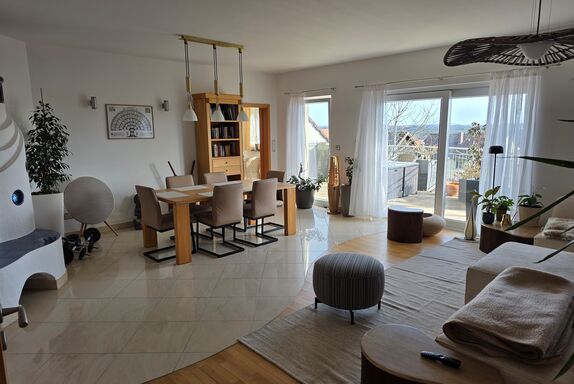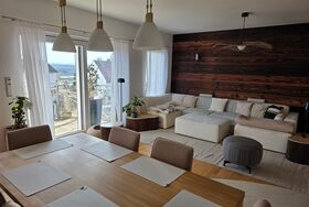 Gemütliche Wohnung mit Extraküche. Zwei Schlafzimmer mit Doppelbett. Das großzügige Wohnzimmer mit Esstisch und großer Wohnlandschaft garantiert gelungene Abende und bietet direkten Zugang zur weitläufigen Terasse mit Seeblick. Ein großer Garten mit Whirlpool kann gerne zur Erholung genutzt werden. Das Apartment ist mit einem Flachbild-TV sowie einem eigenen Bad mit großer Badewanne und begehbarer Dusche und einem Haartrockner und kostenlosen Pflegeprodukten ausgestattet. Markt Absberg bietet Einkaufsmöglichkeiten im Dorfladen, im regionalen Bäcker sowie Metzger an.