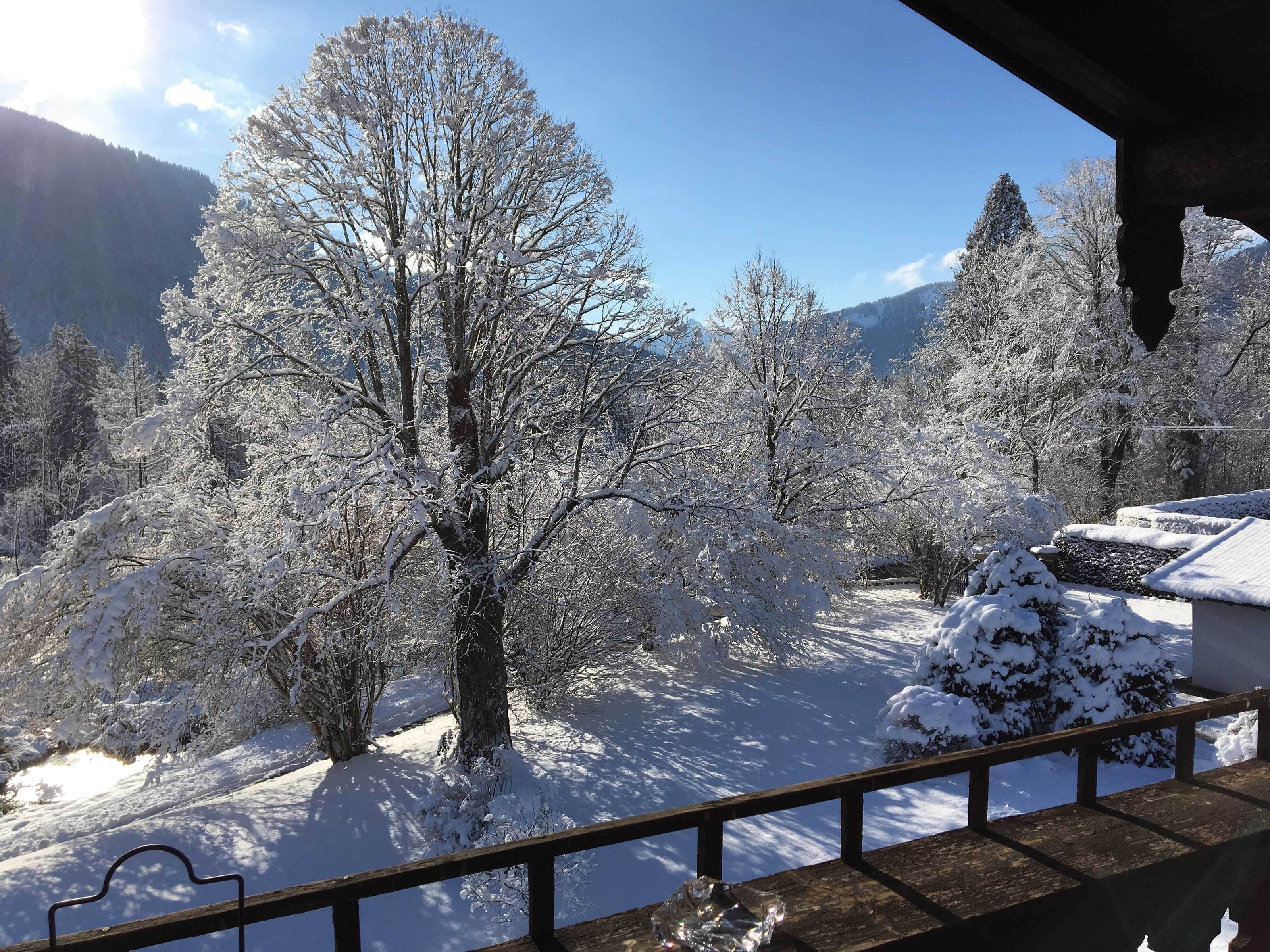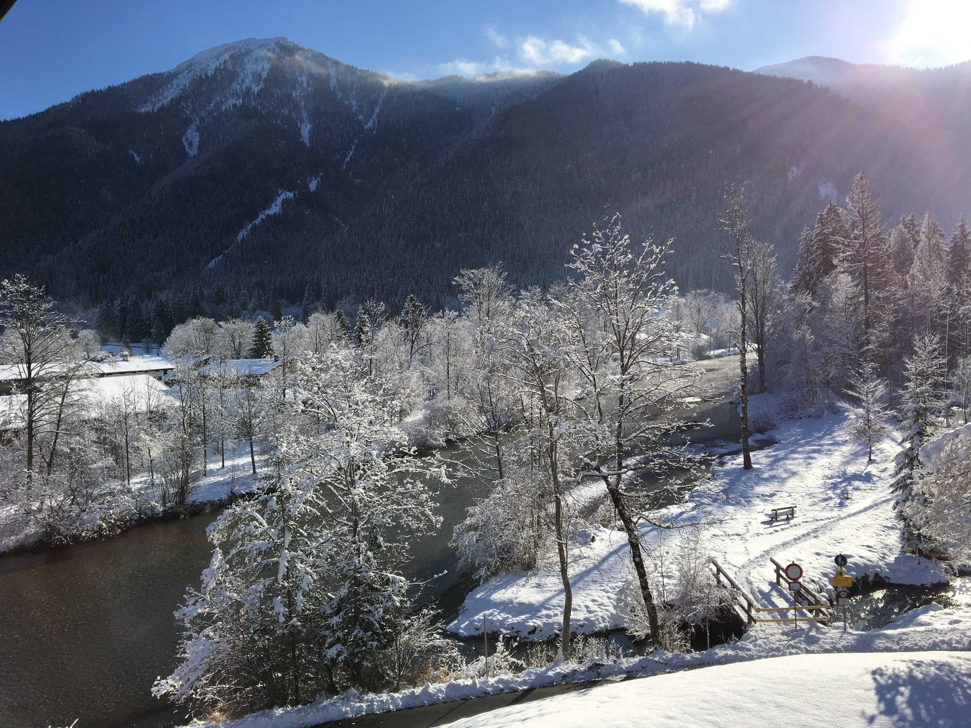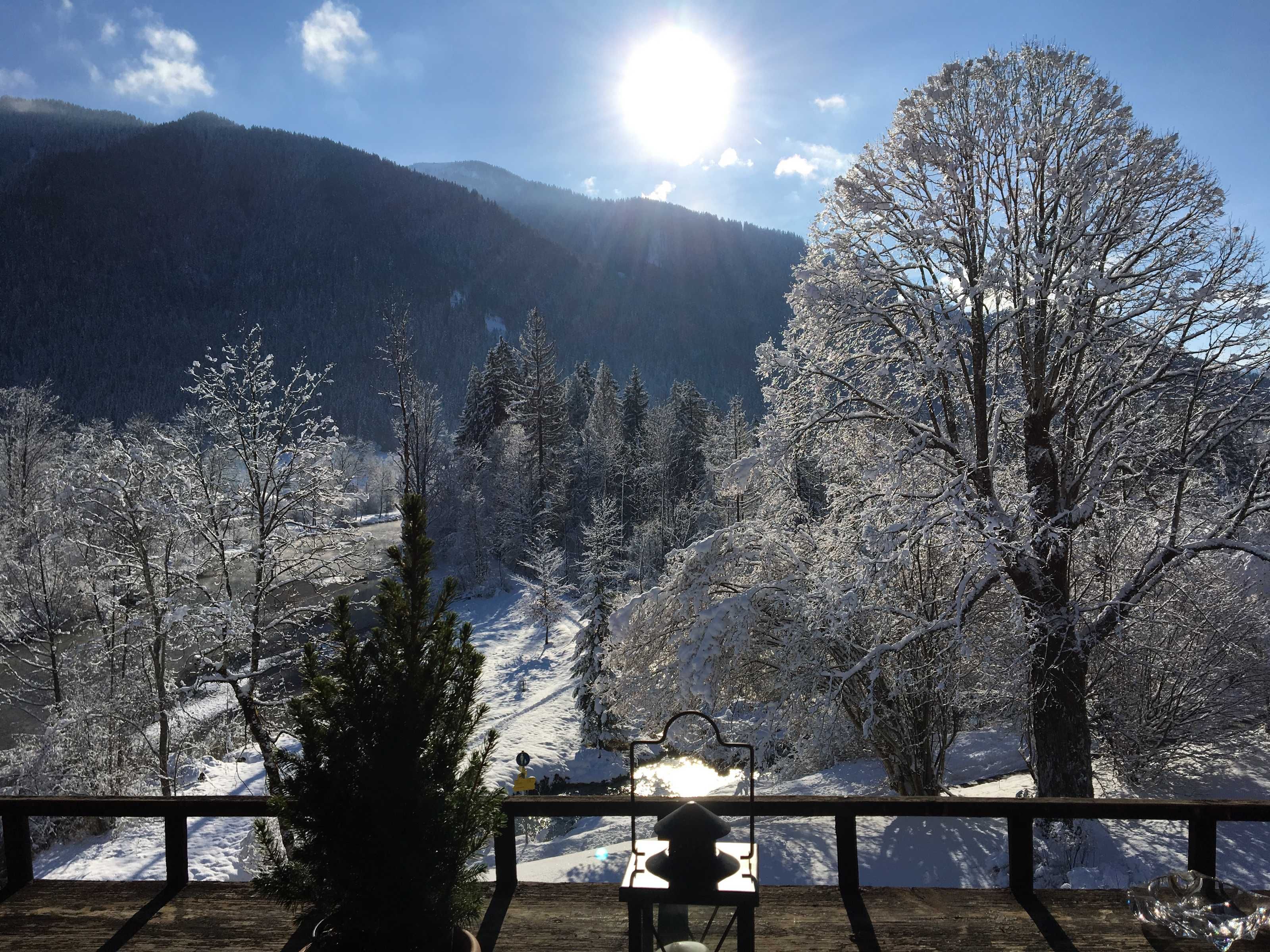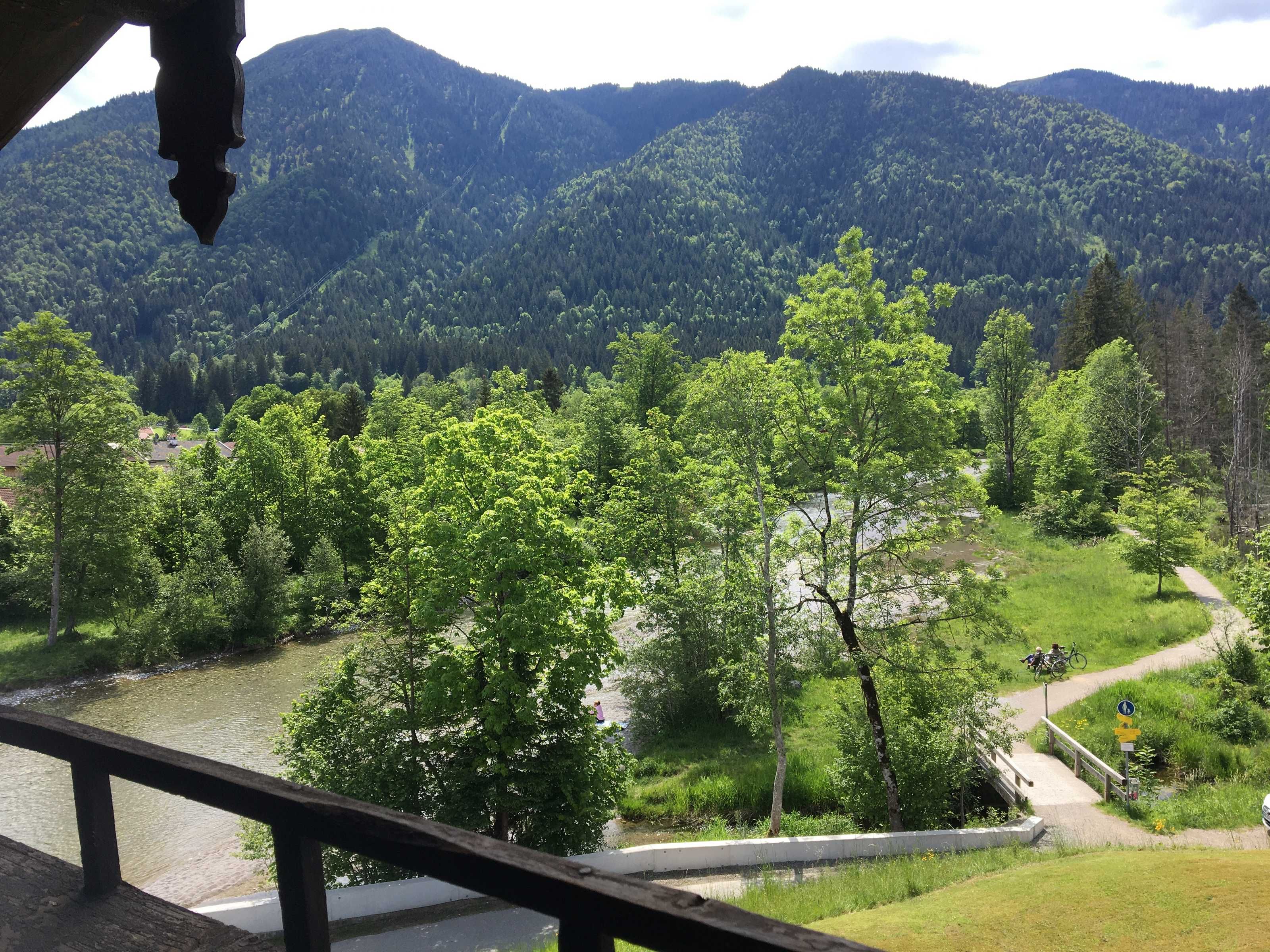 Vom Süd-Balkon hat man einen traumhaften Blick auf den Fluss, die Weissachau und den Wallberg.
