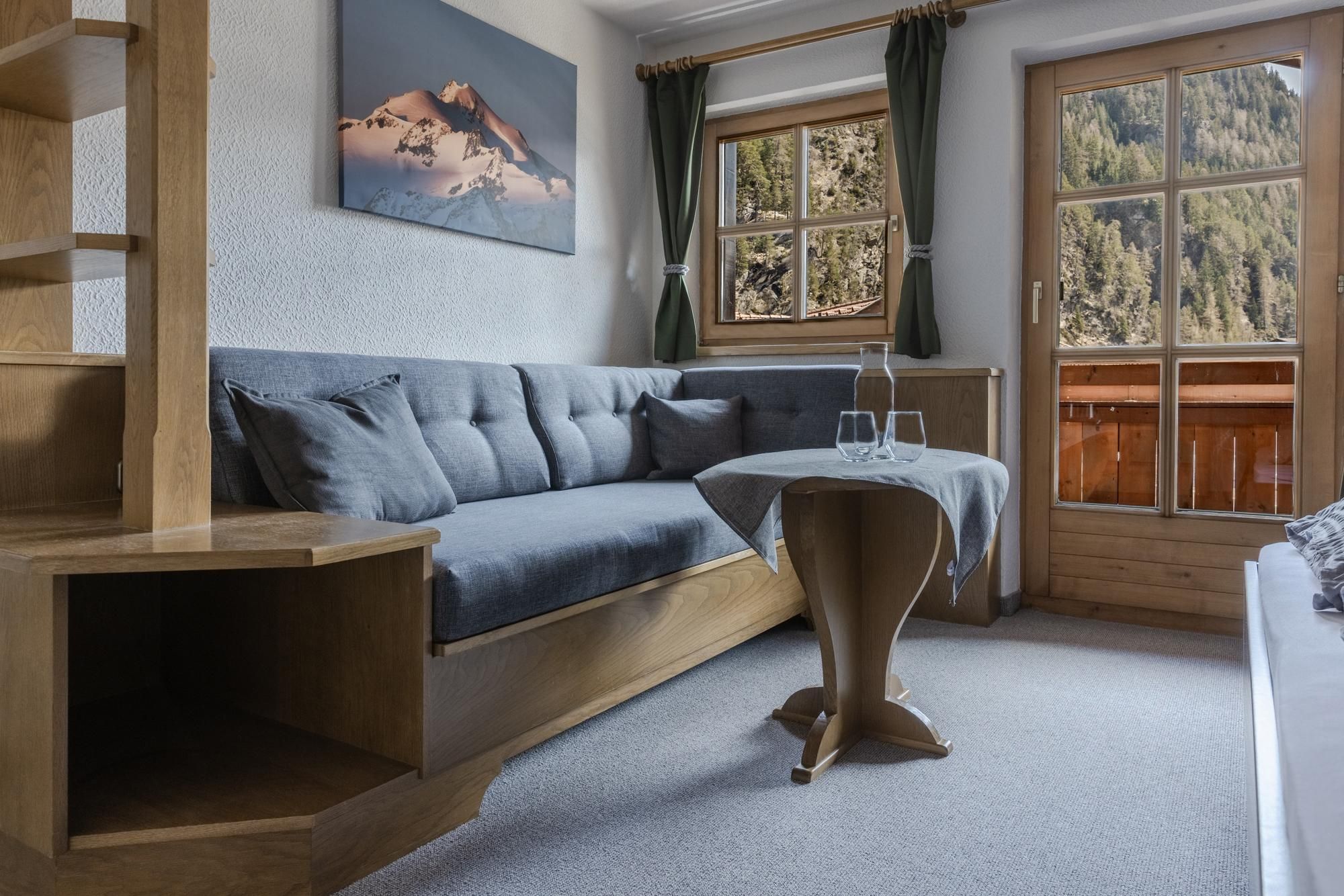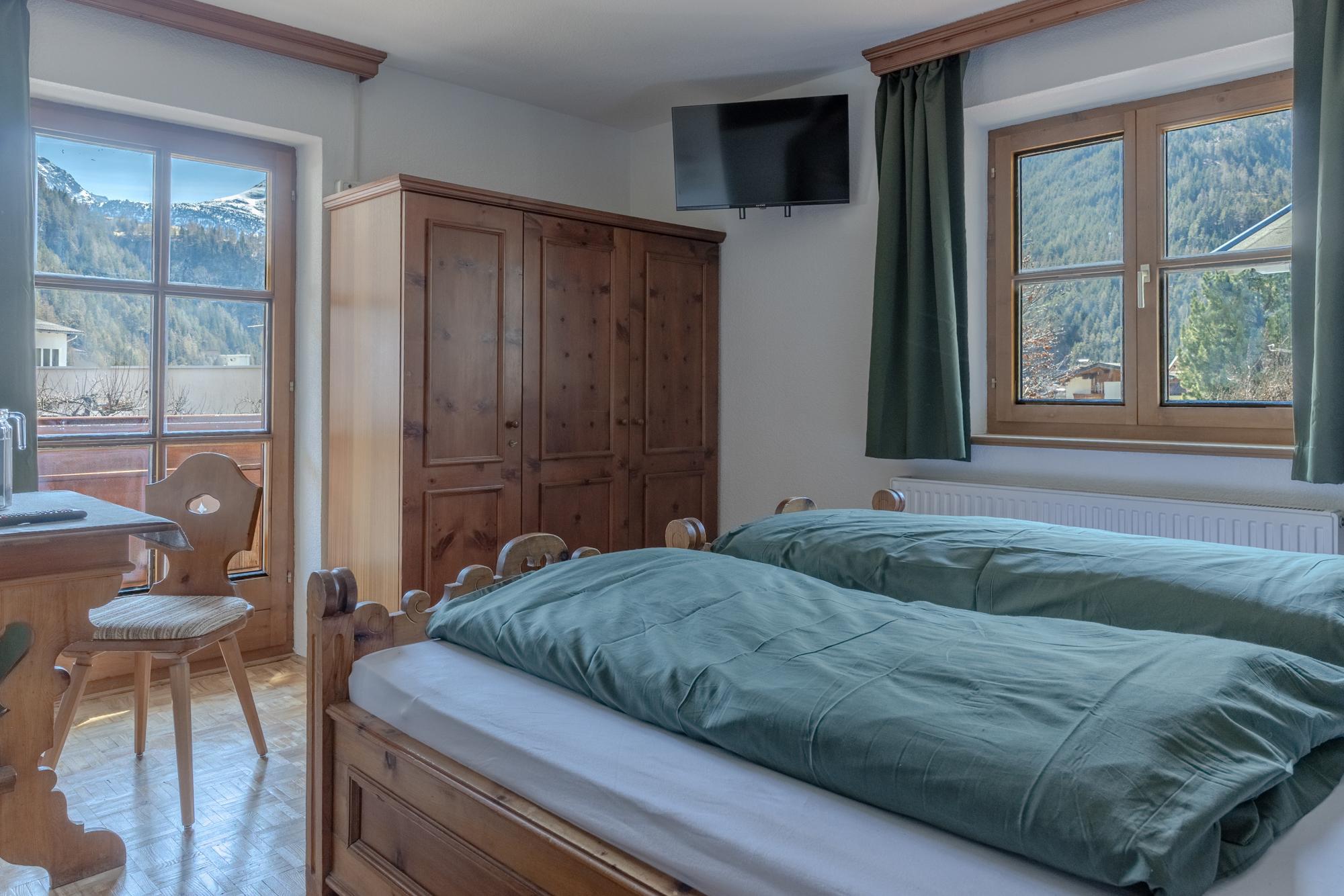 Doppelzimmer (ca. 20 m²) inklusive Smart-TV mit Satellitenempfang. Das Badezimmer ist mit Dusche und WC ausgestattet. Der möblierte Balkon eröffnet einen herrlichen Blick auf das Panorama der Ötztaler Alpen – ideal, um zur Ruhe zu kommen und die Umgebung in vollen Zügen zu genießen.