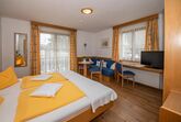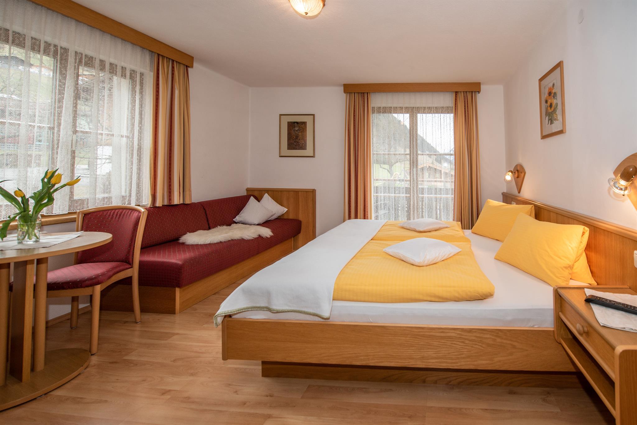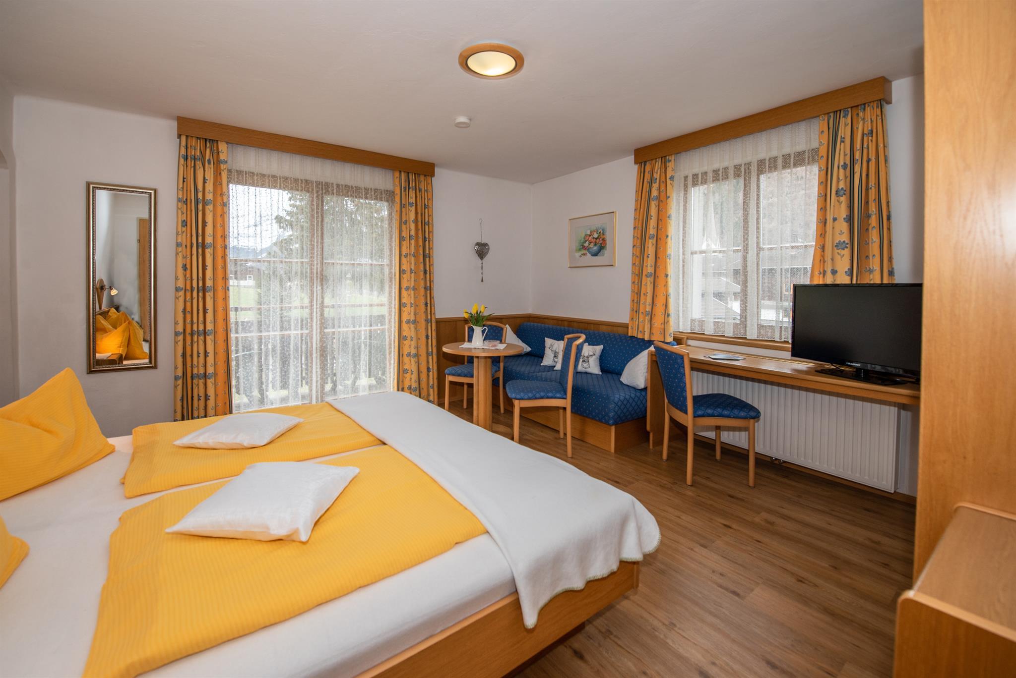 Neu eingerichtetes und renoviertes Doppelzimmer in sonniger Lage mit Dusche und WC, Balkon, Farb-TV, Radiowecker, Parkettboden und gemütliche Sitzecke;