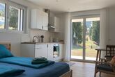 Die Unterkunft befindet sich im Erdgeschoss und ist rollstuhlgerecht. Das Auto kannst du auf dem Aussenparkplatz direkt vor dem Studio oder in der hauseigenen Tiefgarage abstellen. Ein Aufzug ist vorhanden. Gartenmöbel, inklusive Liegestuhl und Grill, stehen zur Verfügung. Das 1,80 Meter breite Doppelbett bietet Platz für zwei Personen, kann aber auch einfach als zwei Einzelbetten genutzt werden. Auf Anfrage ist ein Babybett erhältlich.