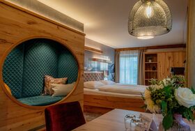 Geräumig, stilvoll und mit viel Liebe zum Detail eingerichtet, erwartet Sie unsere Suite „Manggei“ mit einer gemütlichen „Kuschelhöhle-Schlafkoje“.