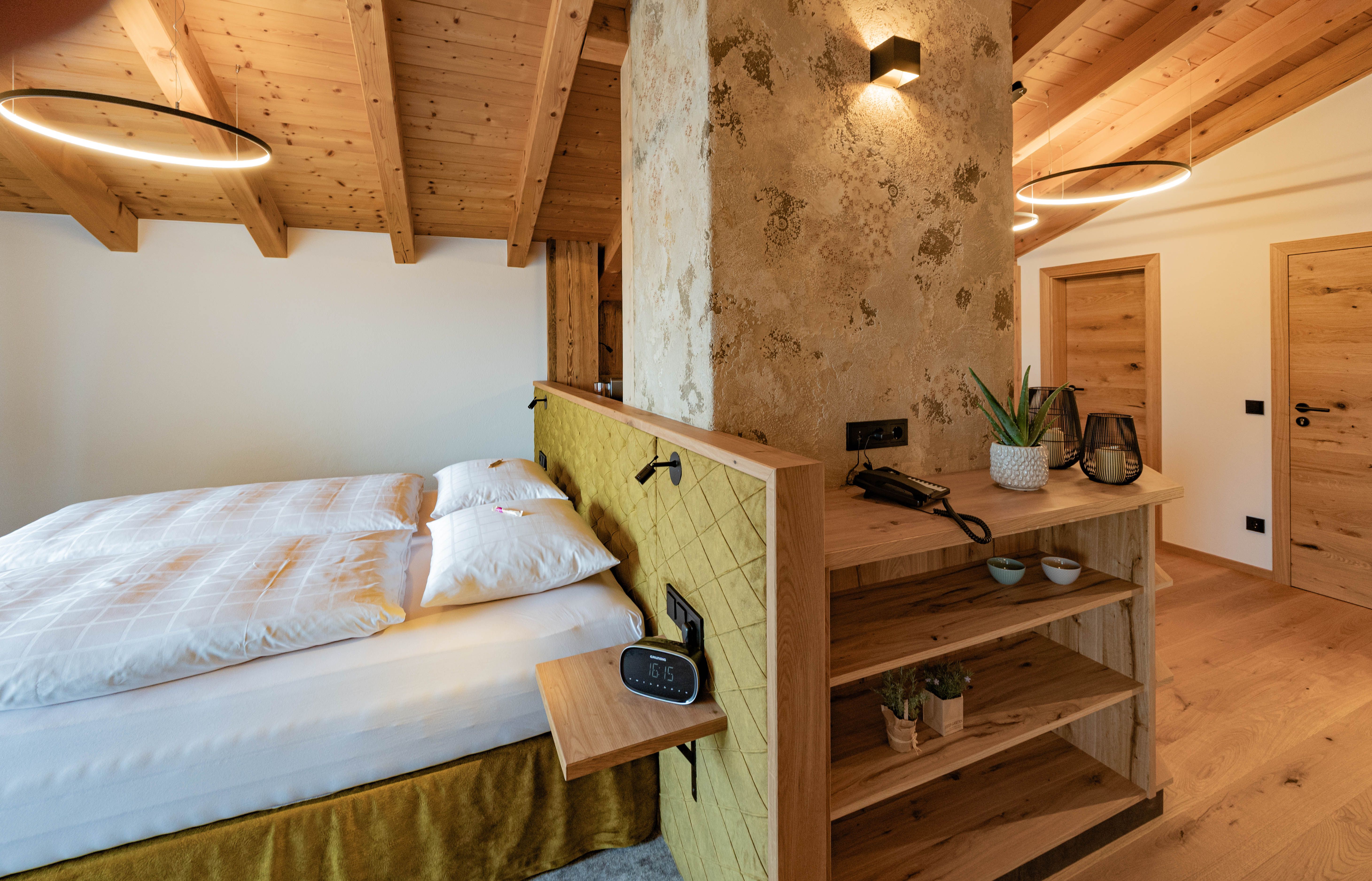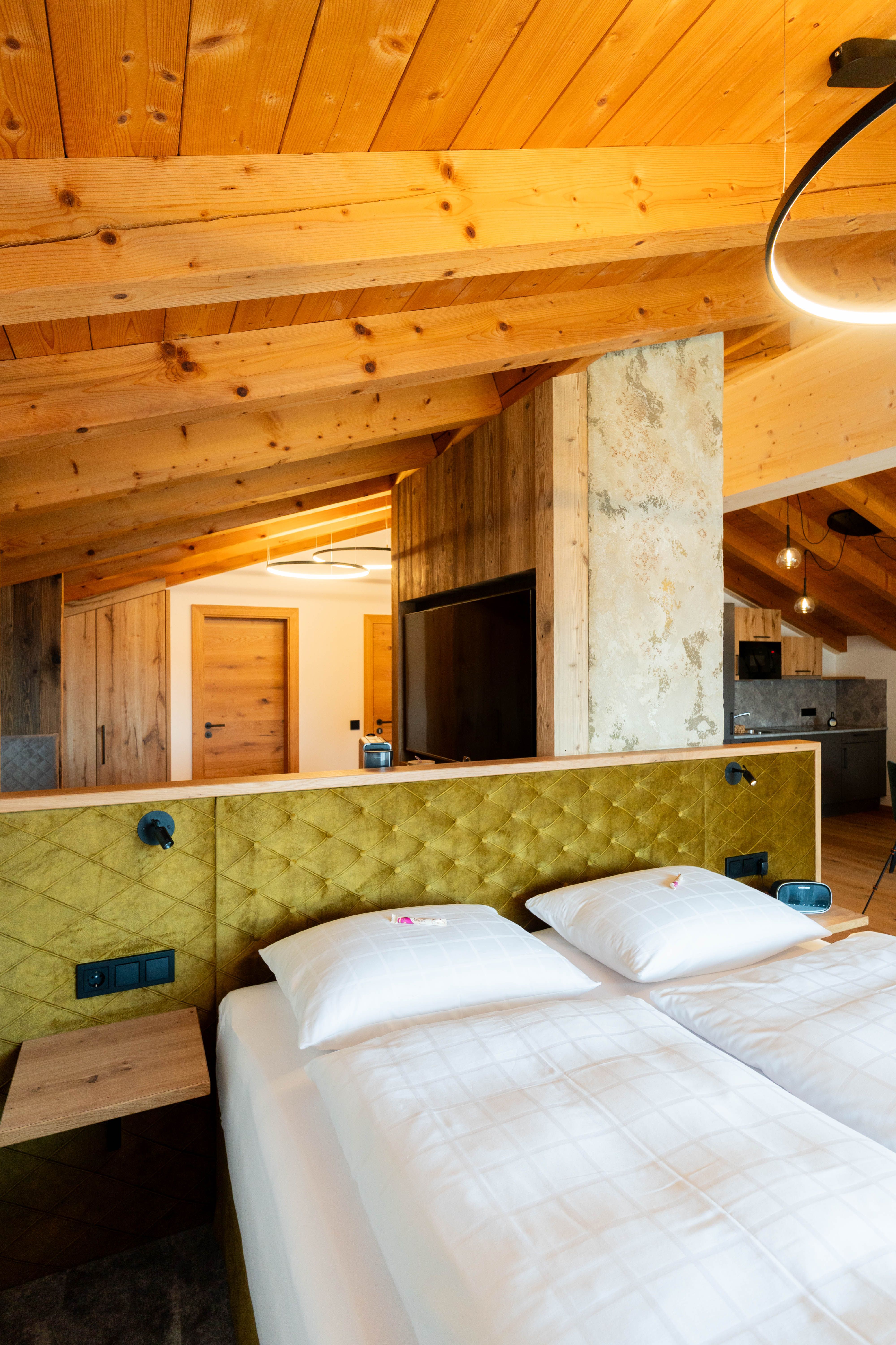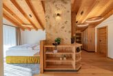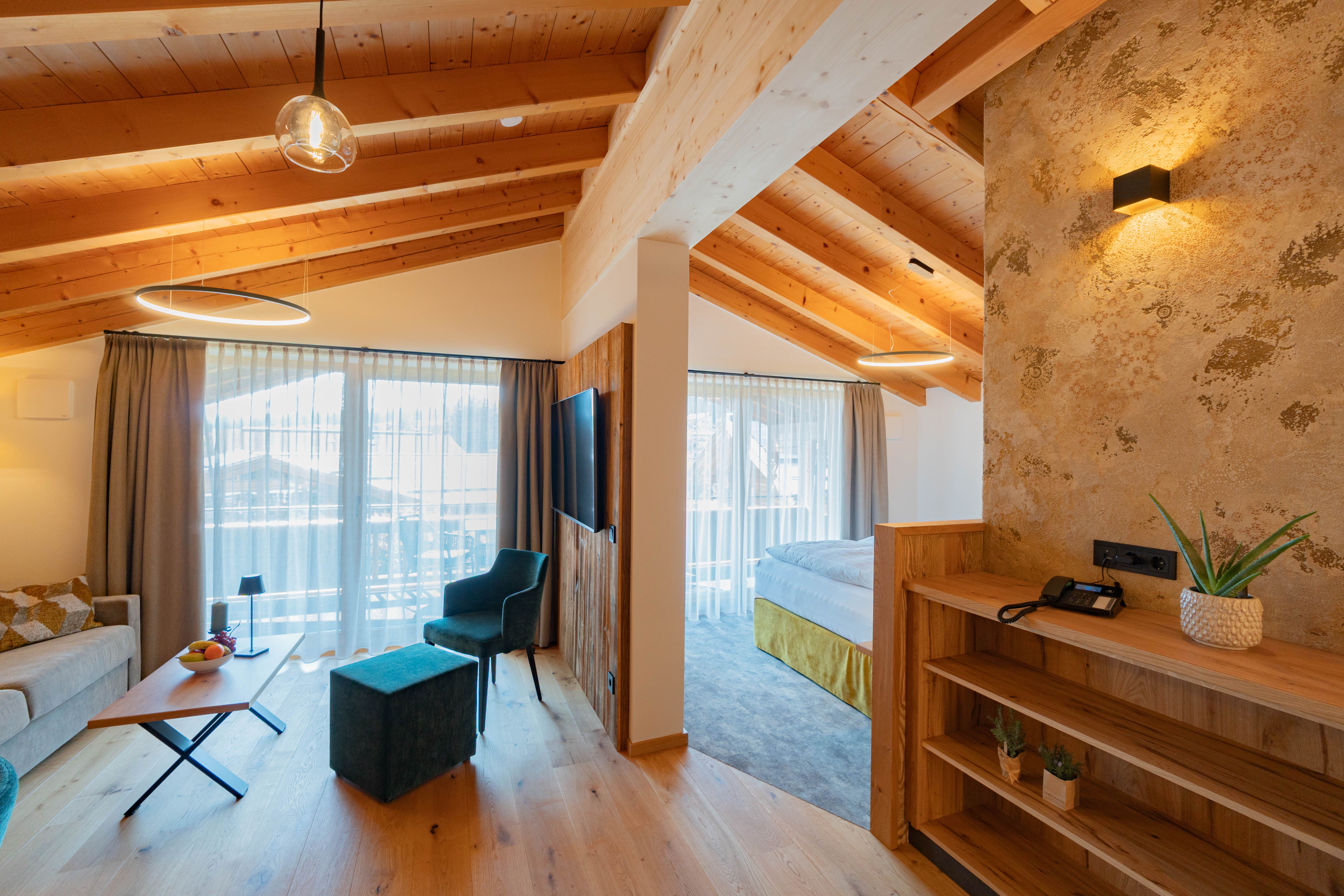 Einzigartig und mit einem atemberaubenden Blick auf die umliegende Bergkullisse begeistert unsere Dachgeschoss-Suite „Stoaadler“.