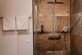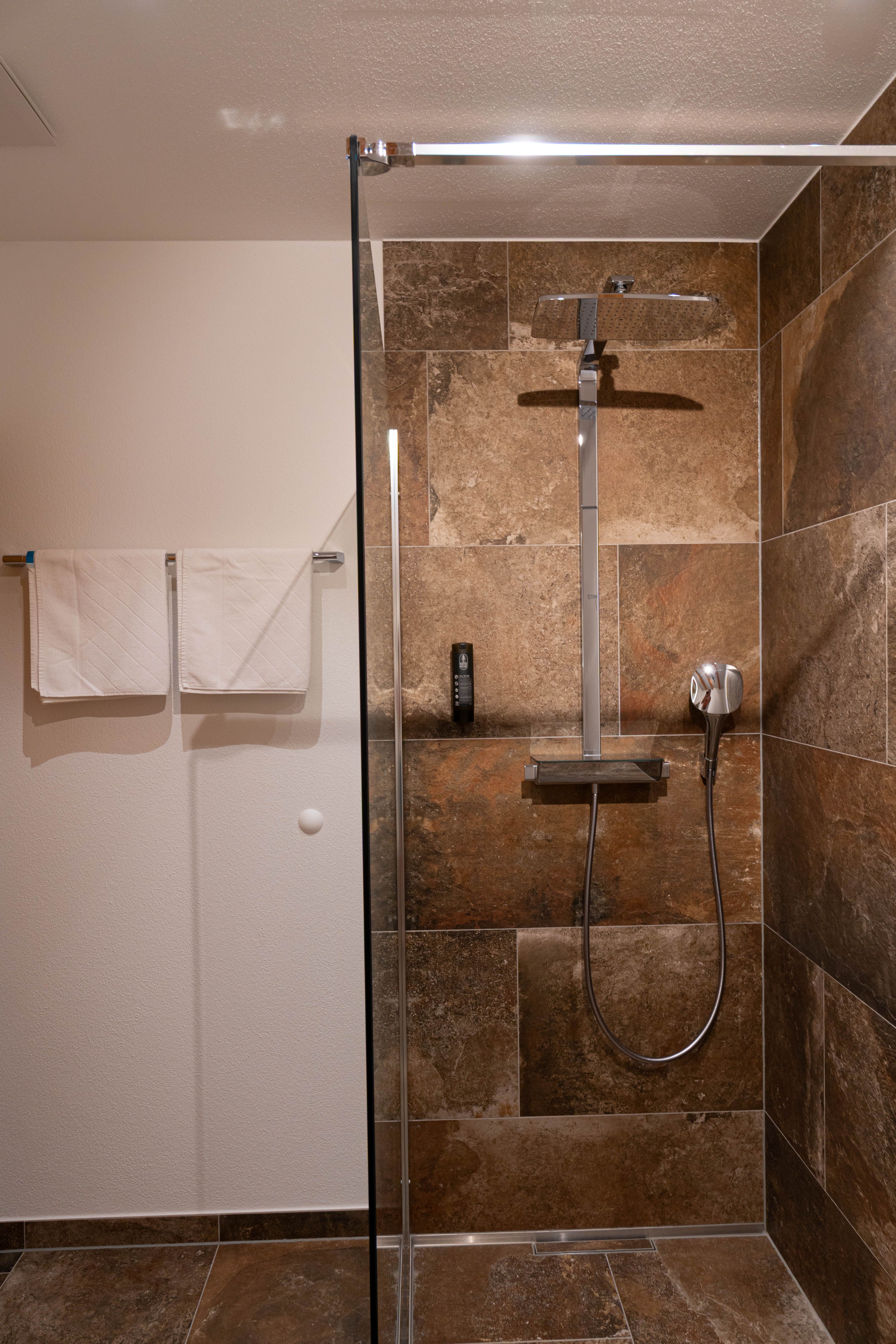 Das Badezimmer ist mit einer begehbaren Dusche und einem luxuriösen Raindance-Duschkopf ausgestattet – für ein echtes Wellness-Gefühl. Fön sowie weiche Hand- und Duschtücher stehen für Sie bereit.