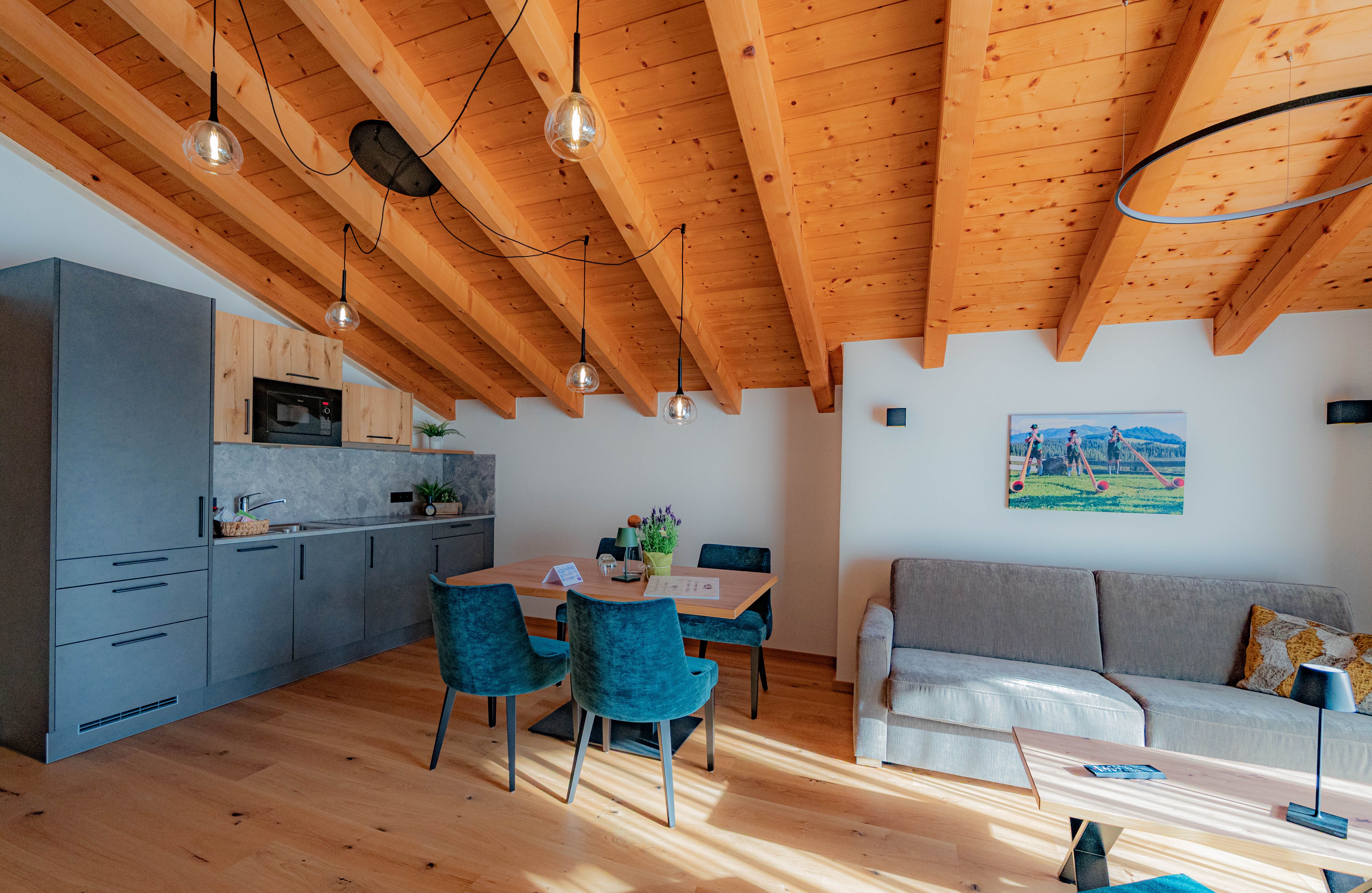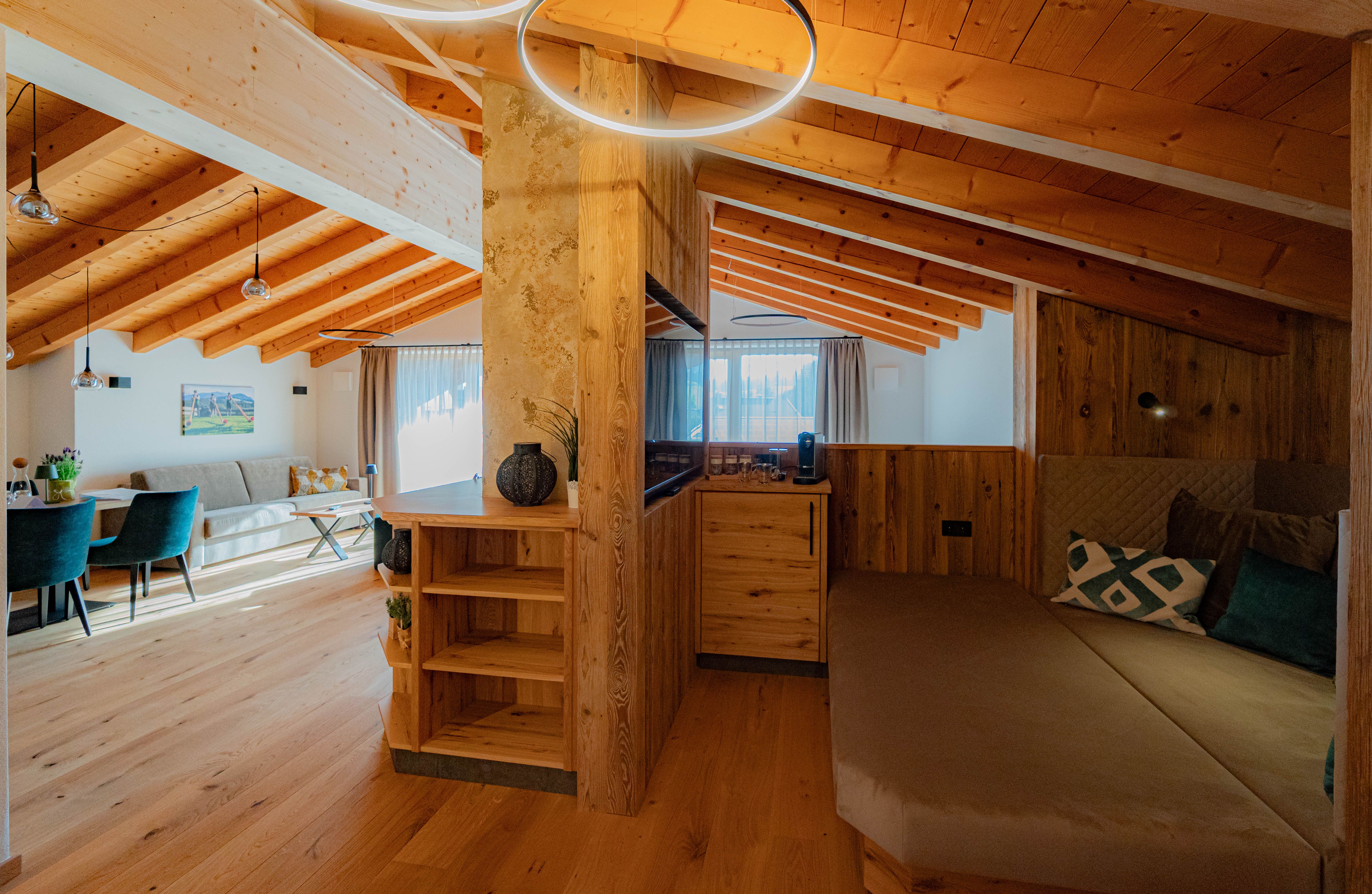 Stilvoll und mit viel Holz eingerichtet, sorgt diese Wohnung für ein behagliches Wohlfühlambiente.