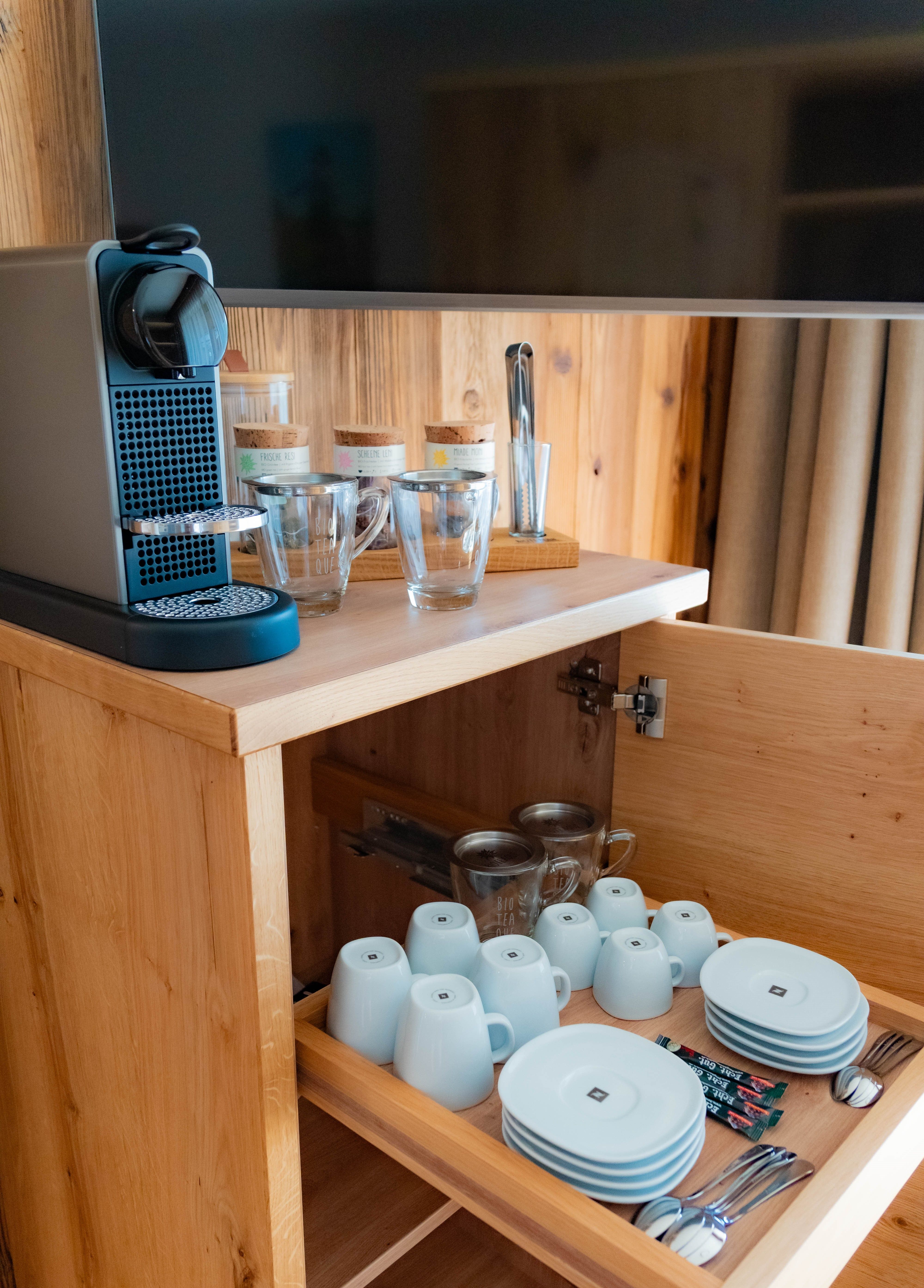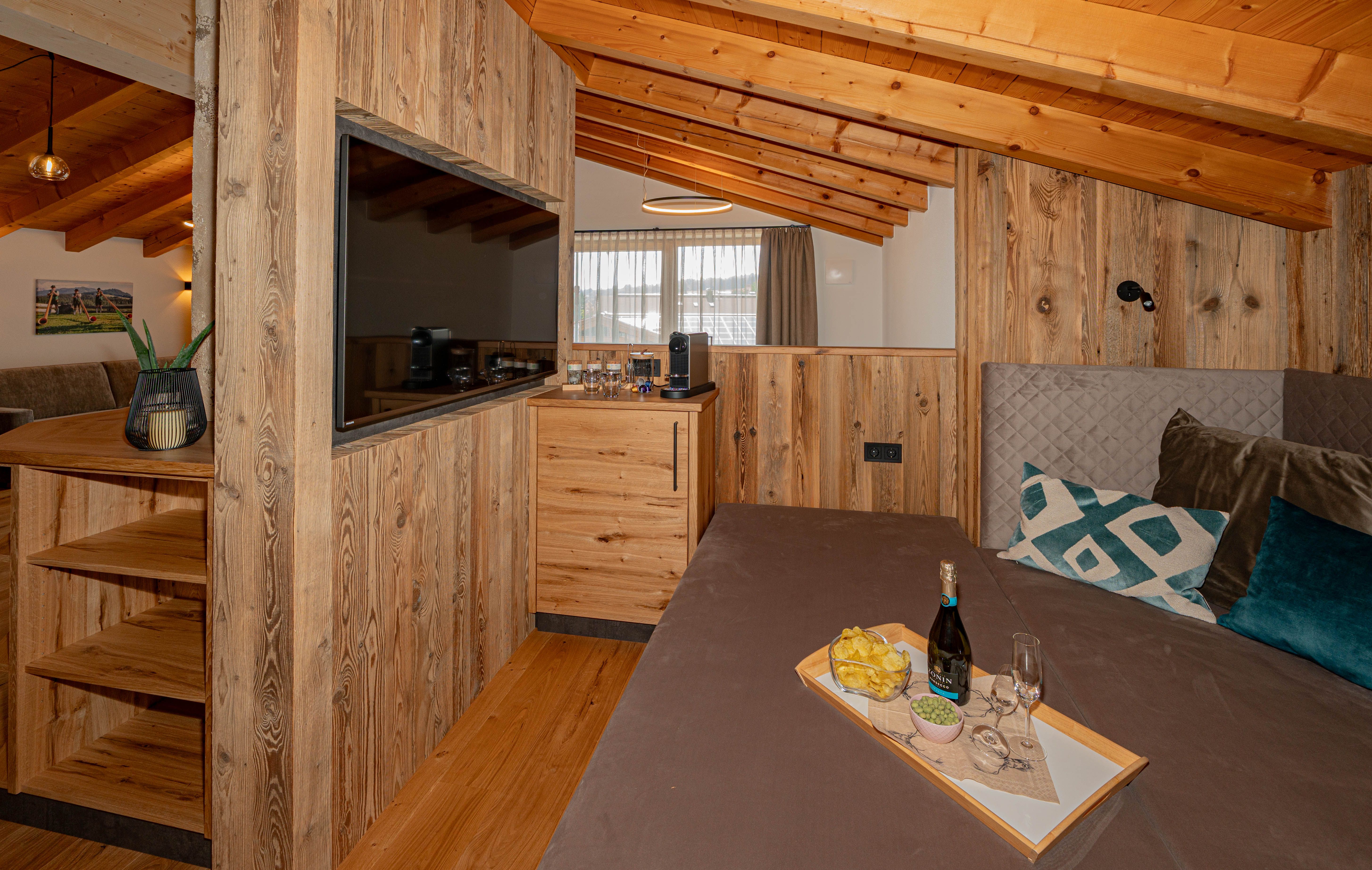 Die Kaffee- und Teebar mit Nespresso-Kapselmaschine neben der gemütlichen Kuschelecke, die eine großzügige Liegefläche und einen großen LED-Smart-TV bietet – lädt zu entspannten Stunden nach einem Tag in den Bergen ein.