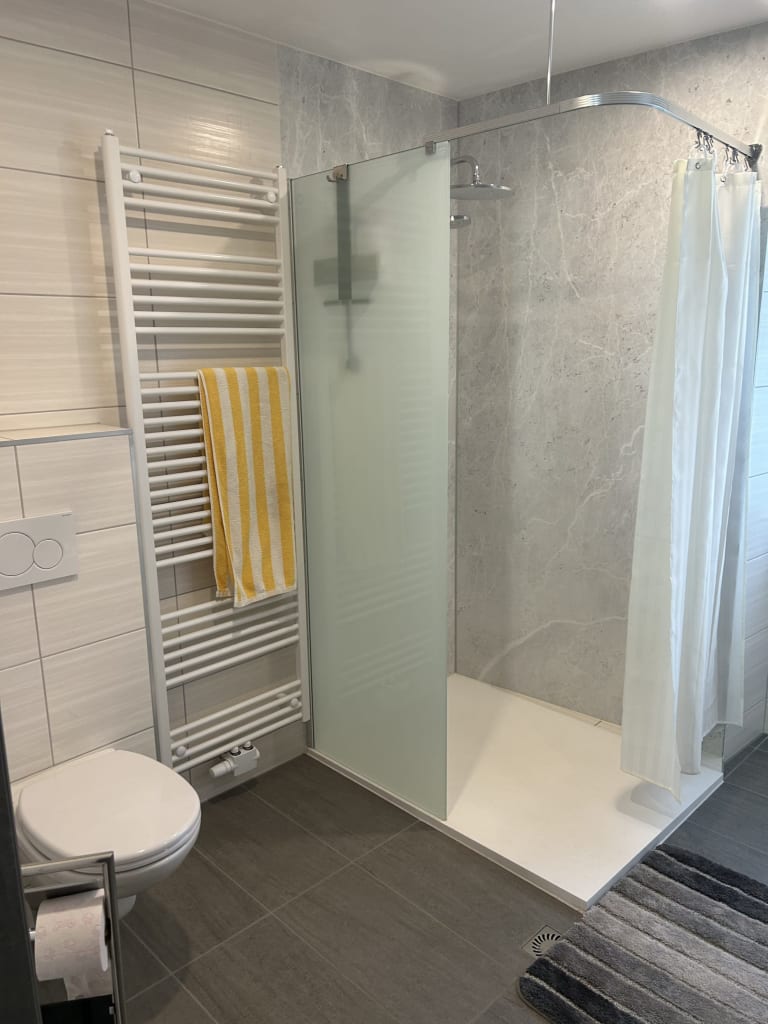 Im Vorraum befindet sich eine Waschmaschine, die ebenso gerne genutzt werden darf. Das große Badezimmer ist mit einer barrierefreien Dusche und einem WC ausgestattet.