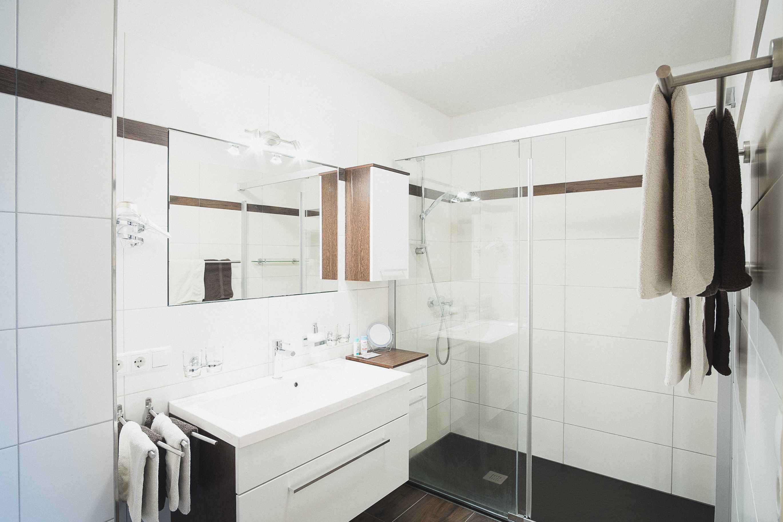 • Großes Badezimmer mit Dusche, WC, großes Waschbecken und Badschrank