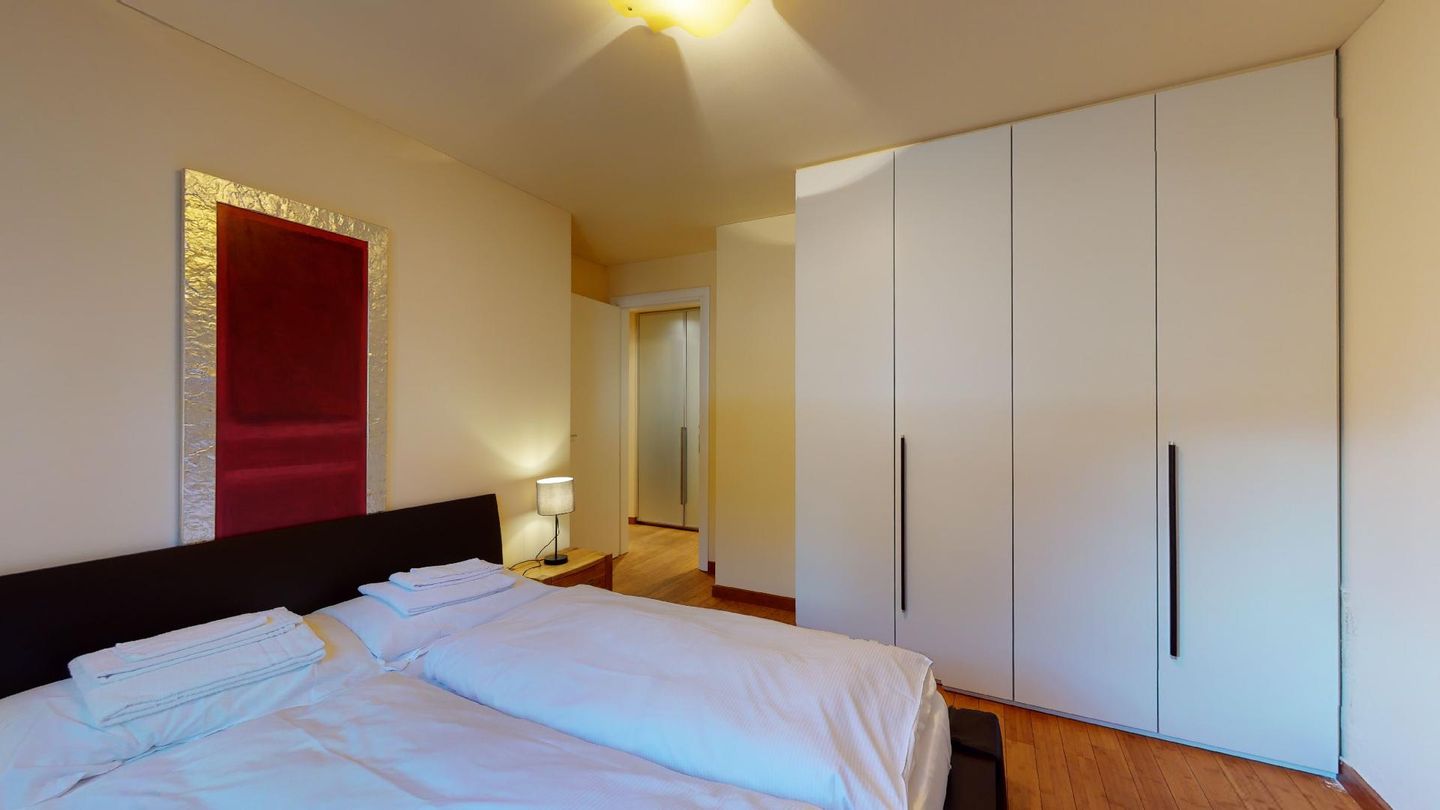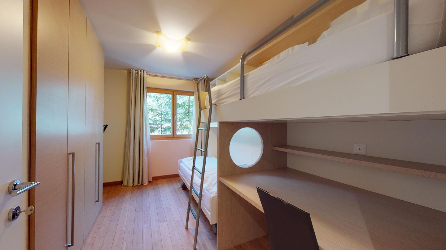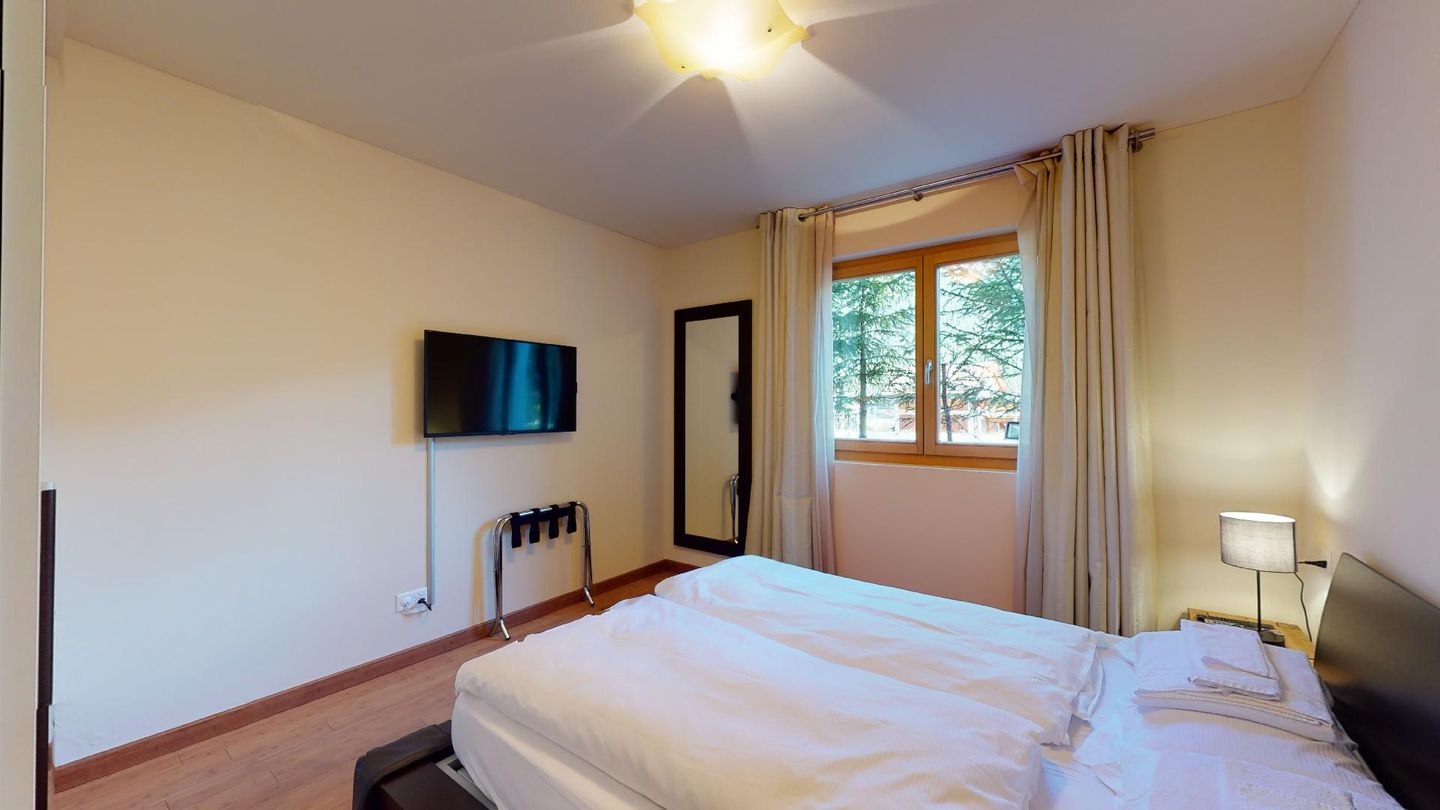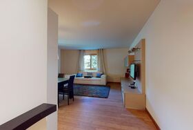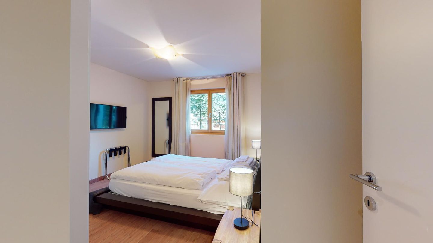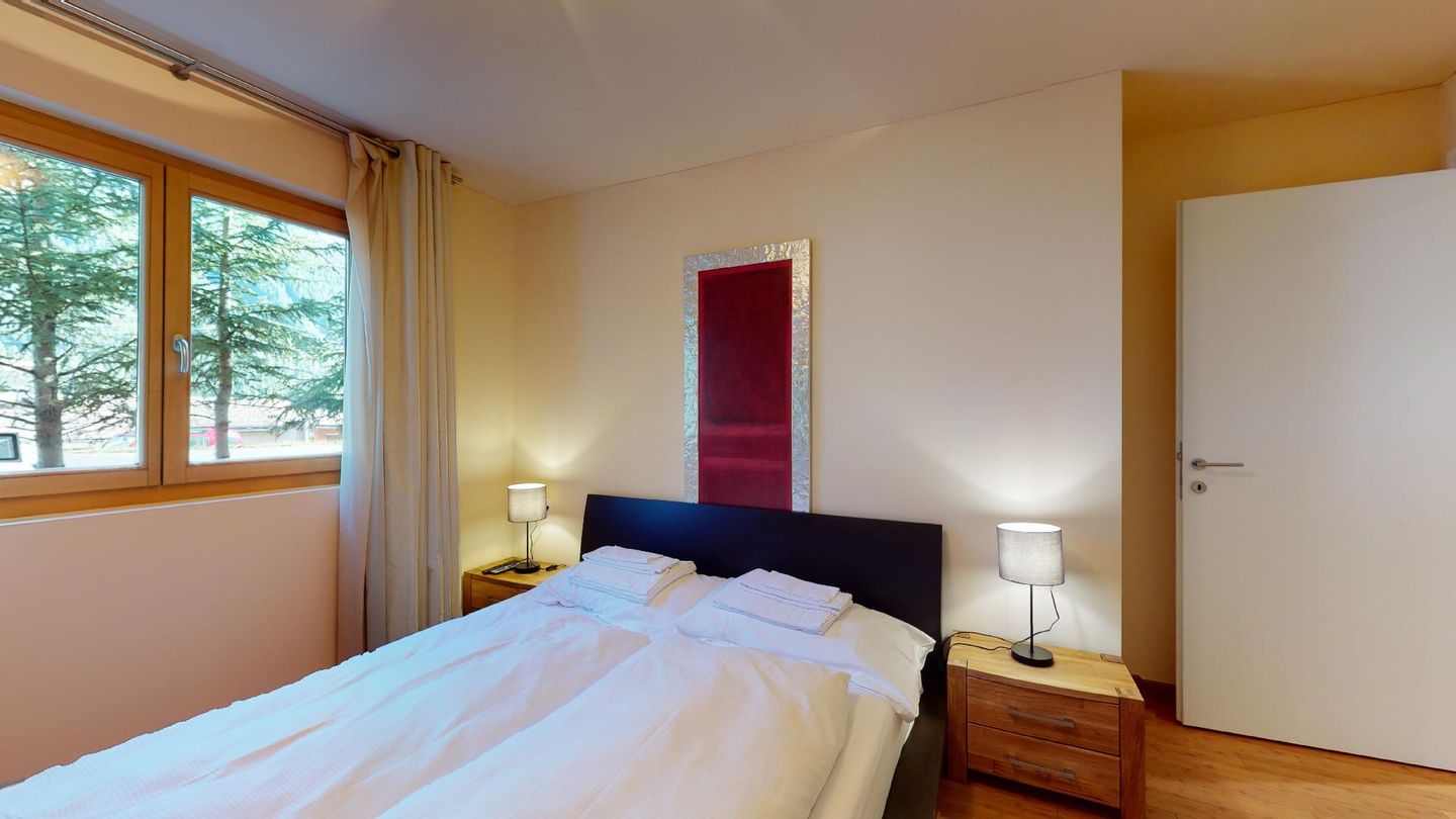 Moderne 3½ Zimmerwohnung im Erdgeschoss, ca. 66m² gross. Eingang mit Garderobe. Offenes Wohn- und Esszimmer mit Küchenzeile. Esstisch mit sechs Stühlen, zwei Sofas, Smart-TV und Terrasse. Küche mit Herd, Ofen, Kühlschrank und Geschirrspüler. Ein Doppelzimmer mit Smart-TV. Ein Zimmer mit einem Einzelbett und einem Hochbett. Badezimmer mit Wanne, Lavabo, Toilette und Bidet. WLAN. Gemeinsamer Ski- und Veloraum, sowie Waschmaschine im Untergeschoss. 1 Parkplatz in der Tiefgarage (Höhe max. 210 cm).