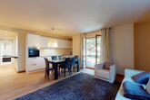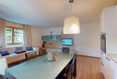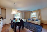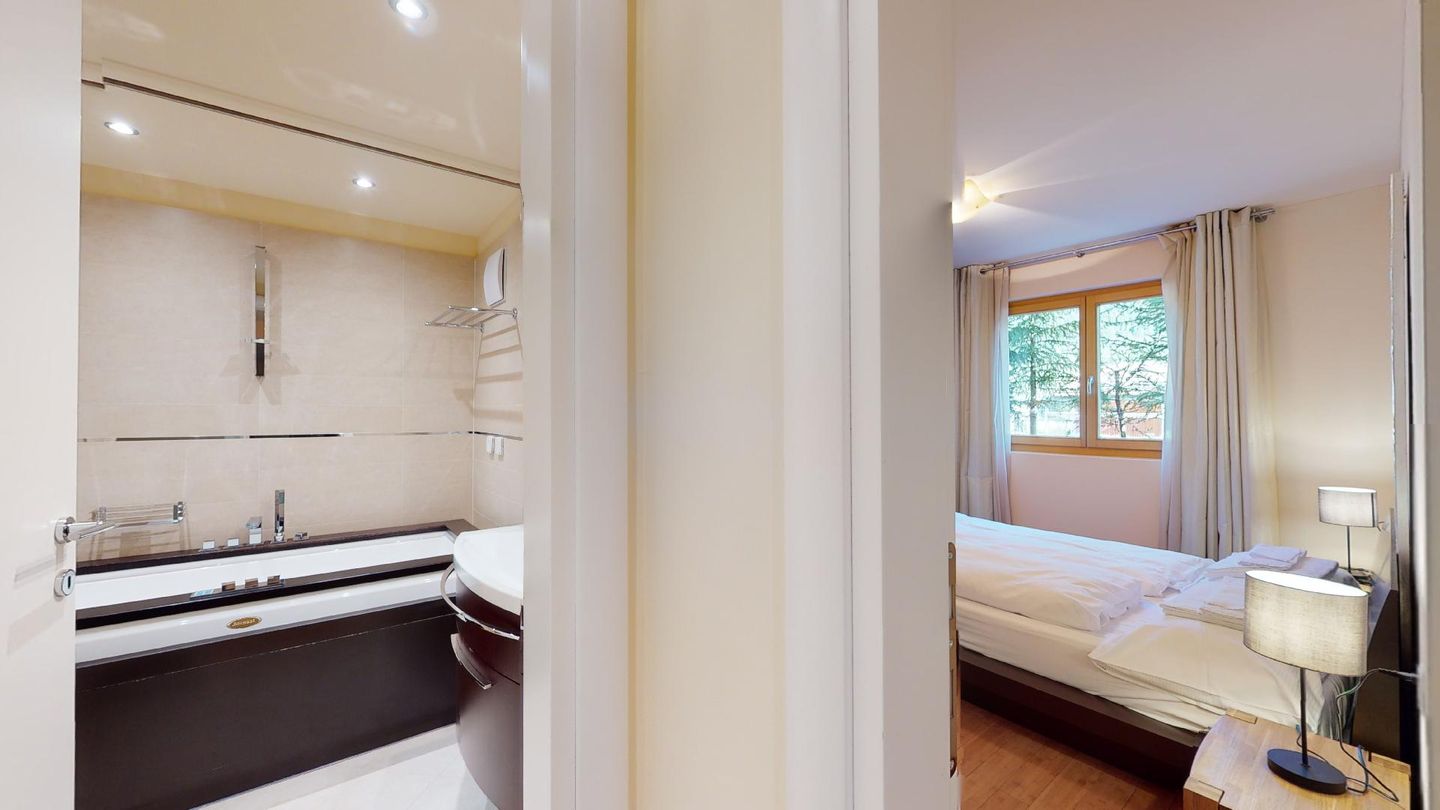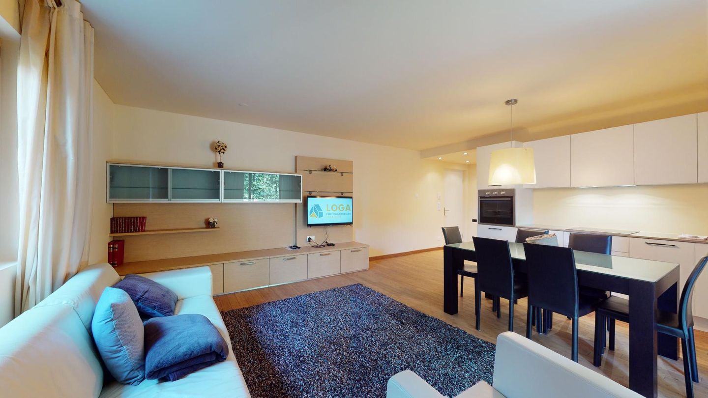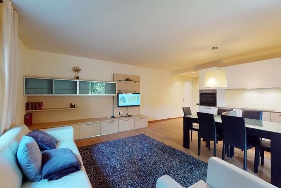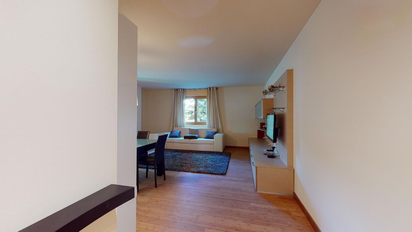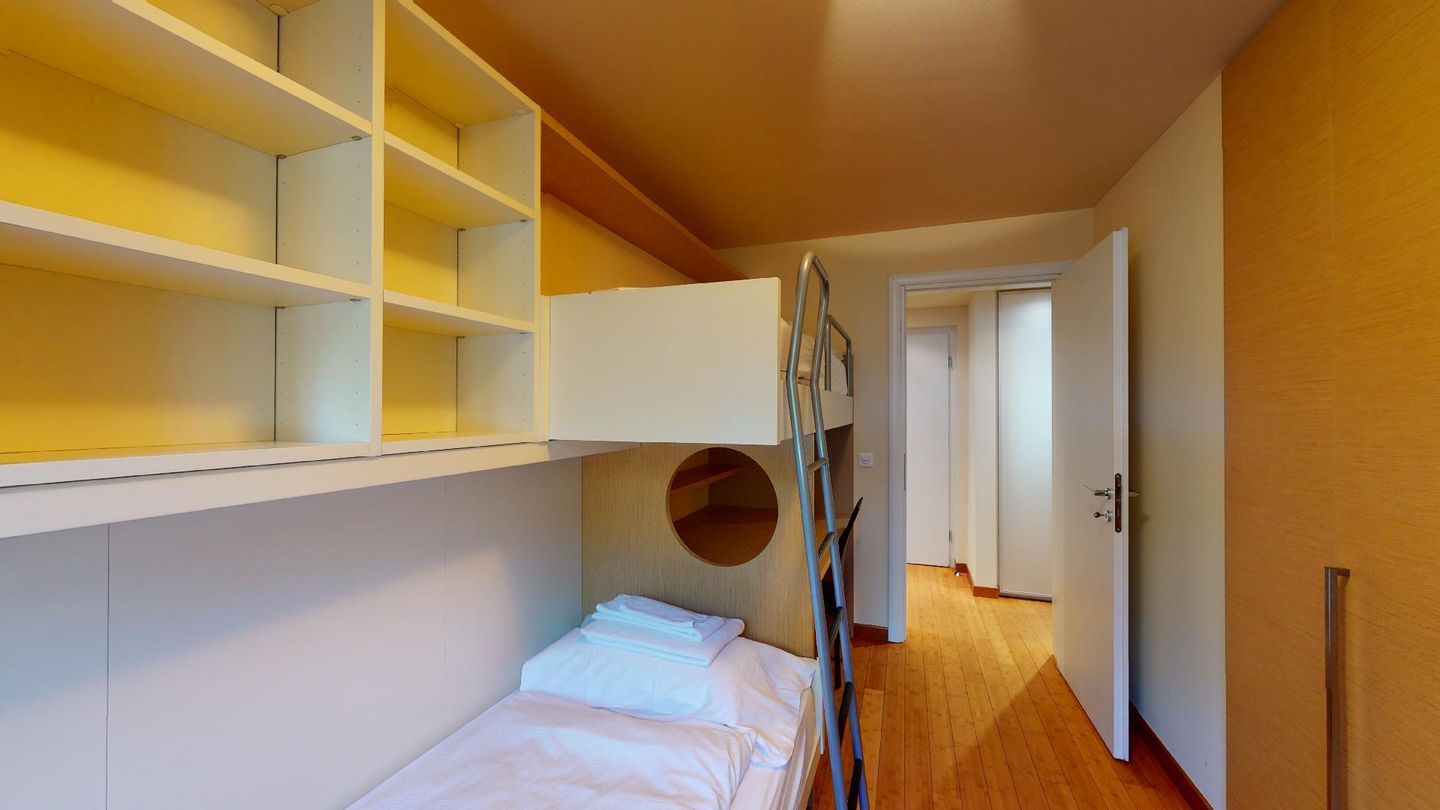 Moderne 3½ Zimmerwohnung im Erdgeschoss, ca. 66m² gross. Eingang mit Garderobe. Offenes Wohn- und Esszimmer mit Küchenzeile. Esstisch mit sechs Stühlen, zwei Sofas, Smart-TV und Terrasse. Küche mit Herd, Ofen, Kühlschrank und Geschirrspüler. Ein Doppelzimmer mit Smart-TV. Ein Zimmer mit einem Einzelbett und einem Hochbett. Badezimmer mit Wanne, Lavabo, Toilette und Bidet. WLAN. Gemeinsamer Ski- und Veloraum, sowie Waschmaschine im Untergeschoss. 1 Parkplatz in der Tiefgarage (Höhe max. 210 cm).