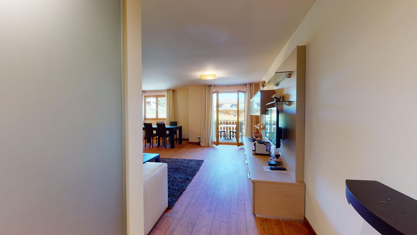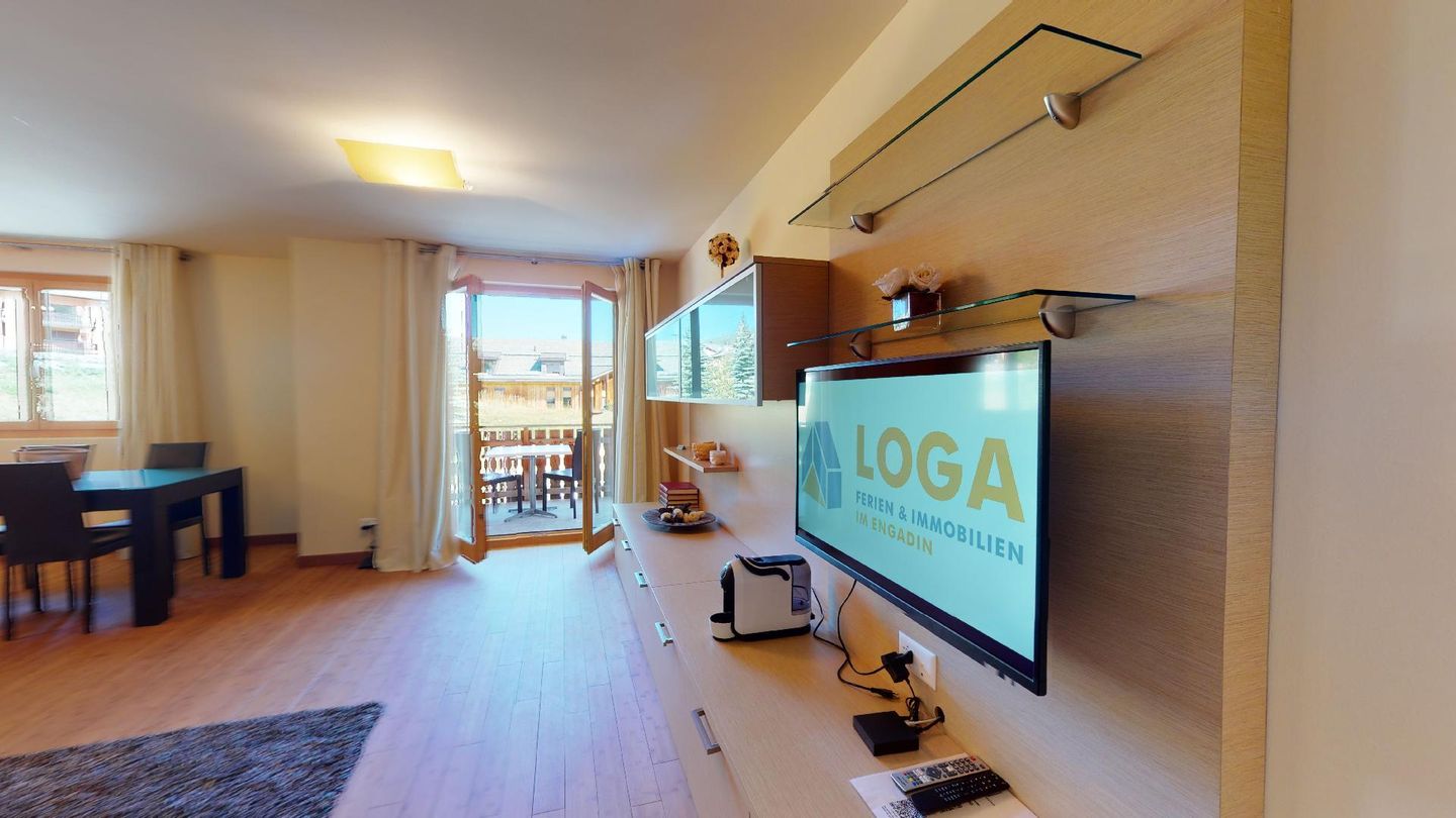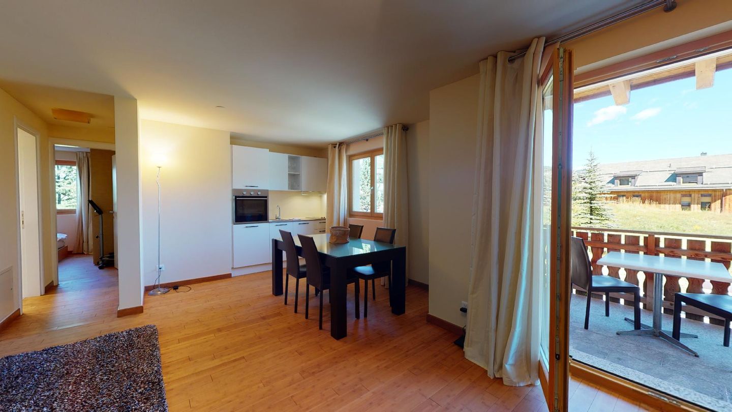 Moderne 3½ Zimmerwohnung im 1. Stock, ca. 68m² gross. Eingang mit Garderobe. Offenes Wohn- und Esszimmer mit Küchenzeile. Esstisch mit vier Stühlen, Sofa, Smart-TV und Balkon. Küche mit Herd, Ofen, Kühlschrank und Geschirrspüler. Ein Doppelzimmer mit Smart-TV. Ein Zimmer mit zwei Einzelbetten. Badezimmer mit Wanne, Lavabo, Toilette und Bidet. WLAN. Gemeinsamer Ski- und Veloraum, sowie Waschmaschine im Untergeschoss. 1 Parkplatz in der Tiefgarage (Höhe max. 210 cm).