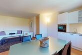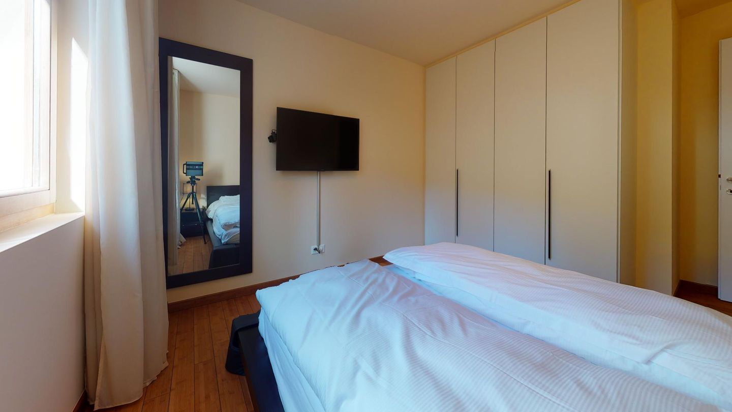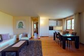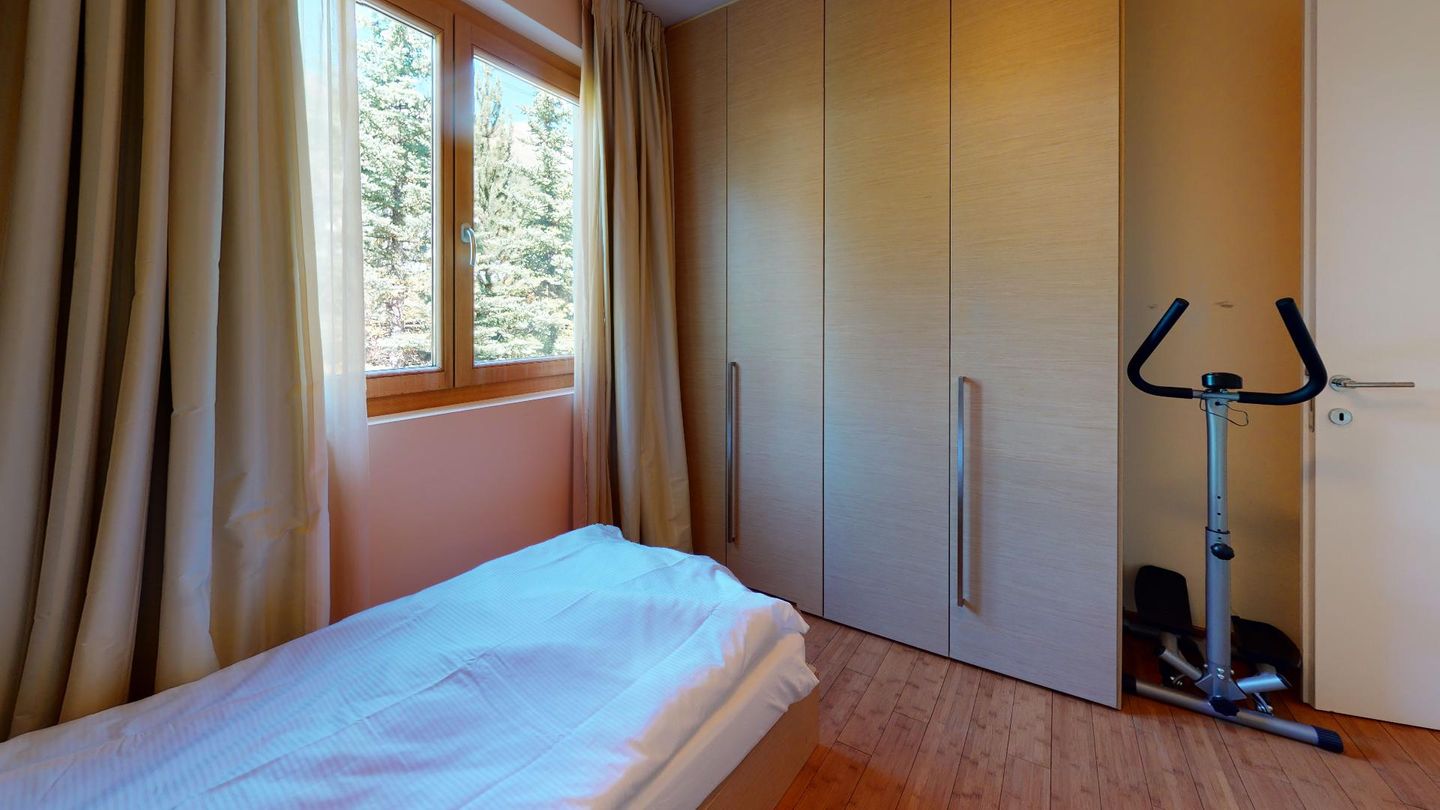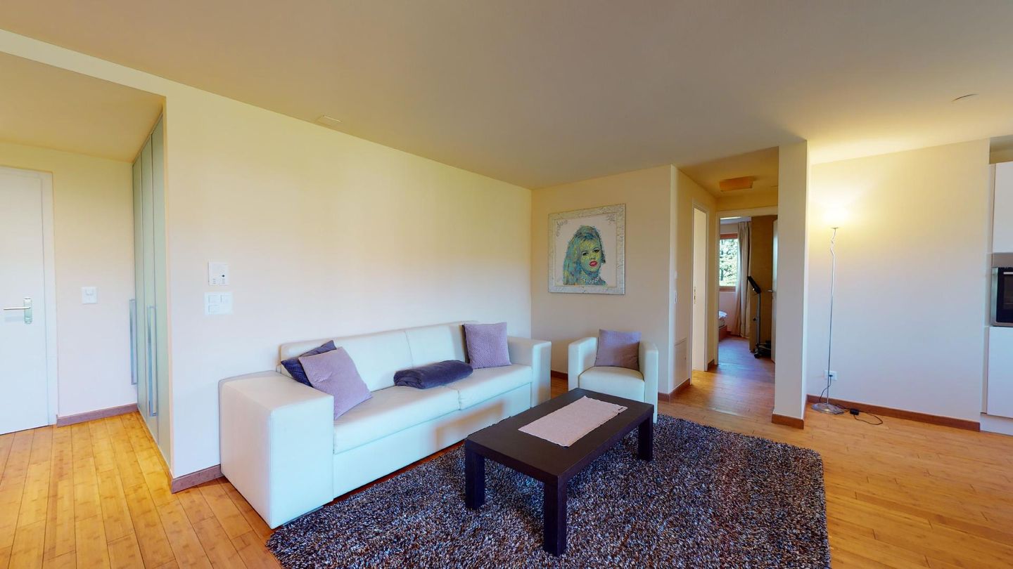 Moderne 3½ Zimmerwohnung im 1. Stock, ca. 68m² gross. Eingang mit Garderobe. Offenes Wohn- und Esszimmer mit Küchenzeile. Esstisch mit vier Stühlen, Sofa, Smart-TV und Balkon. Küche mit Herd, Ofen, Kühlschrank und Geschirrspüler. Ein Doppelzimmer mit Smart-TV. Ein Zimmer mit zwei Einzelbetten. Badezimmer mit Wanne, Lavabo, Toilette und Bidet. WLAN. Gemeinsamer Ski- und Veloraum, sowie Waschmaschine im Untergeschoss. 1 Parkplatz in der Tiefgarage (Höhe max. 210 cm).