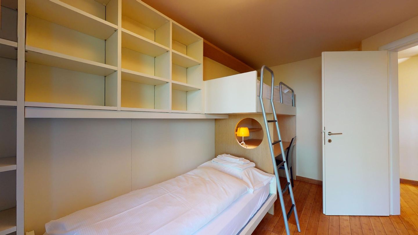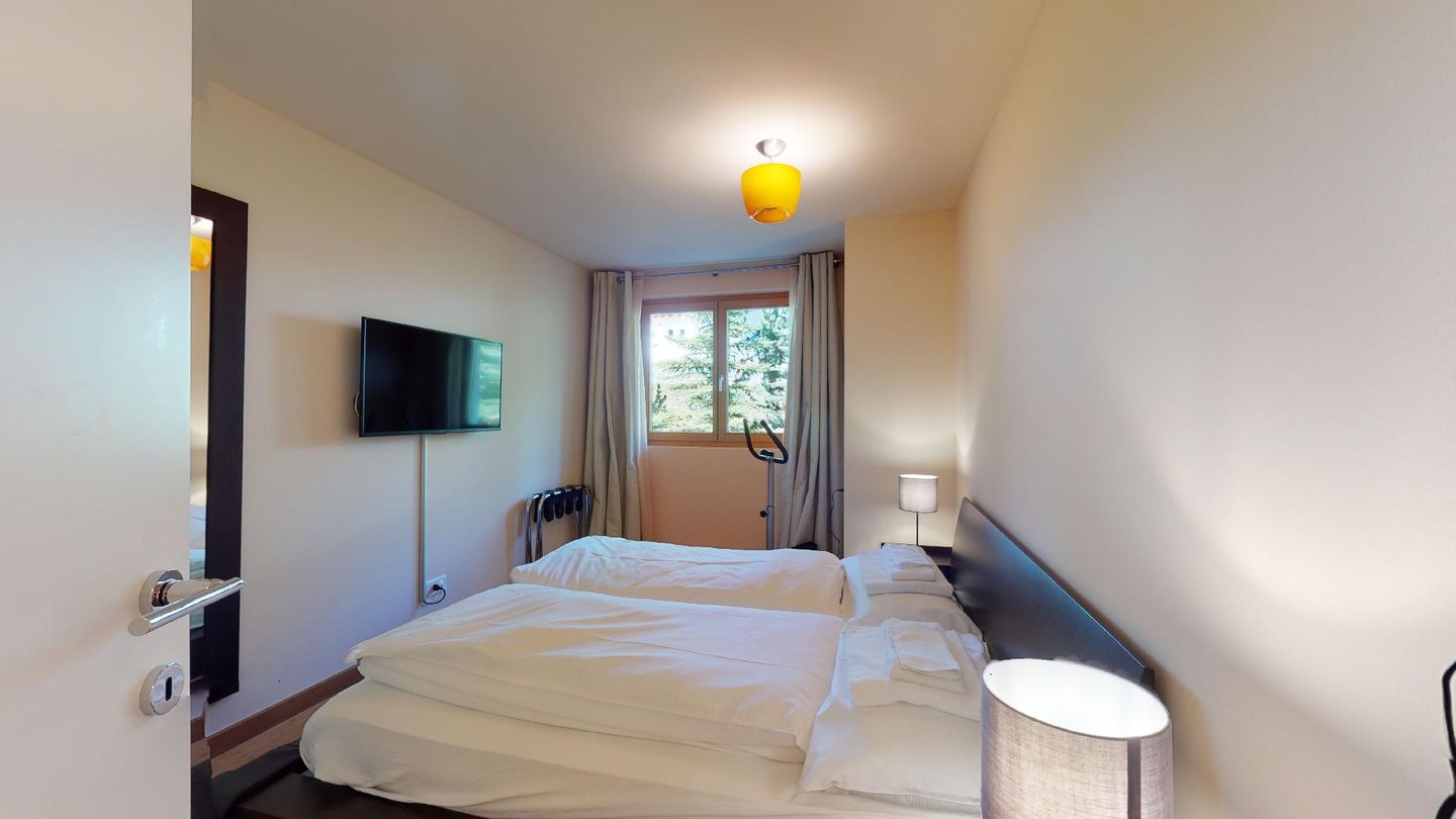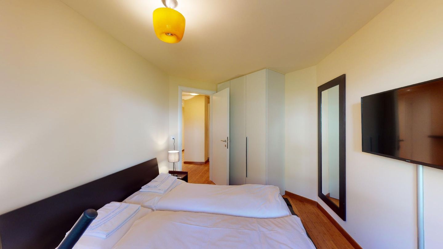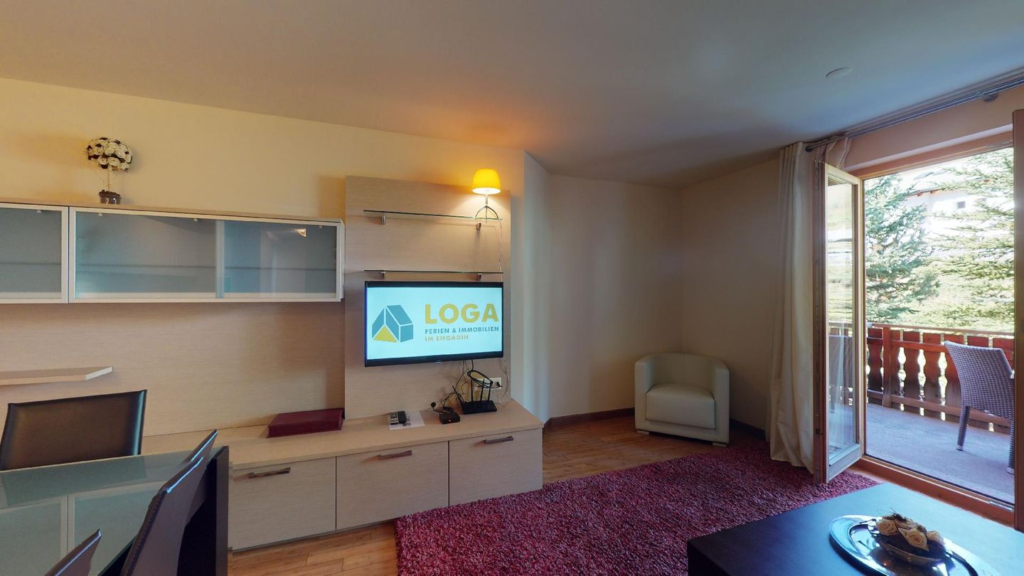 Moderne 3½ Zimmerwohnung im 1. Stock, ca. 66m² gross. Eingang mit Garderobe. Offenes Wohn- und Esszimmer mit Küchenzeile. Esstisch mit sechs Stühlen, ein Sofa, Smart-TV und Balkon. Küche mit Herd, Ofen, Kühlschrank und Geschirrspüler. Ein Doppelzimmer mit Smart-TV. Ein Zimmer mit einem Einzelbett und einem Hochbett, Balkon. Badezimmer mit Dusche, Lavabo, Toilette und Bidet. WLAN. Gemeinsamer Ski- und Veloraum, sowie Waschmaschine im Untergeschoss. 1 Parkplatz in der Tiefgarage (Höhe max. 210 cm).