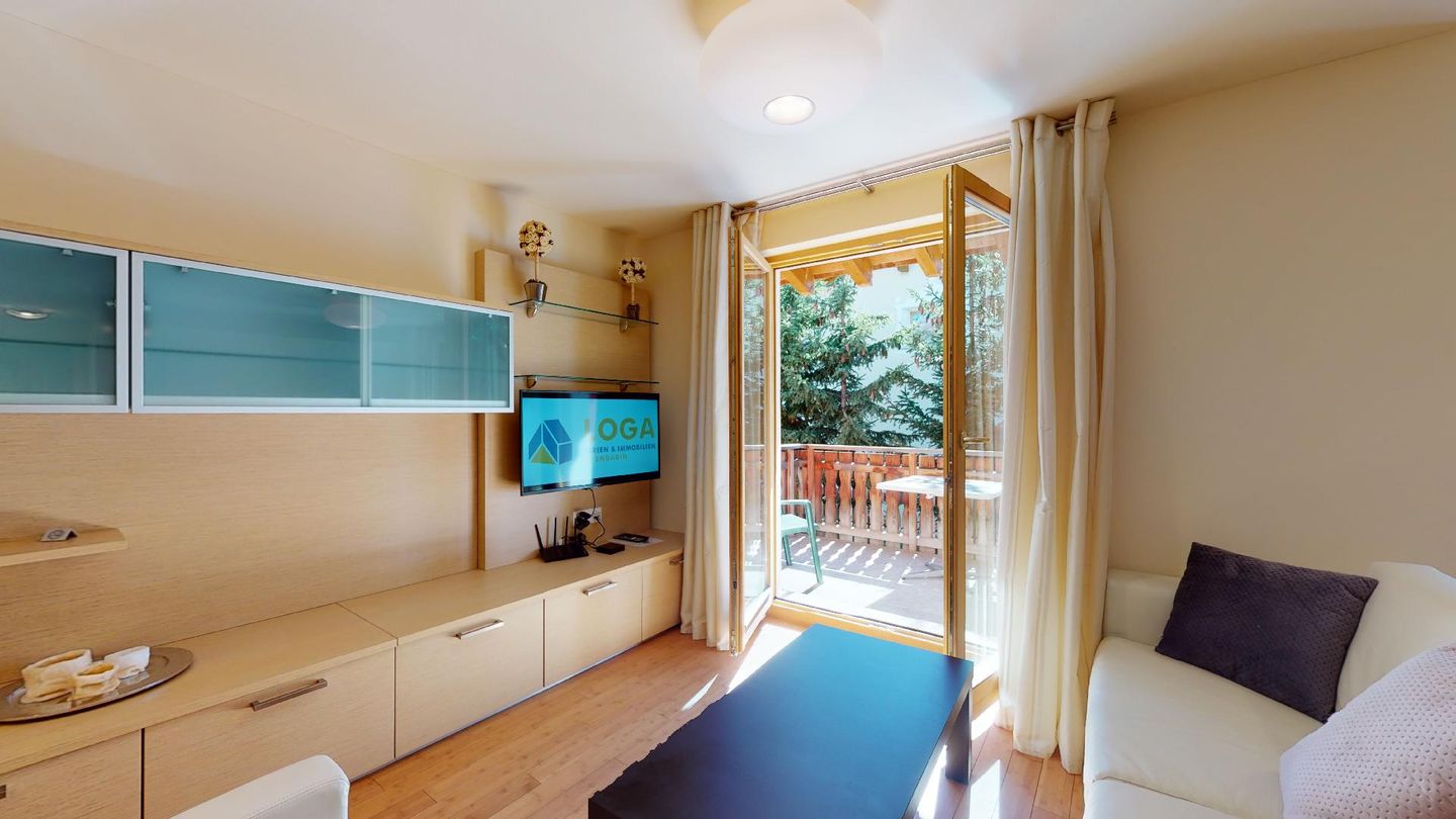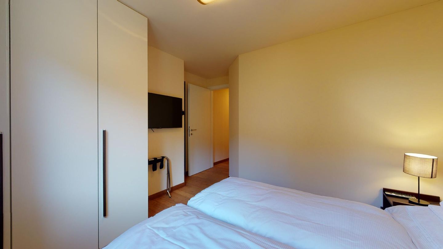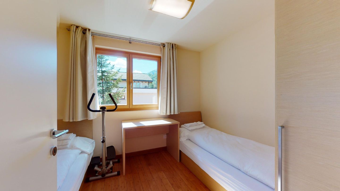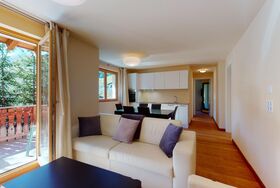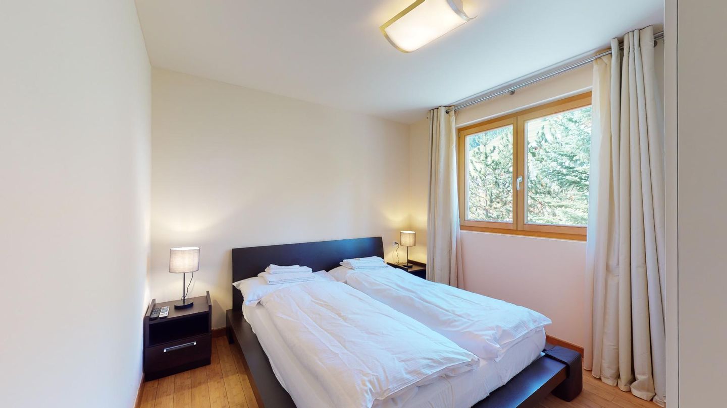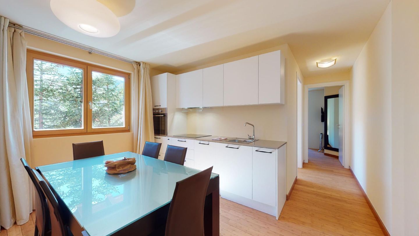 Moderne 3½ Zimmerwohnung im 1. Stock, ca. 59m² gross. Eingang mit Garderobe. Offenes Wohn- und Esszimmer mit Küchenzeile. Esstisch mit sechs Stühlen, ein Sofa, Smart-TV und Terrasse. Küche mit Herd, Ofen, Kühlschrank und Geschirrspüler. Ein Doppelzimmer mit Smart-TV. Ein Zimmer mit zwei Einzelbetten. Badezimmer mit Wanne, Lavabo, Toilette und Bidet. WLAN. Gemeinsamer Ski- und Veloraum, sowie Waschmaschine im Untergeschoss. 1 Parkplatz in der Tiefgarage (Höhe max. 210 cm).