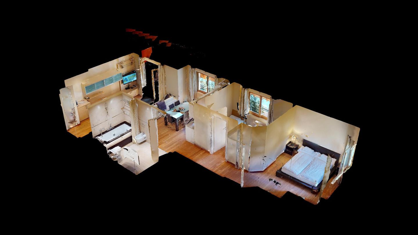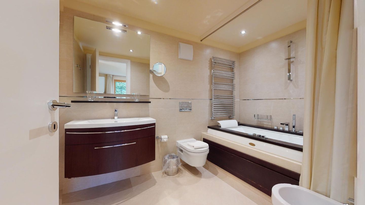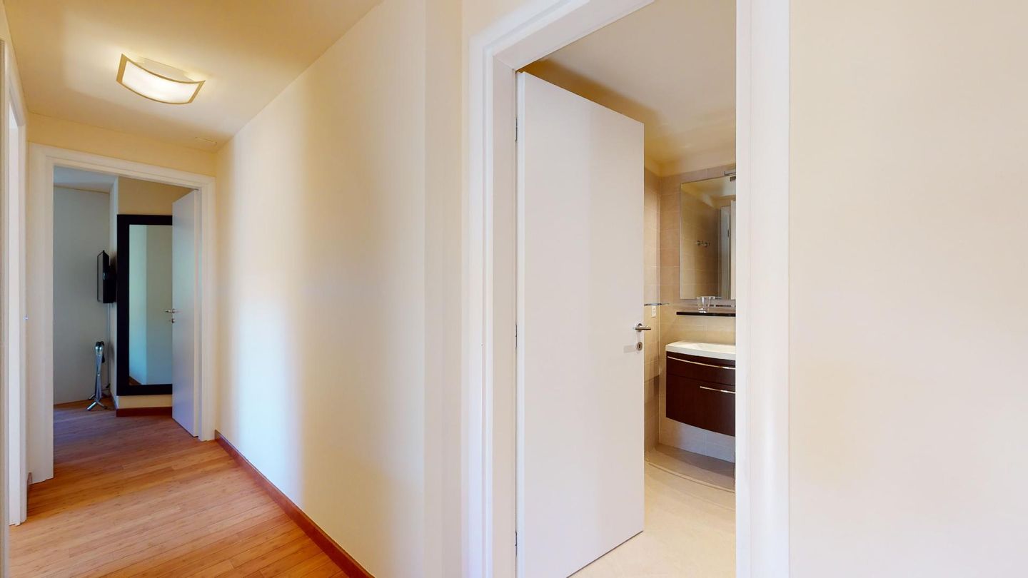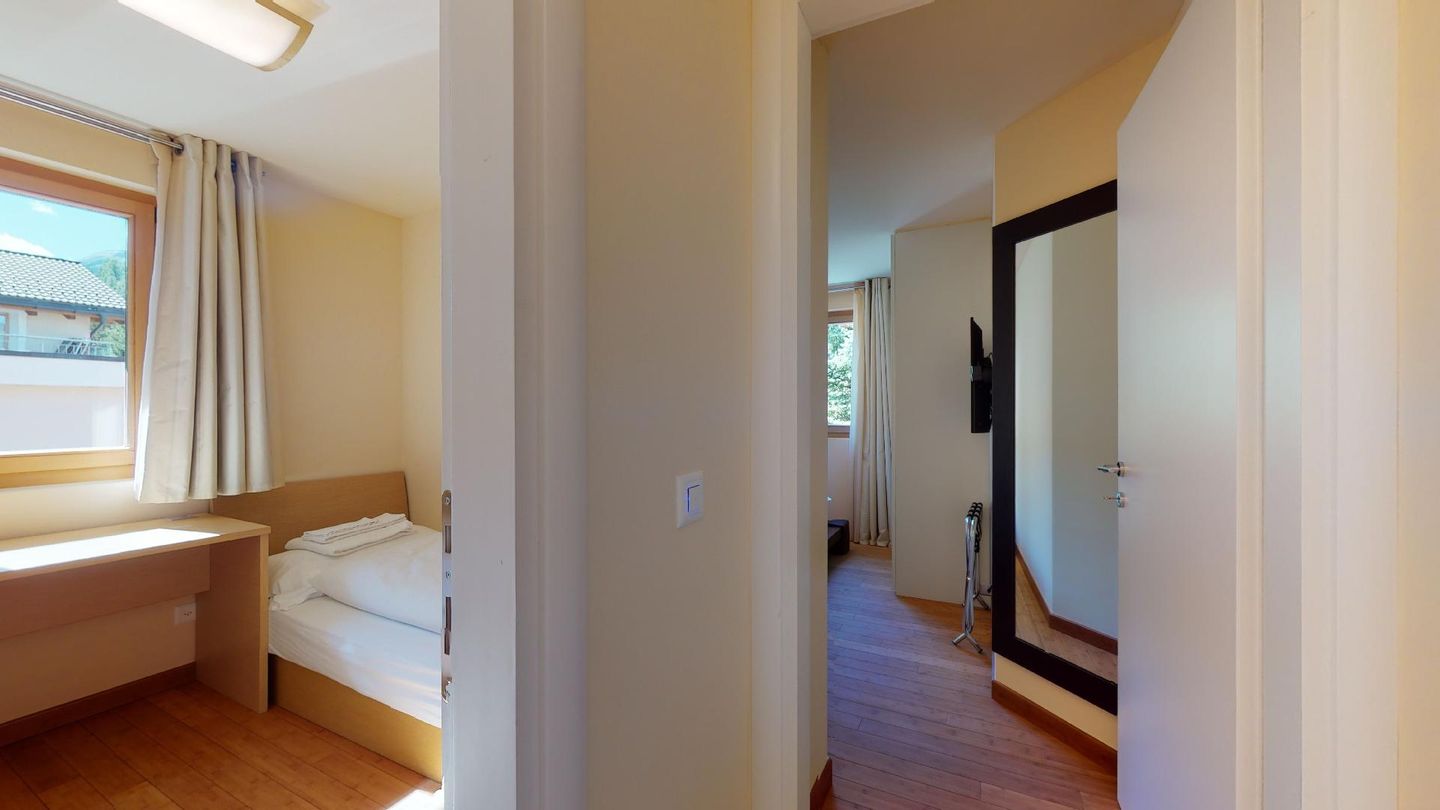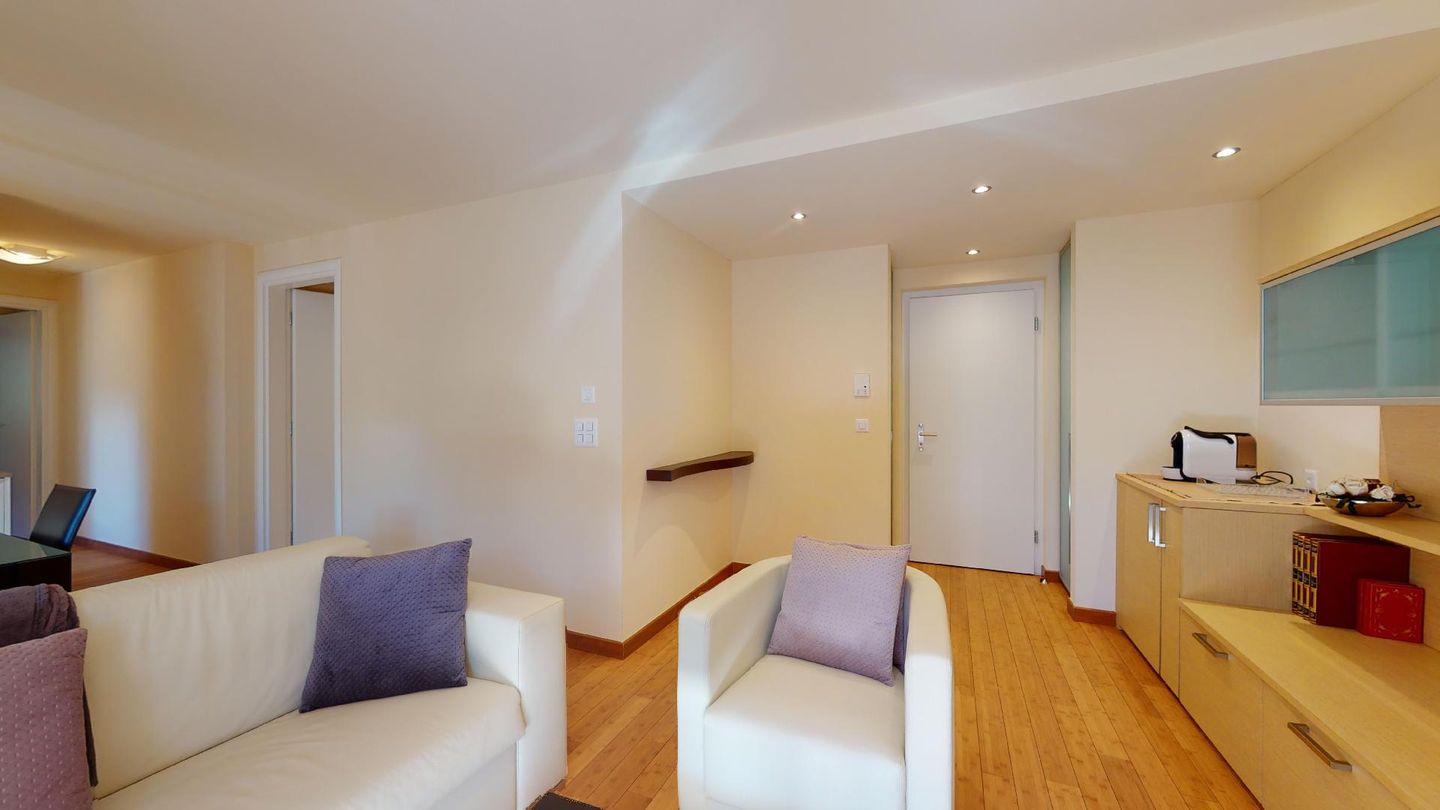 Moderne 3½ Zimmerwohnung im 1. Stock, ca. 59m² gross. Eingang mit Garderobe. Offenes Wohn- und Esszimmer mit Küchenzeile. Esstisch mit sechs Stühlen, ein Sofa, Smart-TV und Terrasse. Küche mit Herd, Ofen, Kühlschrank und Geschirrspüler. Ein Doppelzimmer mit Smart-TV. Ein Zimmer mit zwei Einzelbetten. Badezimmer mit Wanne, Lavabo, Toilette und Bidet. WLAN. Gemeinsamer Ski- und Veloraum, sowie Waschmaschine im Untergeschoss. 1 Parkplatz in der Tiefgarage (Höhe max. 210 cm).