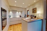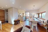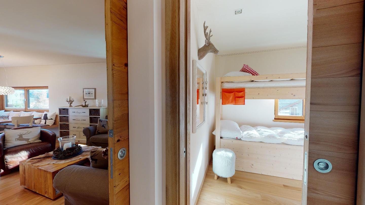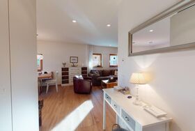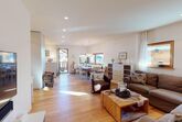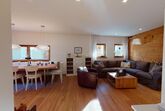 Im Wohnraum befinden sich ein grosszügiger Esstisch sowie eine gemütliche Sofa-Sitzecke mit TV (Swisscom-TV). Offenen, modern ausgestattete Küche und Zugangstür zur Terrasse mit Blick auf den Champférsee.