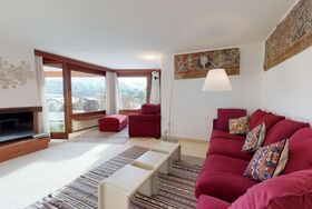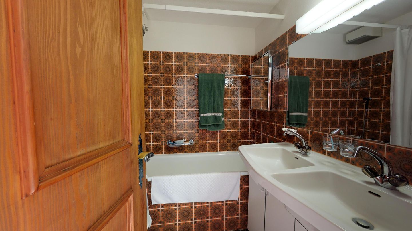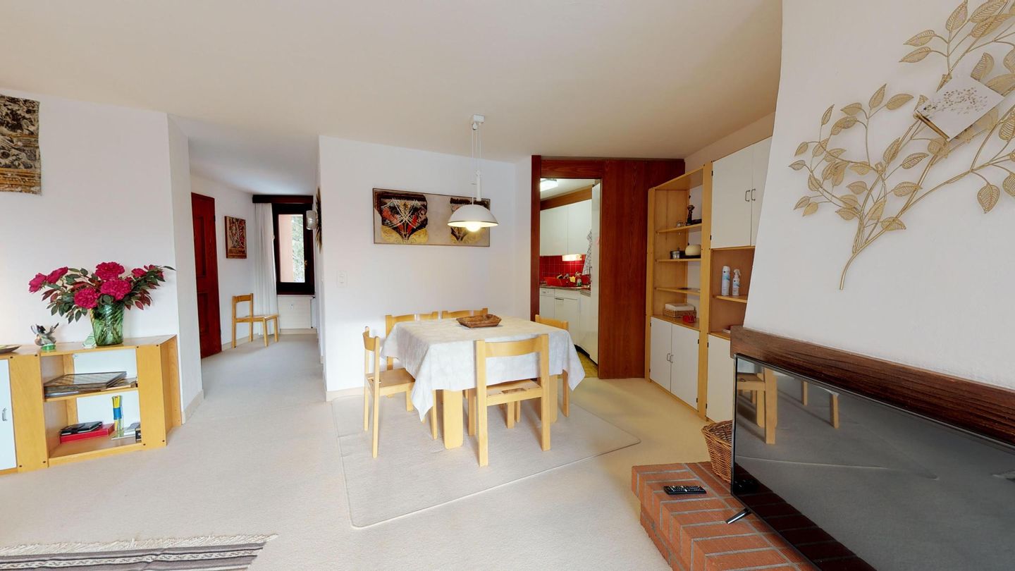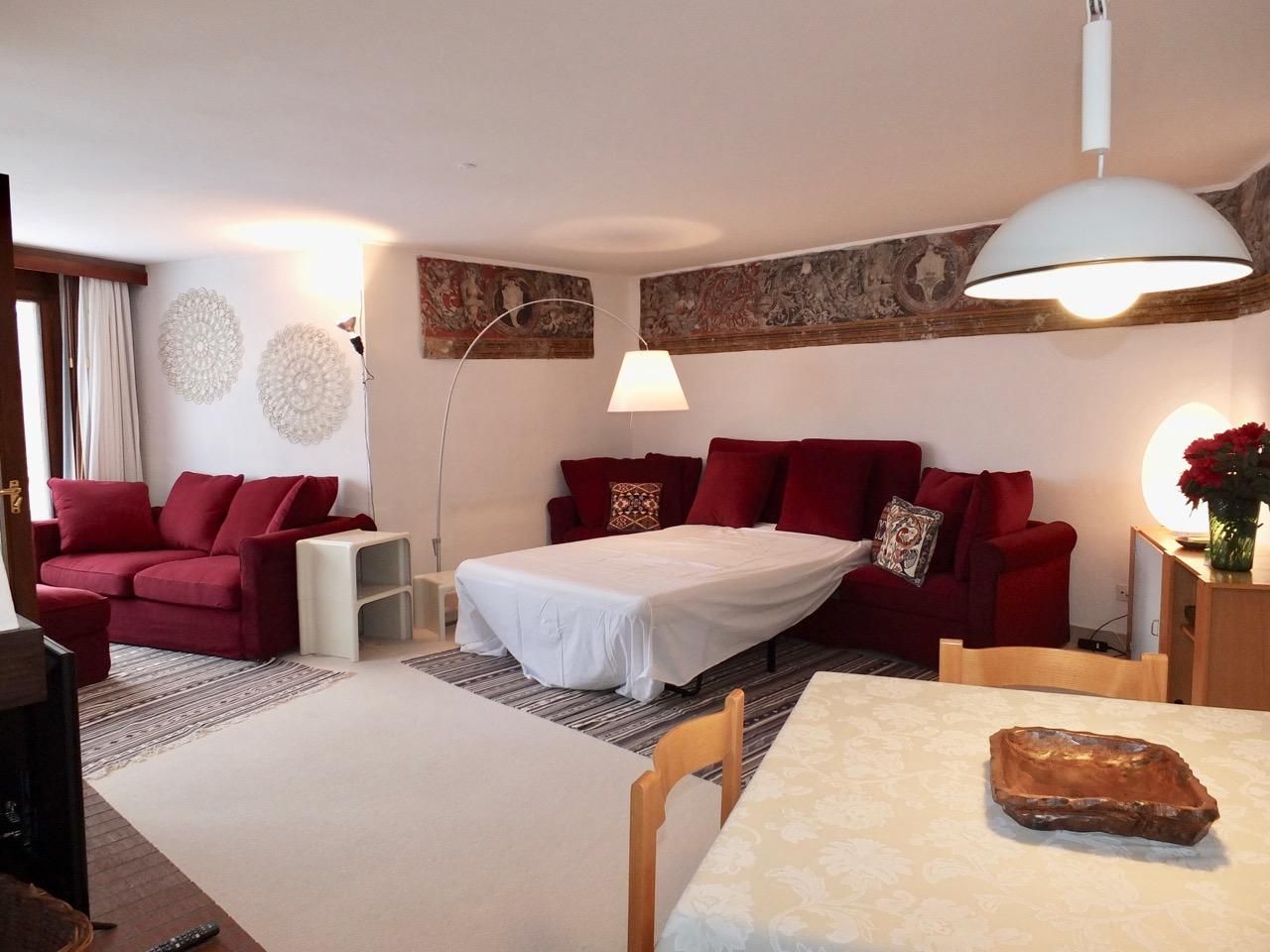 2 ½ Zimmerwohnung mit ca. 60 m2 im 2. Stock mit Aufzug. Eingang mit Garderobe, Wohn- / Essbereich, Bettsofa, Ausgang zu einem kleinen Balkon mit Blick auf die Berge. Fernsehen und Internet. Kleine separate Küche mit Backofen, Kühlschrank, Kaffeemaschine und Geschirrspüler. Schlafzimmer mit Doppelbett Badezimmer mit Badewanne, Waschbecken und Bidet. Ein Aussenparkplatz. Waschküche und Skiraum. Haustiere nicht erlaubt.
