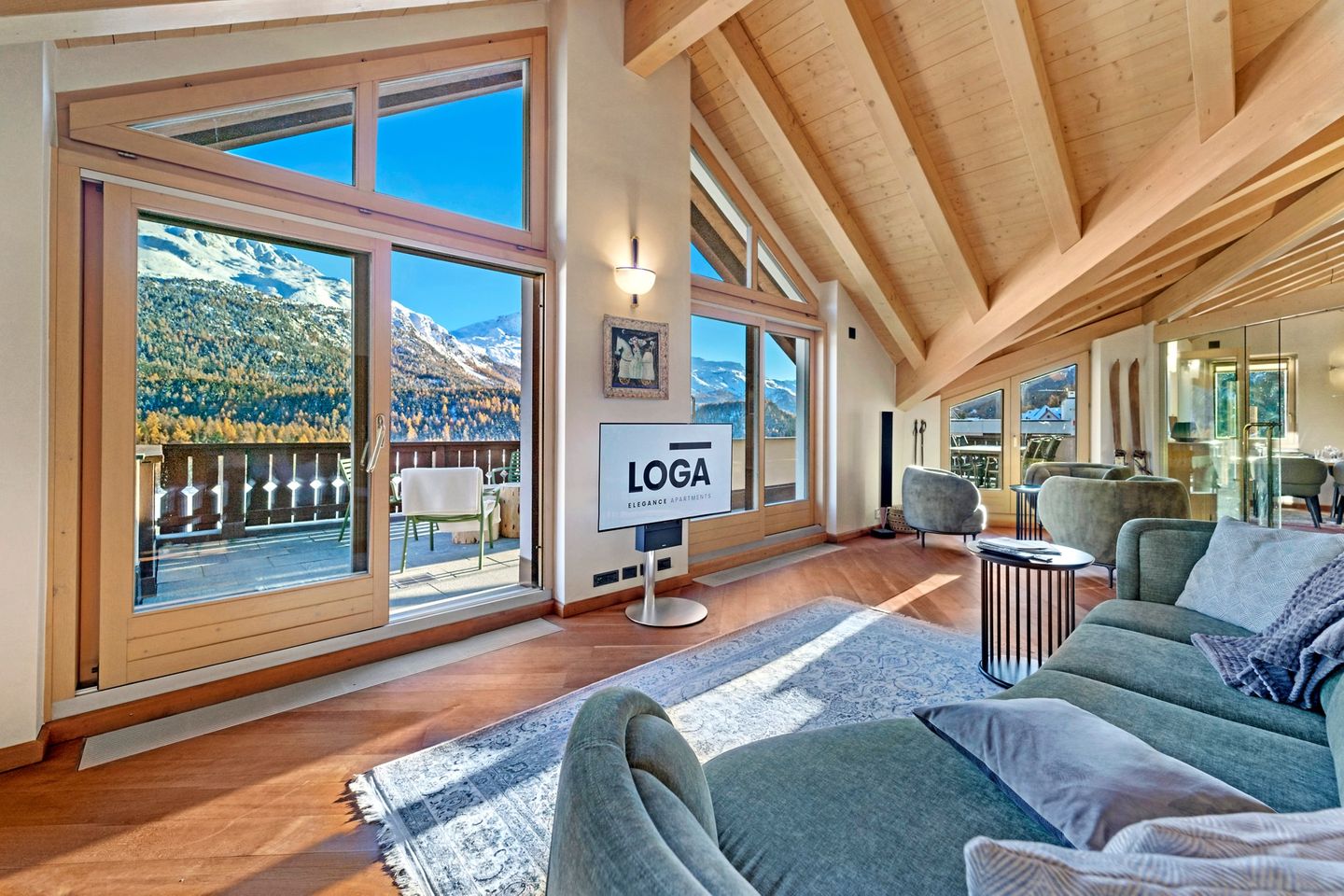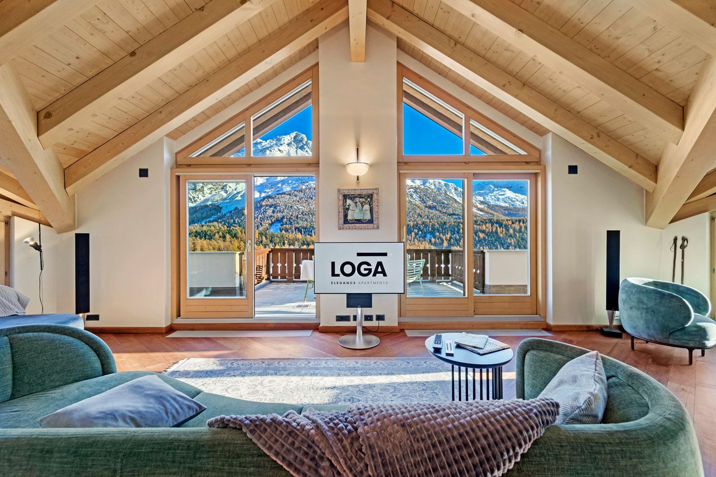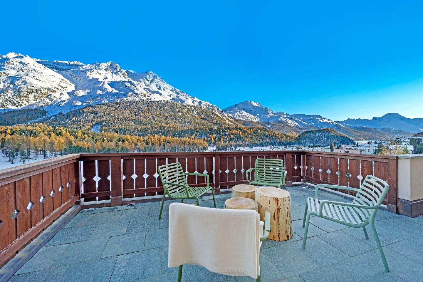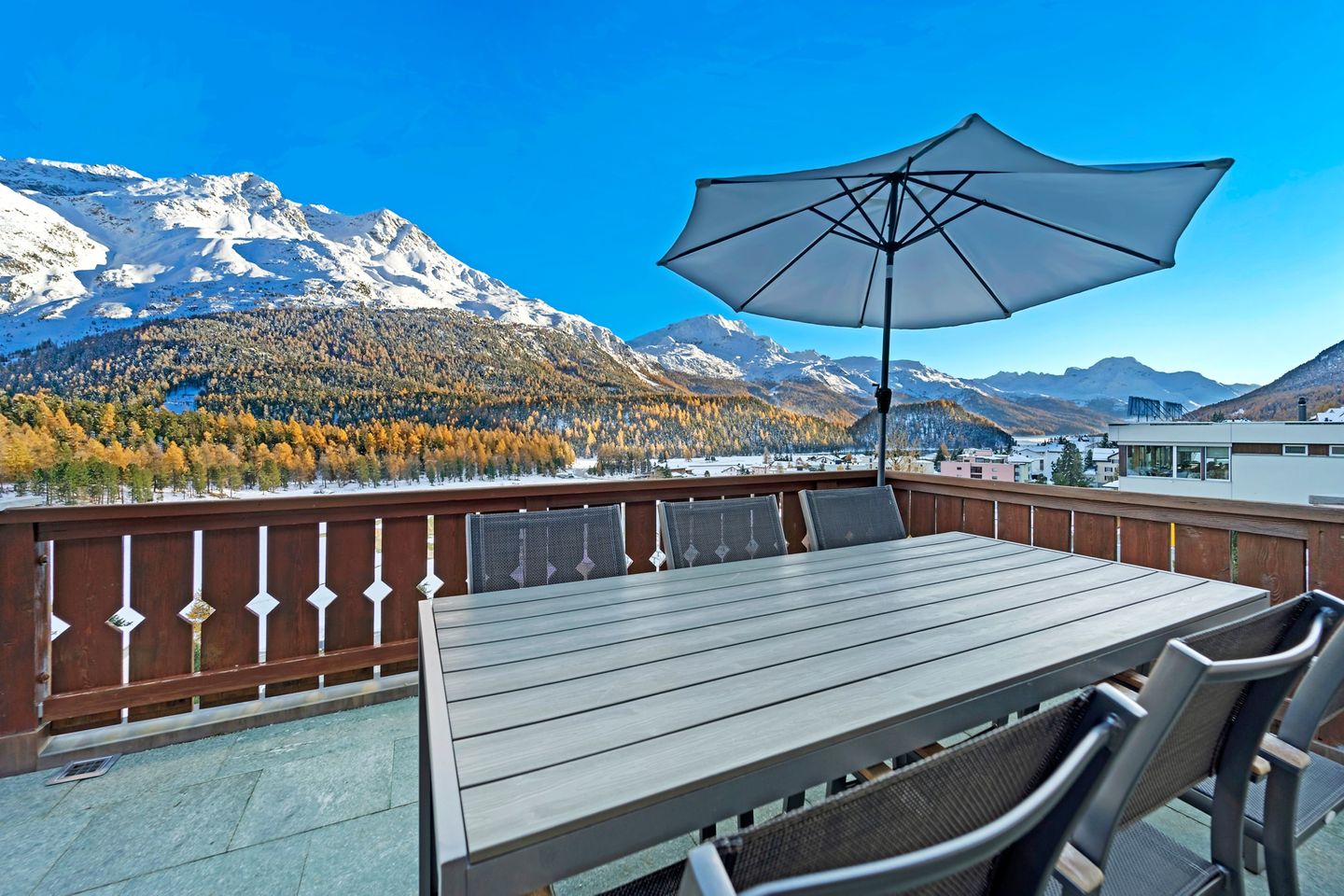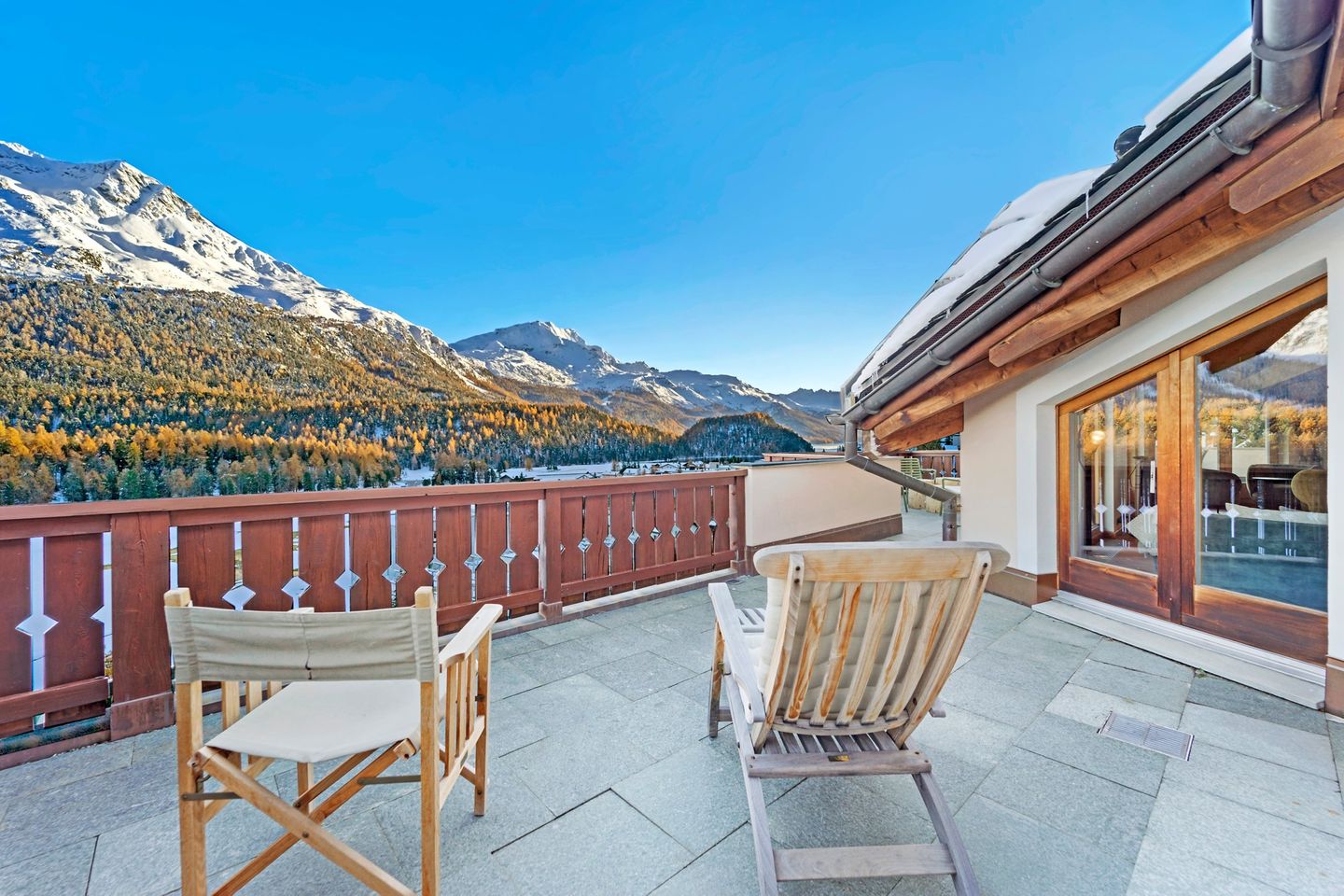 5½-Zimmerwohnung im Dachgeschoss mit atemberaubender Sicht über die Engadiner Seen- und Berglandschaft. Grosses Entrée mit Garderoben und Staumöglichkeiten. Grosses Wohnzimmer mit Cheminée und Ausgang auf die Terrasse mit einmaliger Sicht. Wunderschöne Küche mit grossem Esstisch. Separates WC. Doppelzimmer mit begehbarem Kleiderschrank und Badezimmer Ensuite (Badewanne/Lavabo/WC/Bidet). Doppelzimmer mit Ausgang auf die Terrasse und Badezimmer Ensuite (Dusche/WC/Bidet/Lavabo). 1 Einzelzimmer & 1 Doppelzimmer mit gemeinsamen Badezimmer (Dusche/WC/Lavabo/Bidet). 2 Garagenplätze. Skiraum und Waschküche zur gemeinsamen Benutzung.