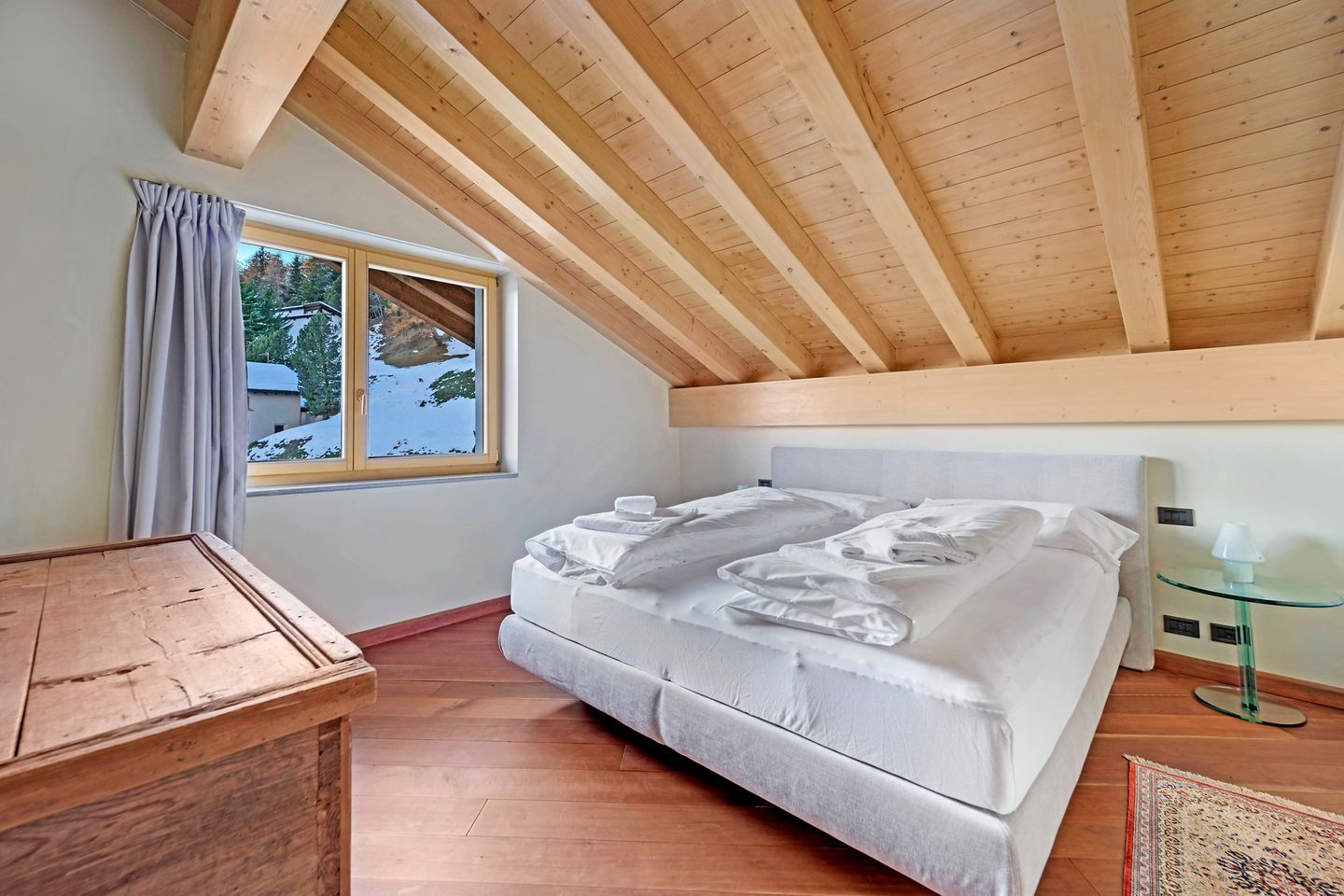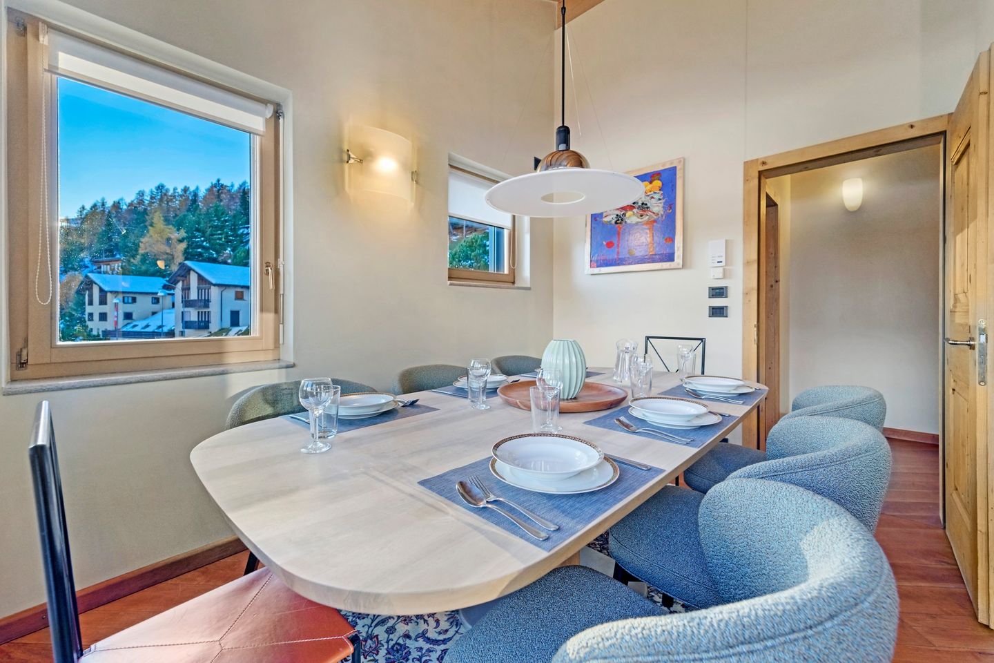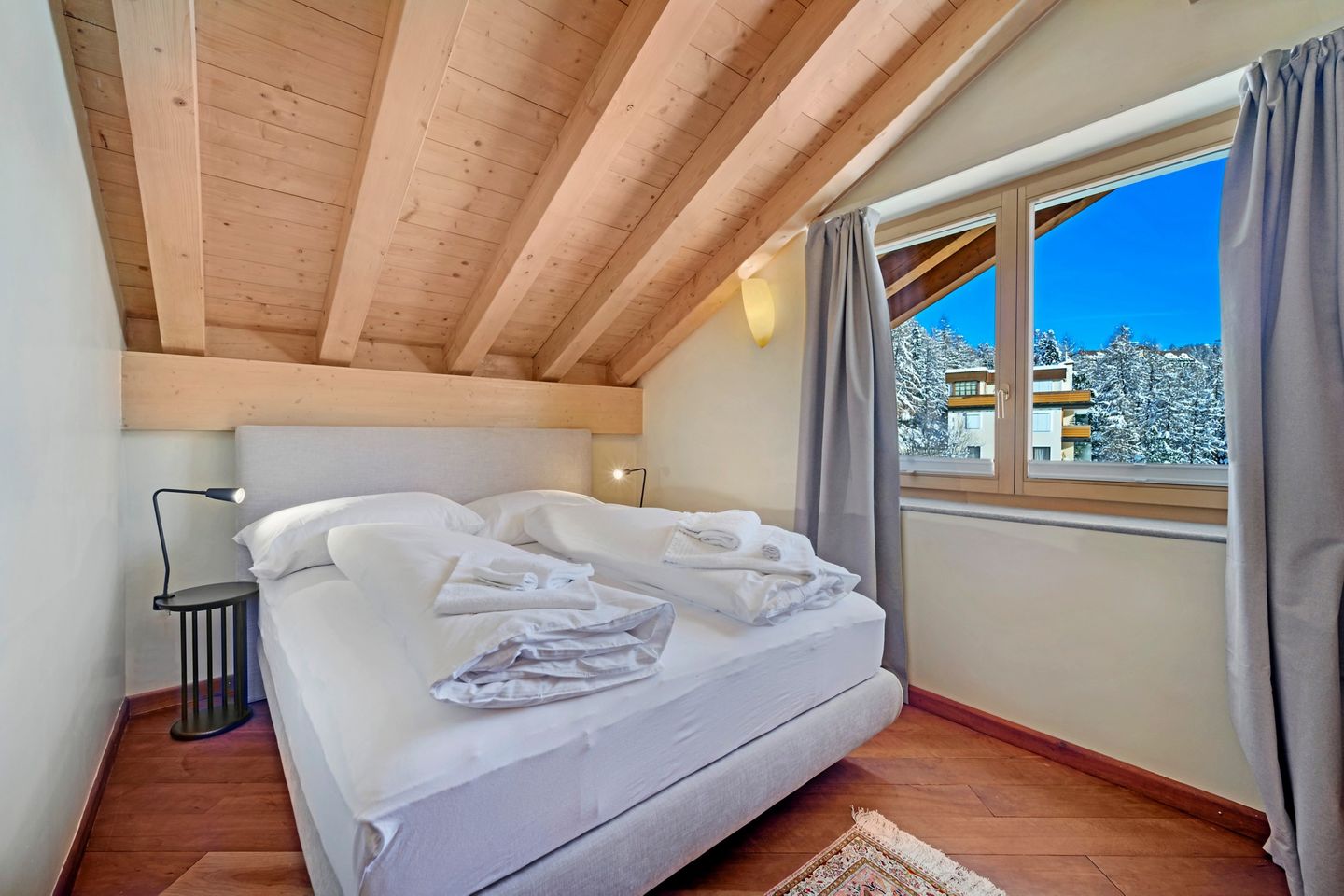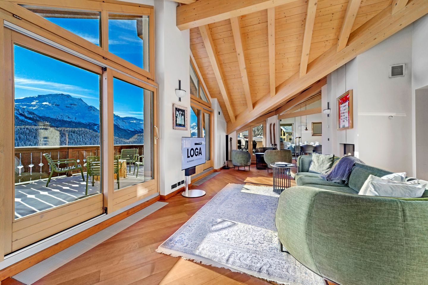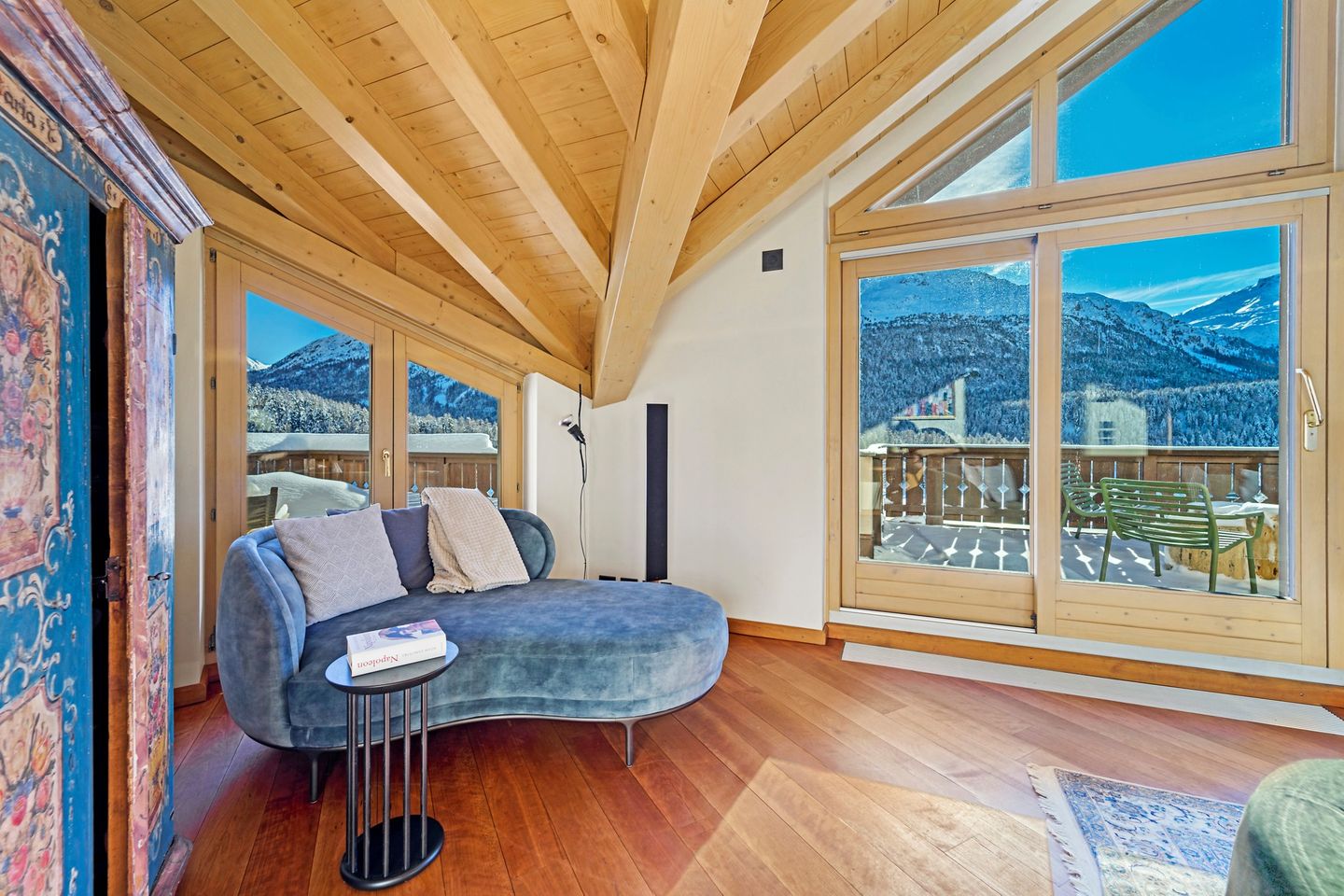 5½-Zimmerwohnung im Dachgeschoss mit atemberaubender Sicht über die Engadiner Seen- und Berglandschaft. Grosses Entrée mit Garderoben und Staumöglichkeiten. Grosses Wohnzimmer mit Cheminée und Ausgang auf die Terrasse mit einmaliger Sicht. Wunderschöne Küche mit grossem Esstisch. Separates WC. Doppelzimmer mit begehbarem Kleiderschrank und Badezimmer Ensuite (Badewanne/Lavabo/WC/Bidet). Doppelzimmer mit Ausgang auf die Terrasse und Badezimmer Ensuite (Dusche/WC/Bidet/Lavabo). 1 Einzelzimmer & 1 Doppelzimmer mit gemeinsamen Badezimmer (Dusche/WC/Lavabo/Bidet). 2 Garagenplätze. Skiraum und Waschküche zur gemeinsamen Benutzung.