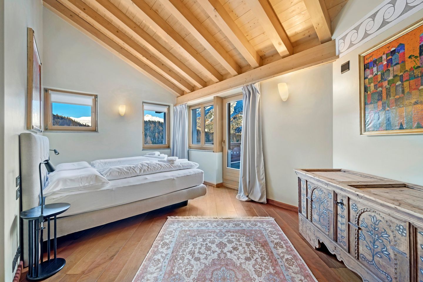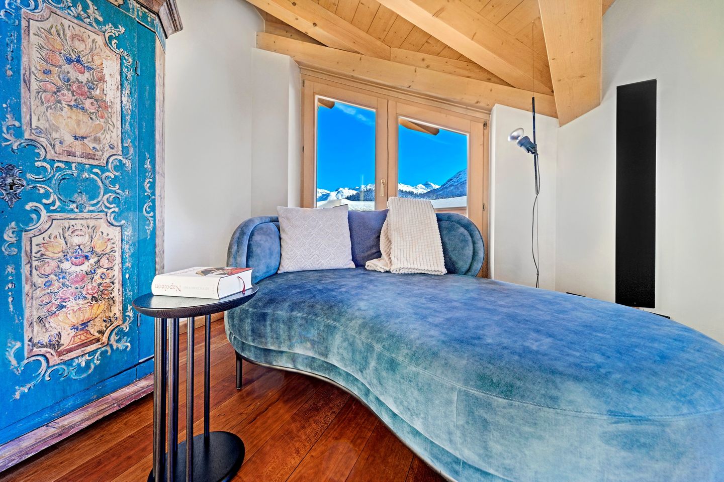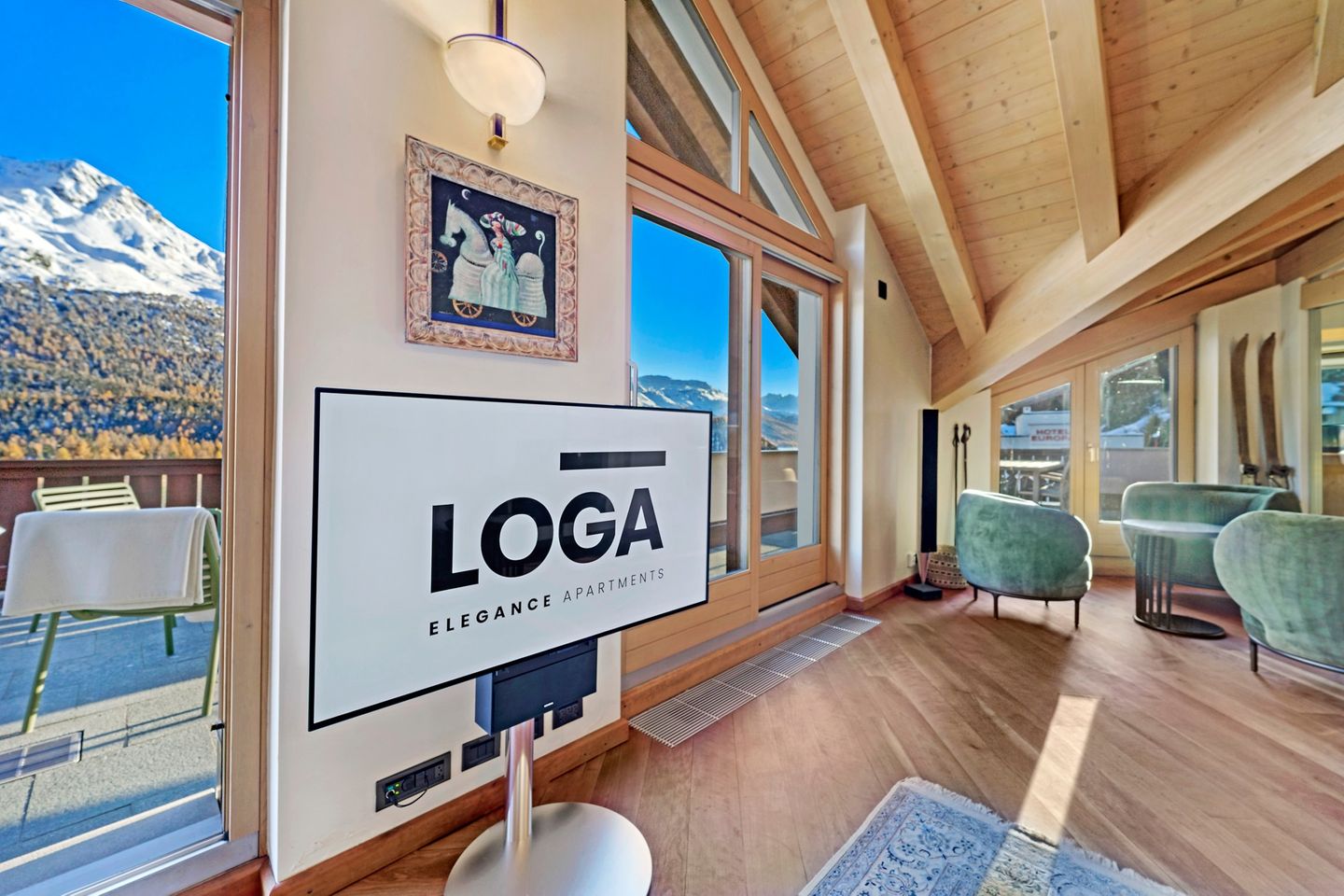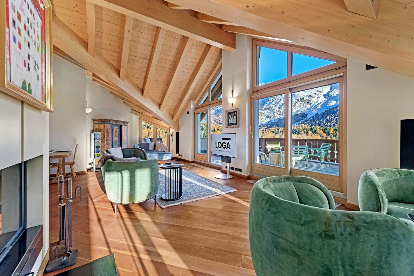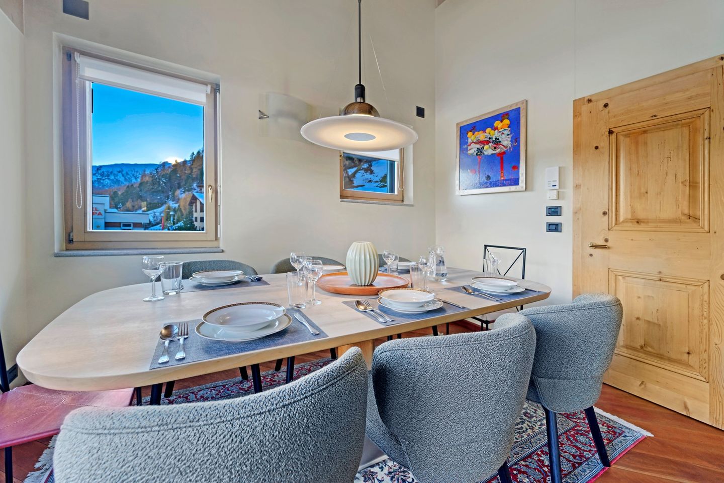 5½-Zimmerwohnung im Dachgeschoss mit atemberaubender Sicht über die Engadiner Seen- und Berglandschaft. Grosses Entrée mit Garderoben und Staumöglichkeiten. Grosses Wohnzimmer mit Cheminée und Ausgang auf die Terrasse mit einmaliger Sicht. Wunderschöne Küche mit grossem Esstisch. Separates WC. Doppelzimmer mit begehbarem Kleiderschrank und Badezimmer Ensuite (Badewanne/Lavabo/WC/Bidet). Doppelzimmer mit Ausgang auf die Terrasse und Badezimmer Ensuite (Dusche/WC/Bidet/Lavabo). 1 Einzelzimmer & 1 Doppelzimmer mit gemeinsamen Badezimmer (Dusche/WC/Lavabo/Bidet). 2 Garagenplätze. Skiraum und Waschküche zur gemeinsamen Benutzung.