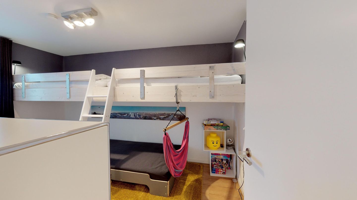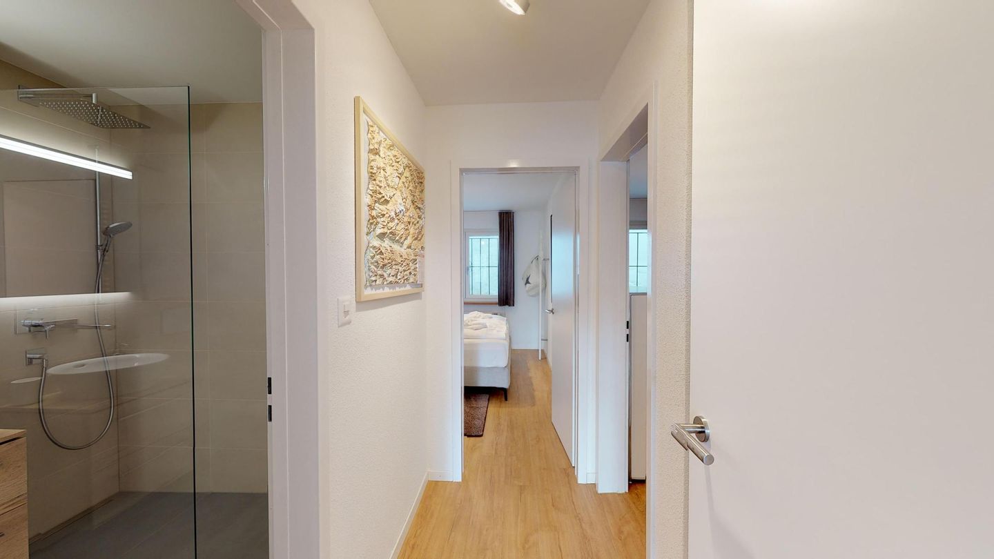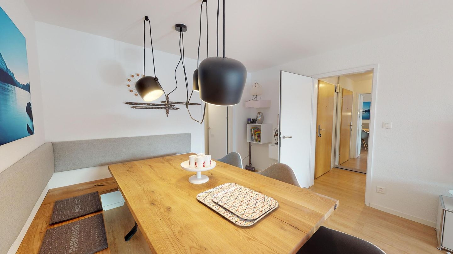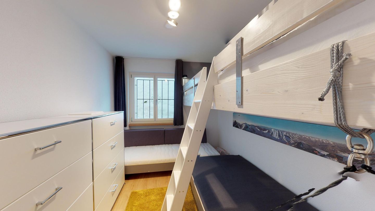 3 ½ -Zimmerwohnung in der 1. Etage (Hochparterre). Ca. 90 m², an sehr sonniger und ruhiger Lage direkt am Waldrand. Eingang mit Garderobe. Helles Wohnzimmer mit gemütlicher Essecke und direktem Zugang zum Balkon mit Südlage und wunderschöner Bergsicht. TV mit Sonos Soundsystem und Apple TV (bitte eigene Logindaten mitbringen), DVD-Player. Loungeecke und Tisch für sechs auf der Terrasse, Sonnenschirm, Weber Grill. 1 Doppelschlafzimmer. 1 Zimmer mit zwei Hochbetten. Badezimmer mit grosser Dusche/Dusch-WC/Lavabo. Geschlossene moderne Küche mit GROHE Wasserhahn, Backofen, Toaster, Wasserkocher, Kaffeevollautomat, Mikrowelle, Kühlschrank mit Tiefkühlfach und Geschirrspüler. Nespresso Kaffeemaschine, Milchschäumer. Bügeleisen. Waschmaschine und Tumbler im Haus. 1 Garagenplatz.