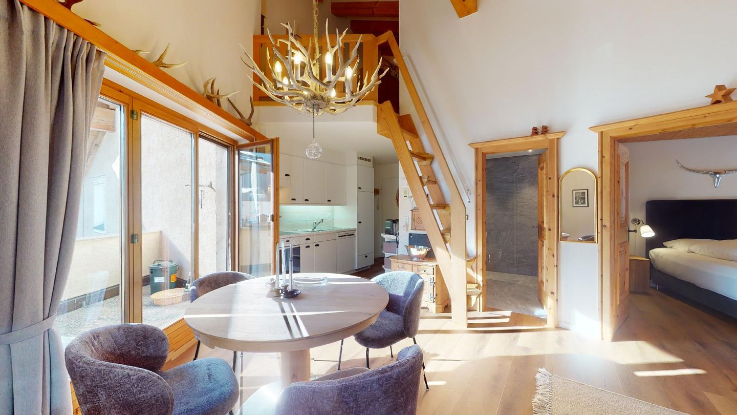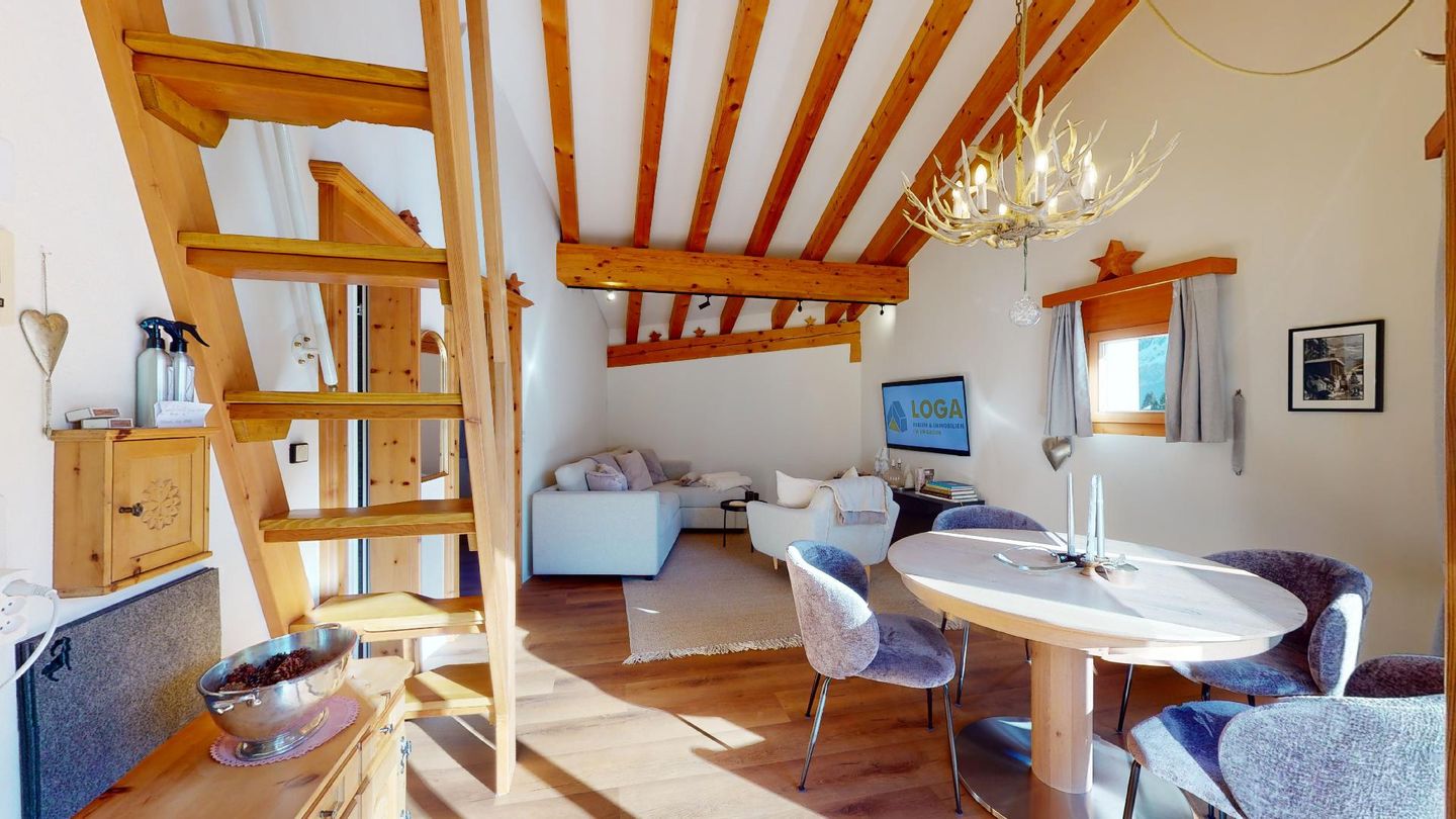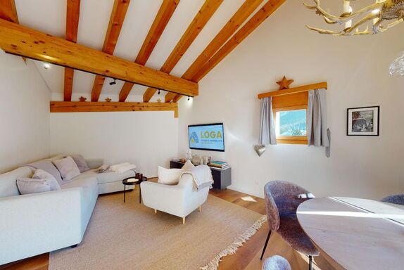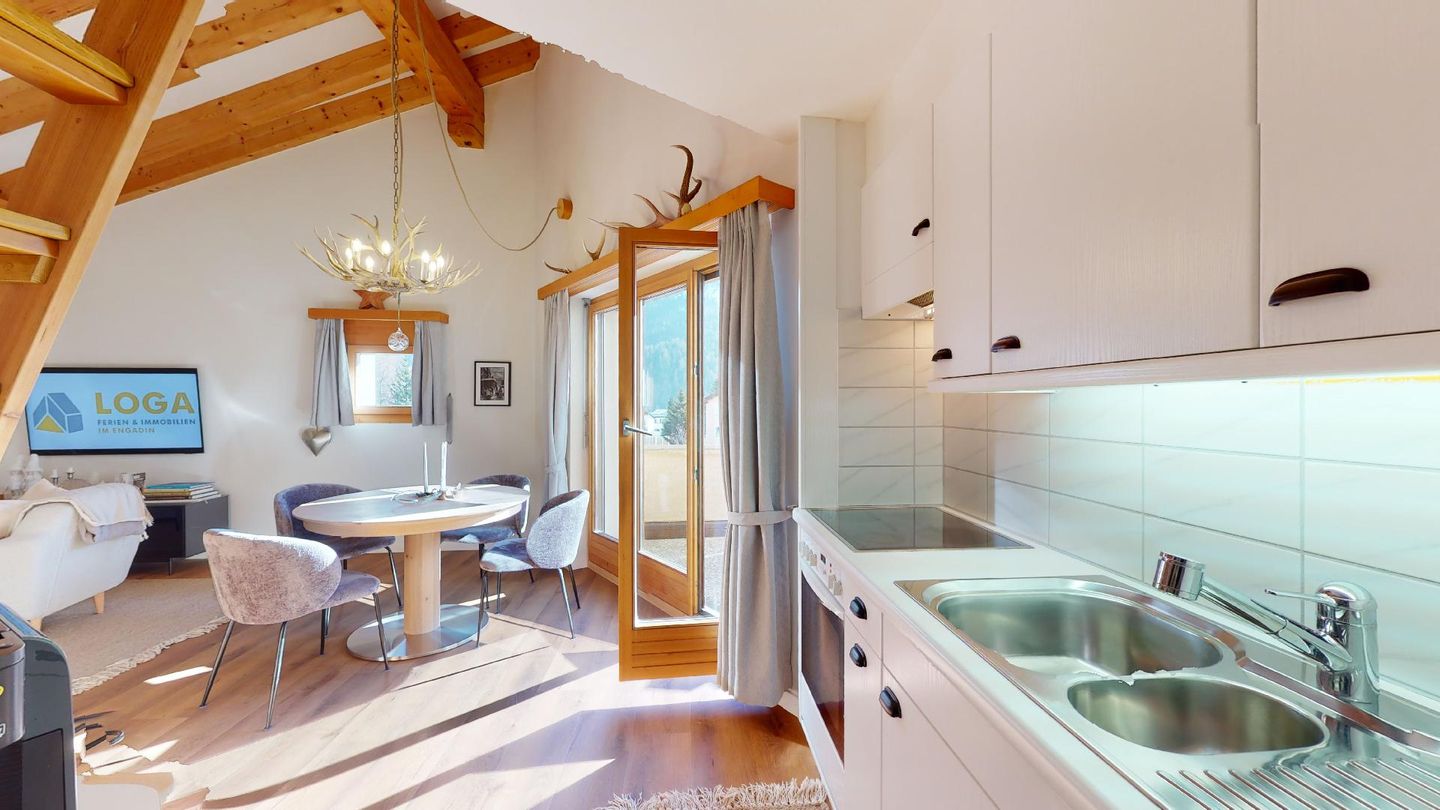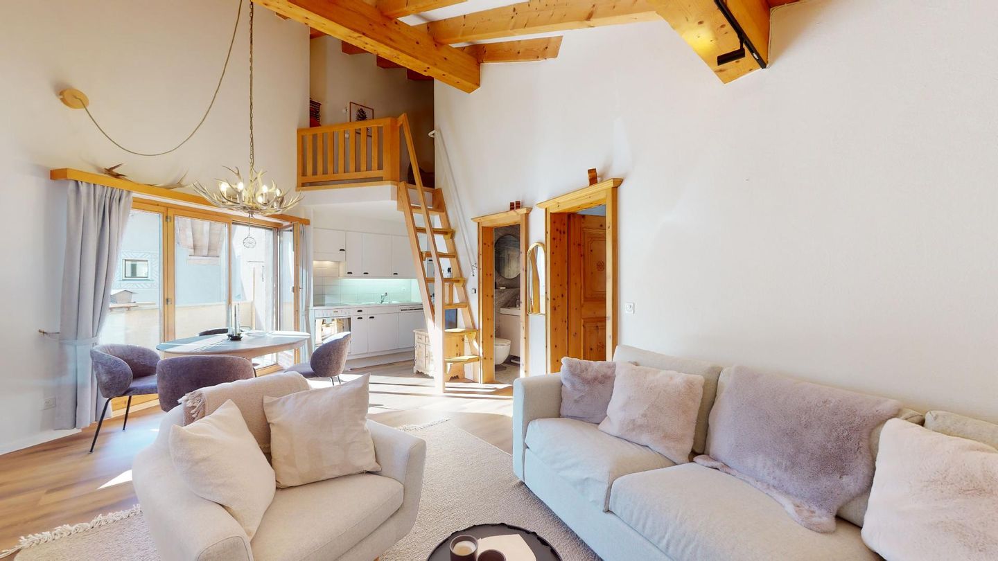 Schöne stilsicher eingerichtete 2-Zimmerwohnung im 2. Stock mit Galerie, 60 m2, an ruhiger und zentraler Lage. Wohn-/ Esszimmer mit Ausgang zum Balkon. Bergsicht. Internet und TV. Offene Küche mit Geschirrspüler und Backofen. Kaffeemaschine Chicco d'Oro. Bad mit Dusche/WC/Lavabo. Doppelzimmer mit Boxspringbett. Empore mit Doppelbett (2 Matratzen) unter Dachschräge, sehr steile Treppe. Neue, komfortable Einrichtung. Garagenplatz. Waschküche und Skiraum zur Mitbenützung. Nichtraucherwohnung. Haustiere sind nicht erlaubt.