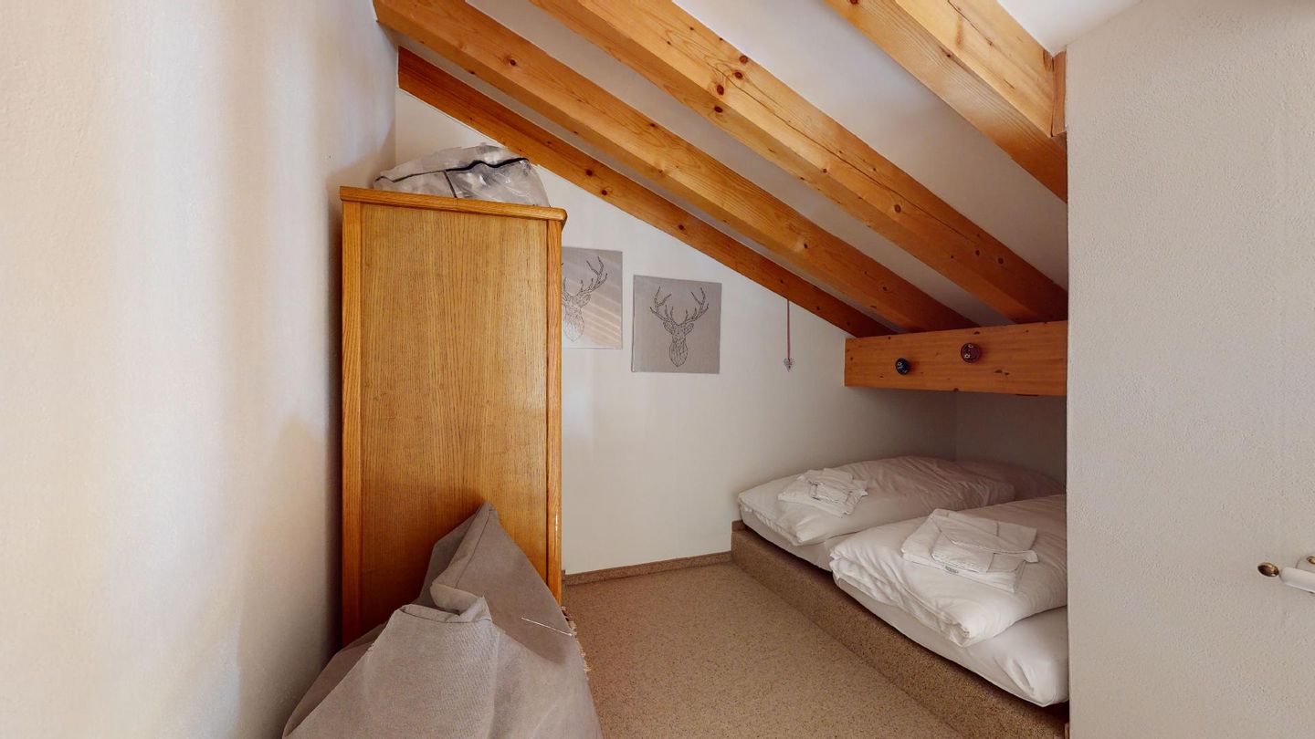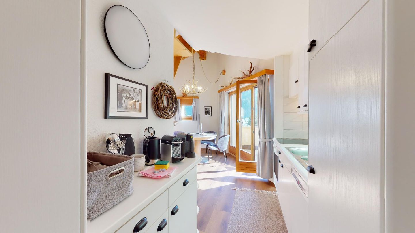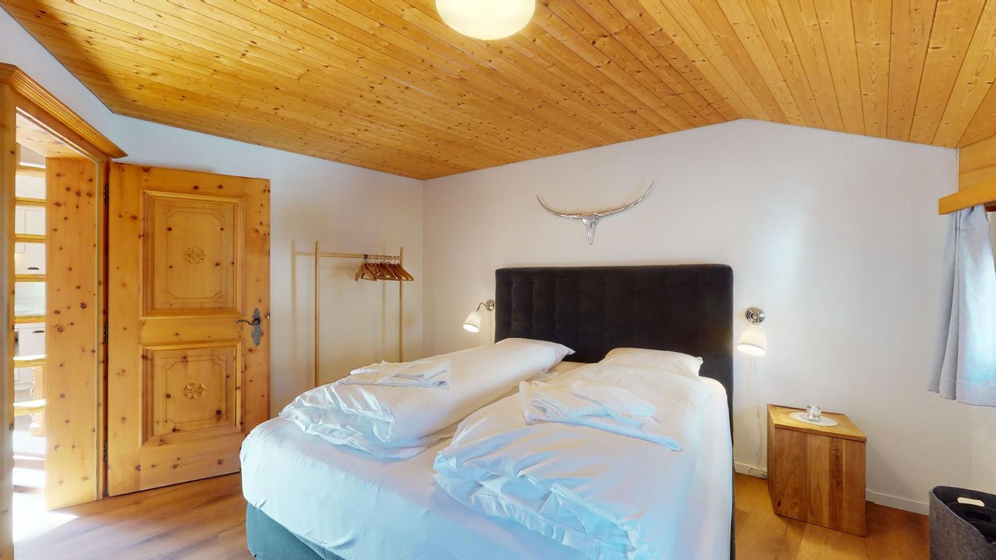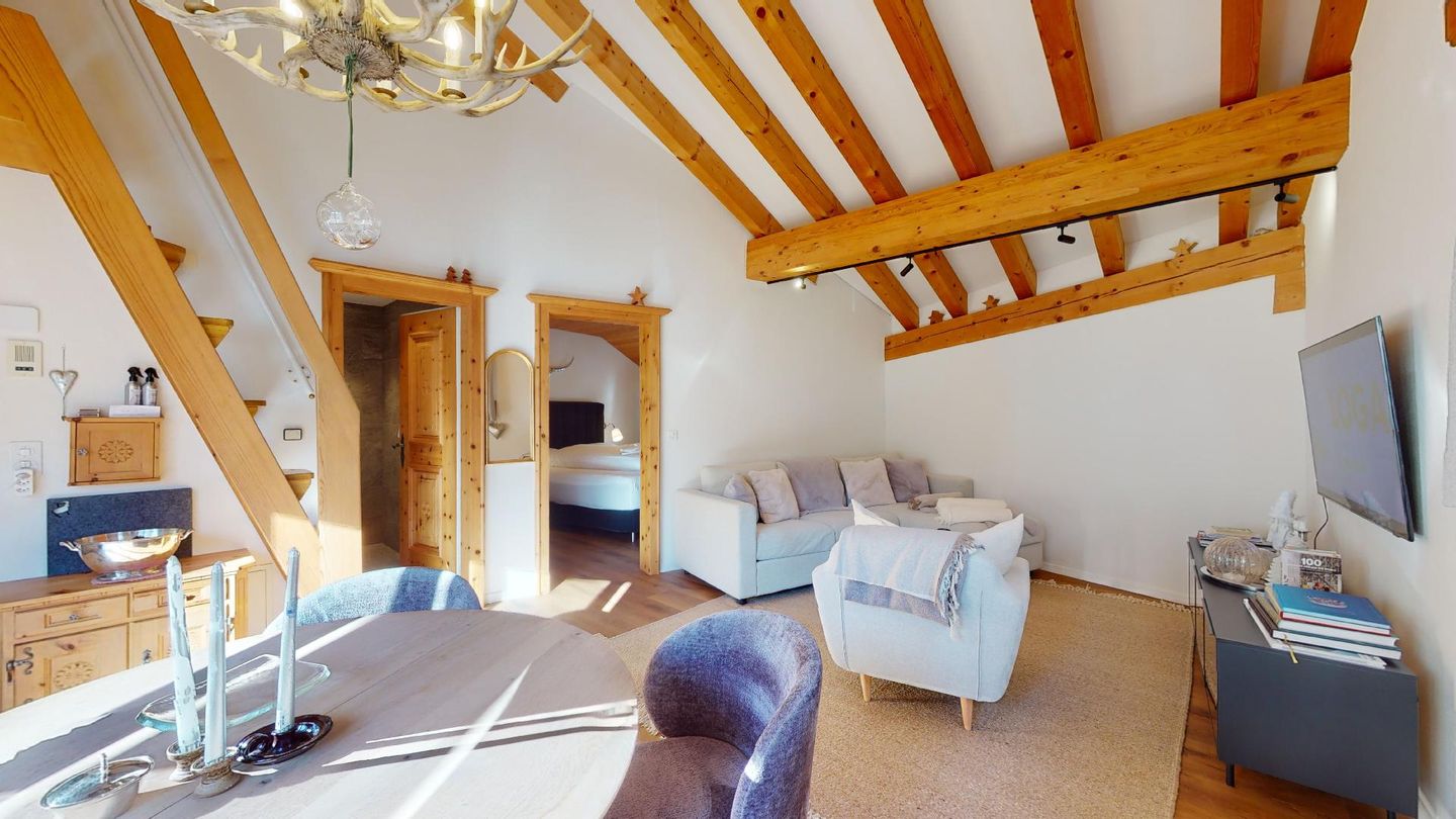 Schöne stilsicher eingerichtete 2-Zimmerwohnung im 2. Stock mit Galerie, 60 m2, an ruhiger und zentraler Lage. Wohn-/ Esszimmer mit Ausgang zum Balkon. Bergsicht. Internet und TV. Offene Küche mit Geschirrspüler und Backofen. Kaffeemaschine Chicco d'Oro. Bad mit Dusche/WC/Lavabo. Doppelzimmer mit Boxspringbett. Empore mit Doppelbett (2 Matratzen) unter Dachschräge, sehr steile Treppe. Neue, komfortable Einrichtung. Garagenplatz. Waschküche und Skiraum zur Mitbenützung. Nichtraucherwohnung. Haustiere sind nicht erlaubt.