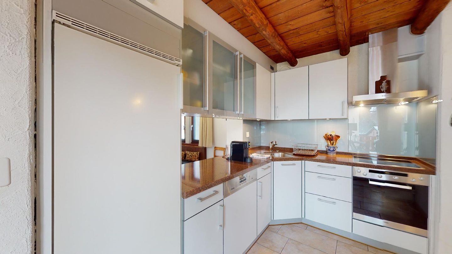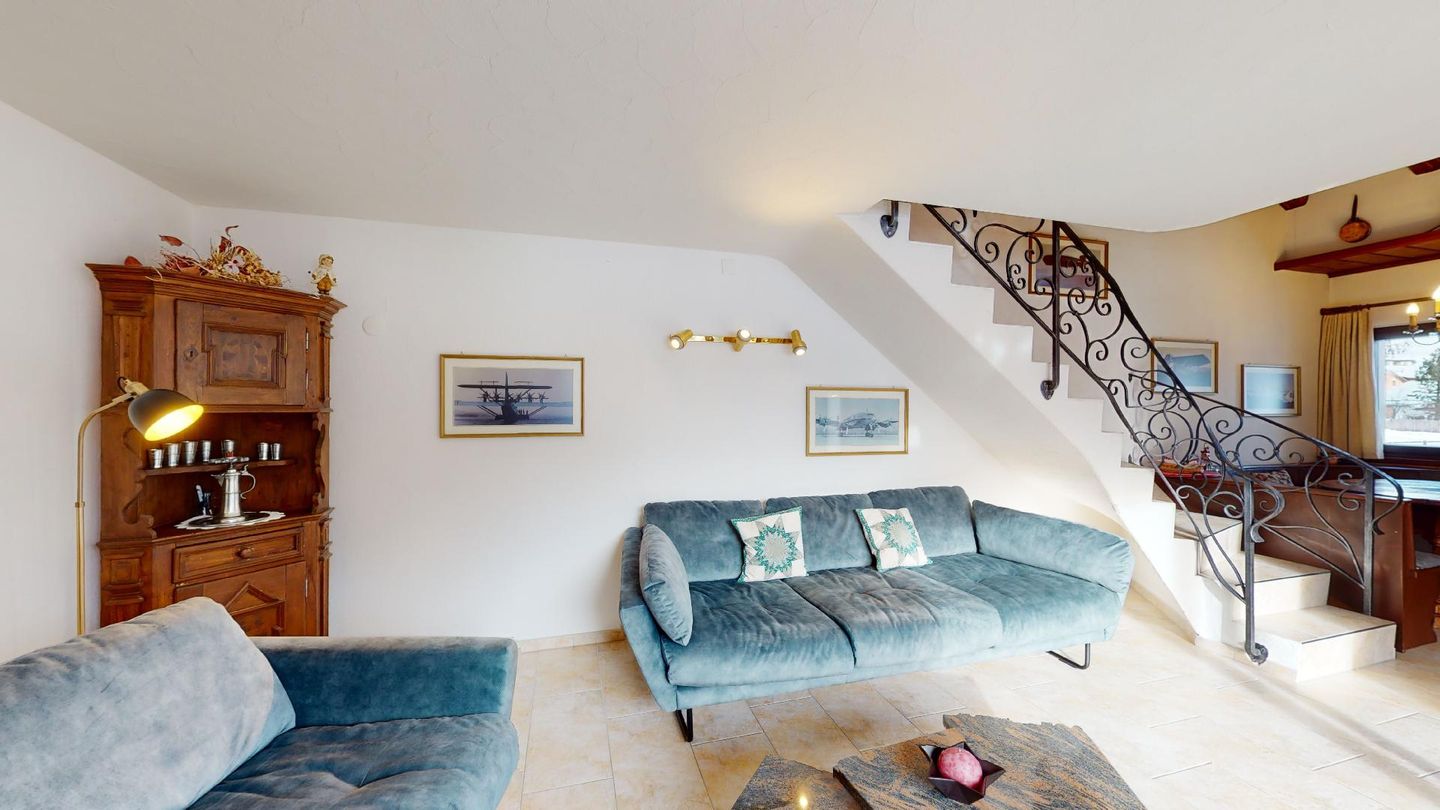 3½-Zimmerwohnung im 3. Stock. Eingang mit Garderobe. Ein Doppelzimmer (1,80m × 2 m) und ein Schlafzimmer mit einem Einzelbett und einem Hochbett (0,90m × 2 m). Zwei Badezimmer mit Wanne, WC und Lavabo. Über die Empore führt eine Treppe zum offenen Wohnzimmer mit TV, Kamin, Essecke und Balkon mit Blick in die Val Chamuera. Halboffene Küche mit Glaskeramikkochfeld mit Dampfabzug, Backofen, Kühlschrank mit Tiefkühlfach, Geschirrspüler. Garagenplatz. Waschküche zur gemeinsamen Benützung. Haustiere sind nicht erlaubt.