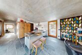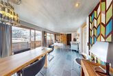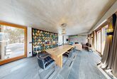 Grosszügiger sehr moderner Wohn-Essbereich im OG Chéminee, TV, und Internet. Moderne Küche mit Backofen, Geschirrspülmaschine, Chicco d'Oro-Kapselkaffeemaschine, Speisekammer mit grossem Kühlschrank und Gefrierfach, Esstisch und Treppe zum Aussenbereich.