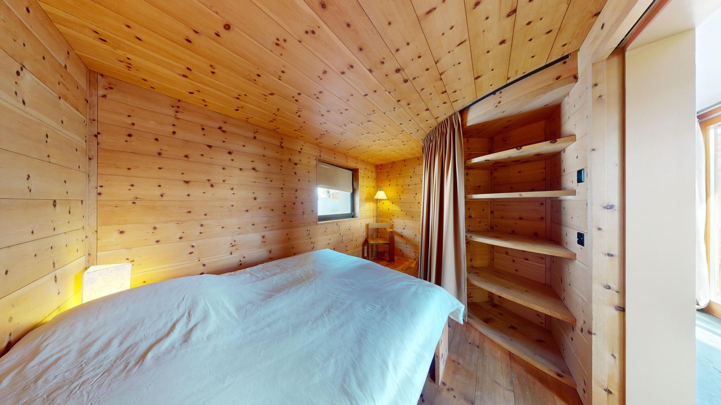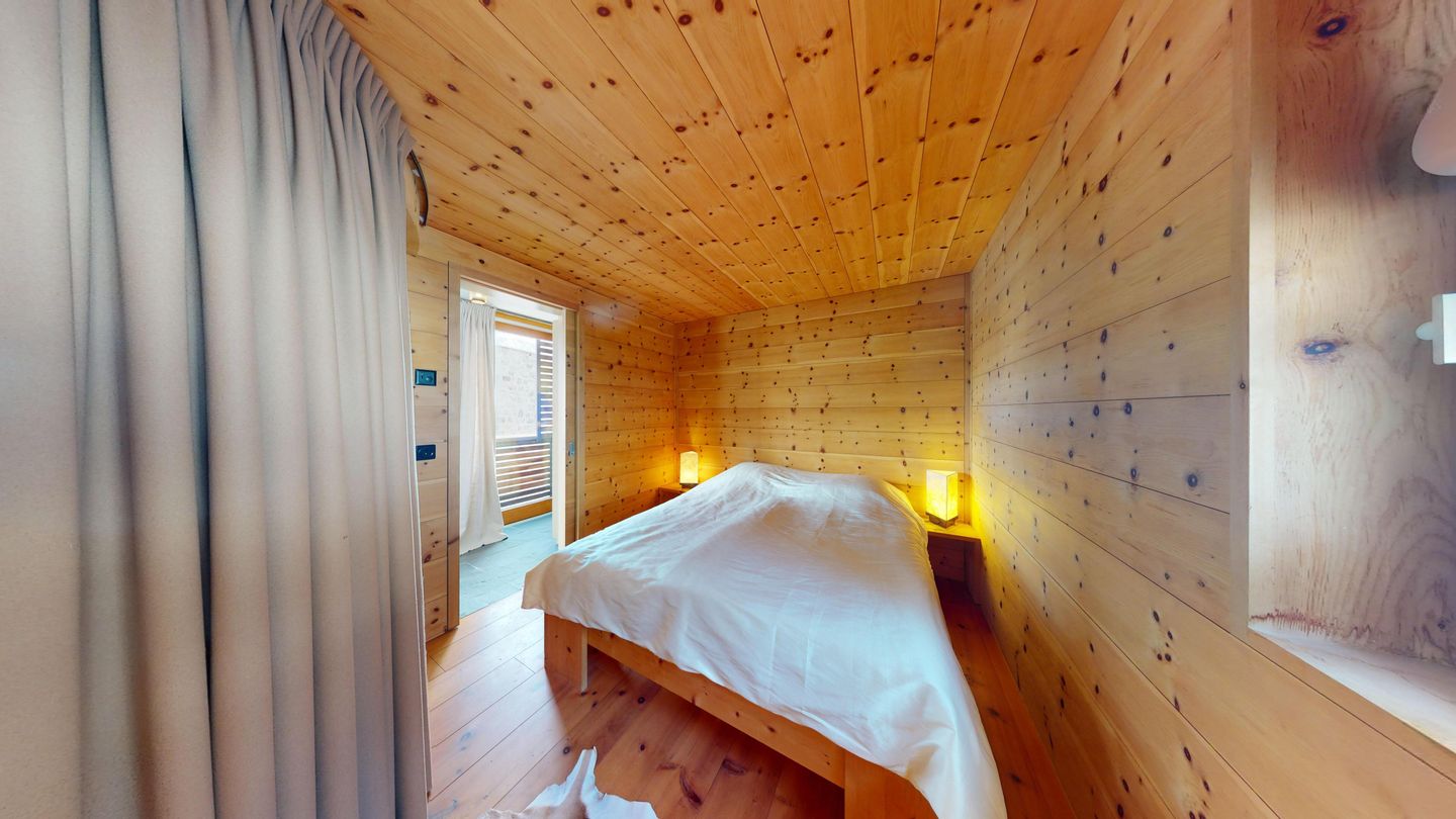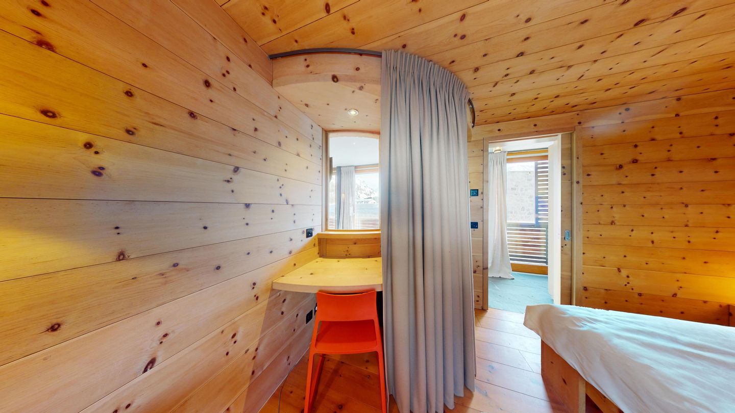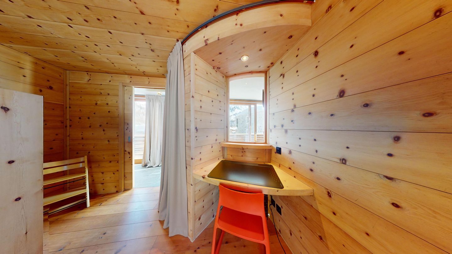 Schlafzimmer mit Doppelbett, Stauraum für Kleidung, Schreibtisch und Fenster zum Gang.