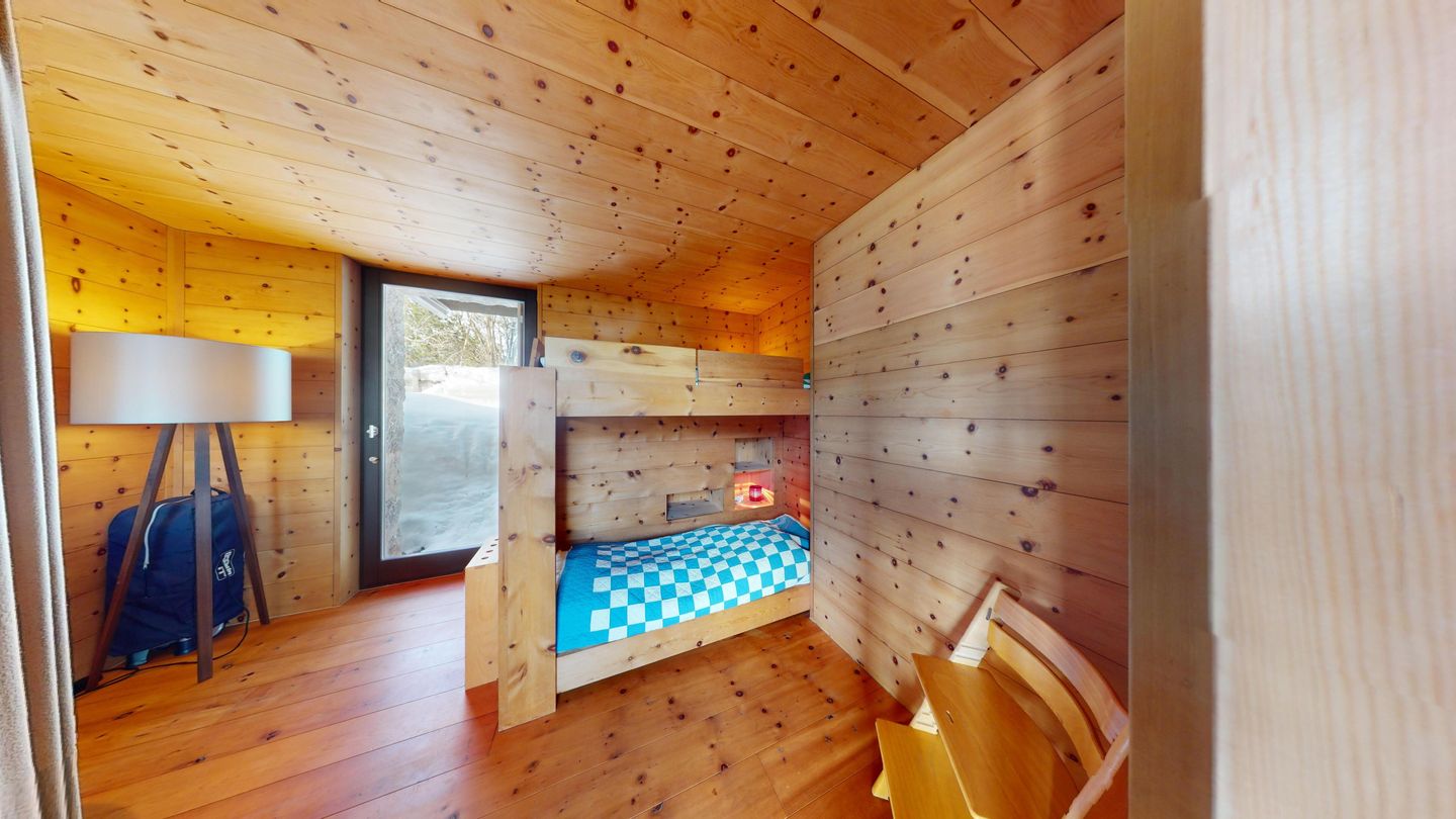 Schlafzimmer mit Etagenbett, Stauraum für Kleidung, Schreibtisch, Ausgang zum Garten und Fenster zum Gang.