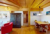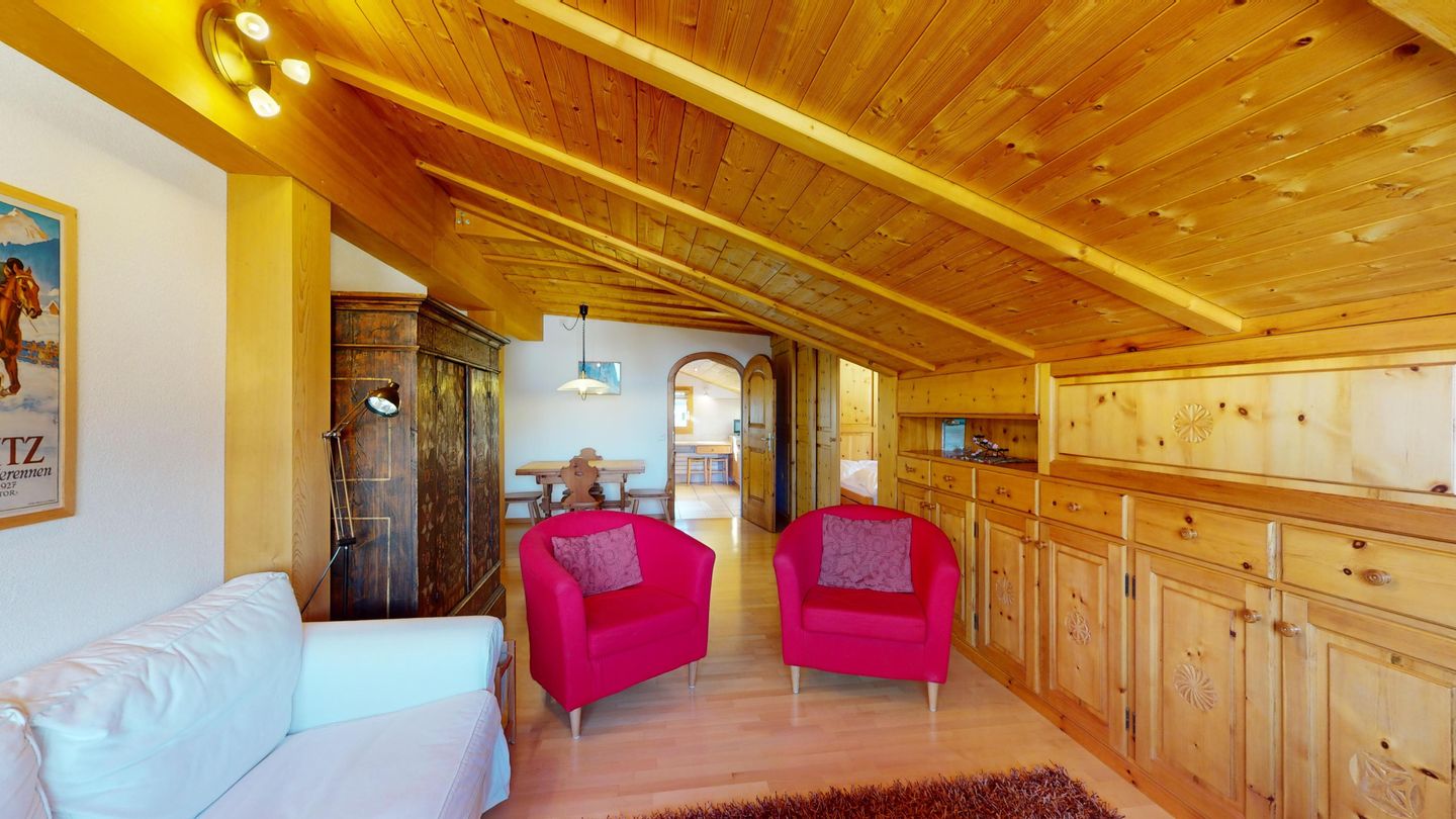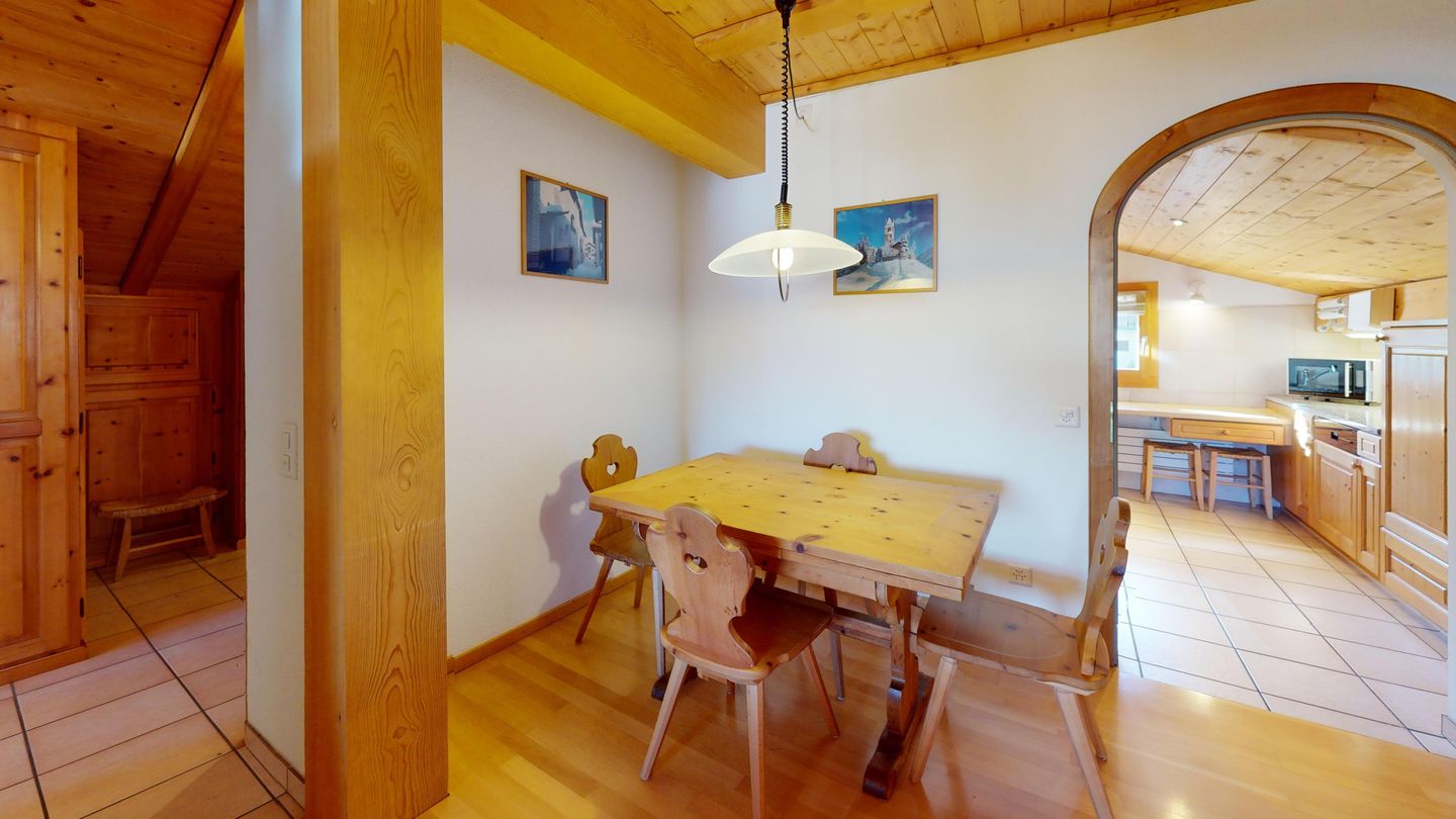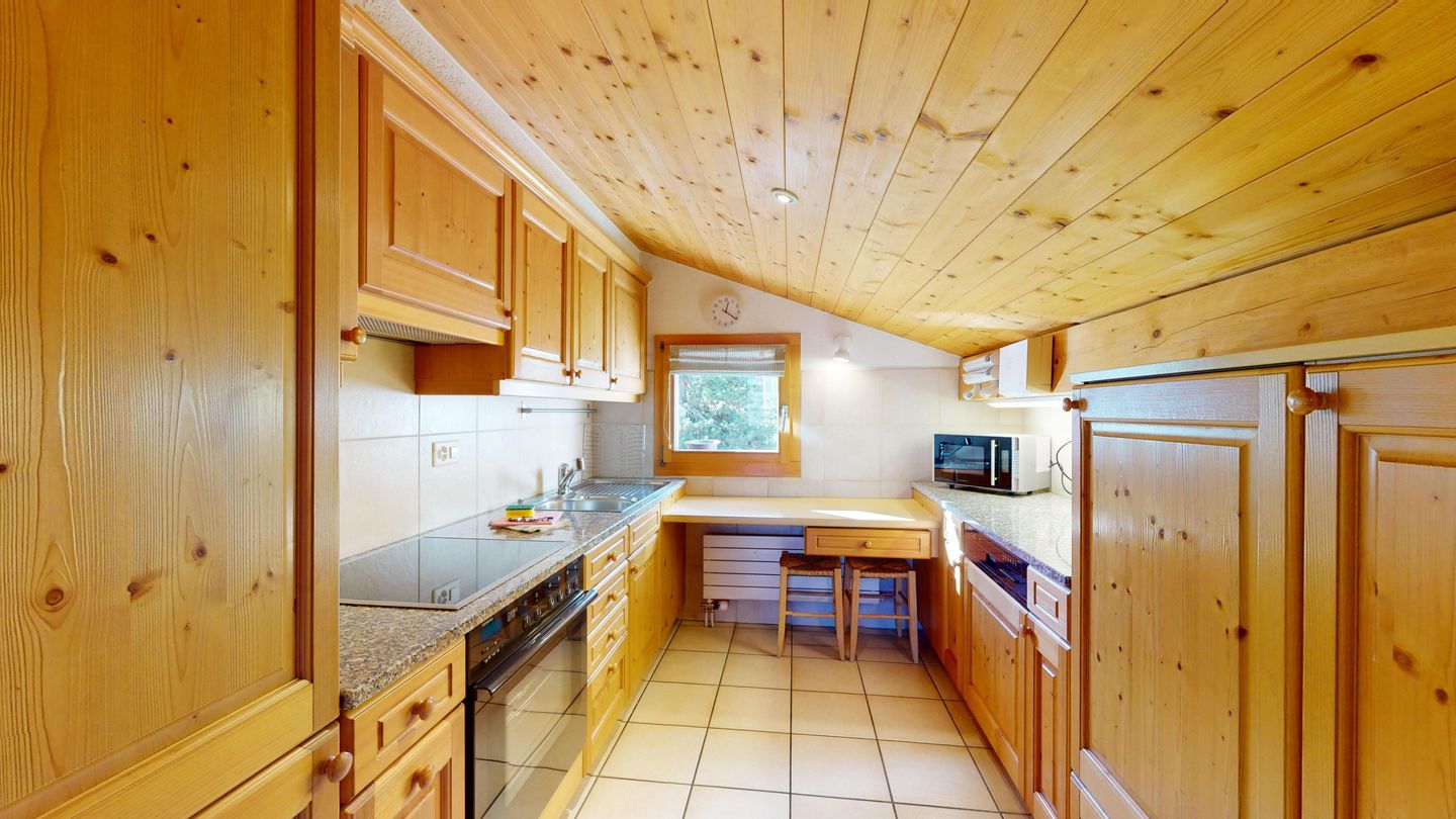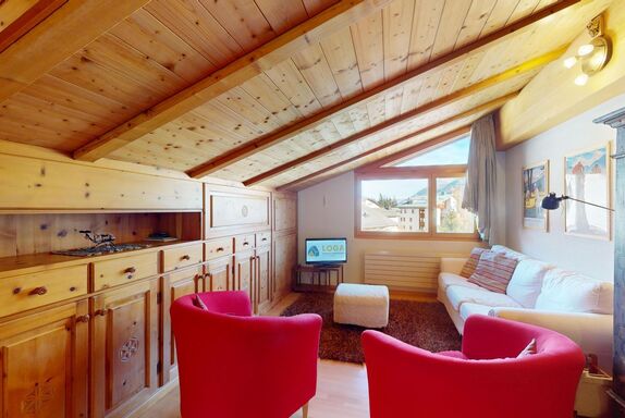 3-ZWG im Dachgeschoss. Entrée mit Garderobe. Wohn-/ Esszimmer mit Schlafbereich (zwei Einzelbetten). Kann durch Schiebetüre vom Rest abgetrennt werden. Sep. Küche mit Chicco d'Oro Kaffeemaschine. 1 Schlafzimmer mit Doppelbett. Badezimmer mit Wanne/WC/Lavabo. Achtung! Ausgeprägte Dachschräge im Badezimmer. TV und Internet. Kein eigener Parkplatz vorhanden (Aus- und Einladen vor dem Haus möglich), öffentliche Parkplätze im Quartier vorhanden. Nichtraucherwohnung. Haustiere nicht erlaubt.