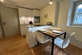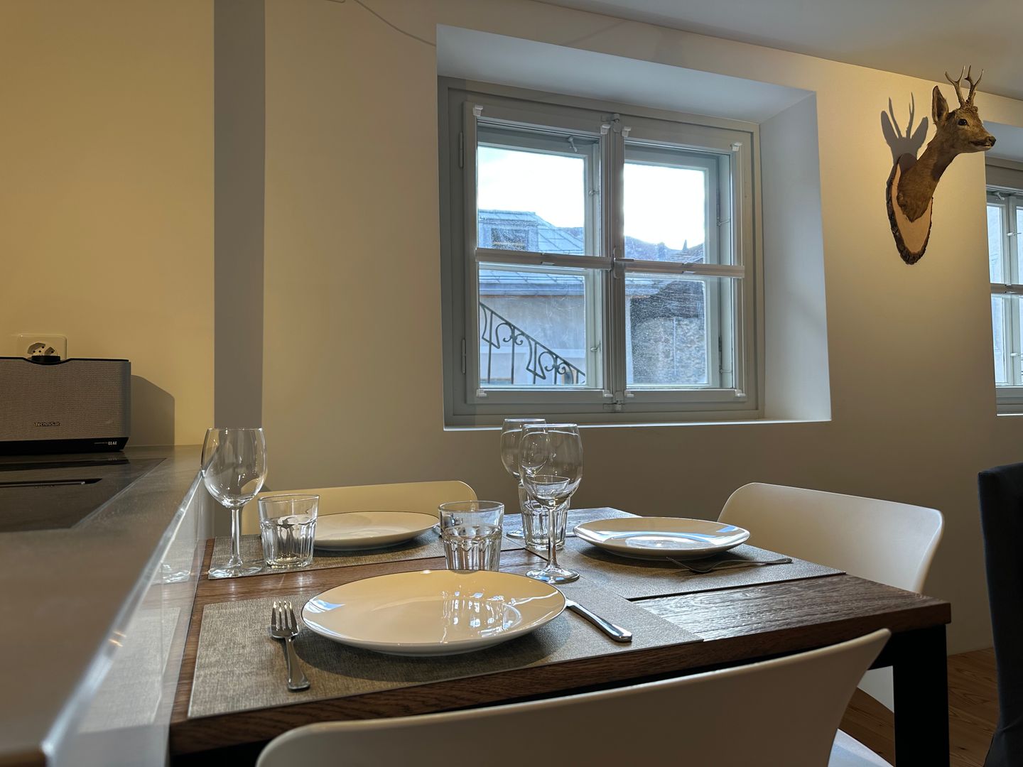 Das Schlafzimmer ist mit einem hochwertigen Boxspringbett ausgestattet, und das Wohnzimmer lädt mit Sofa und Sesseln zum Entspannen ein. Die voll ausgestattete Küche bietet alles, was man für den Aufenthalt braucht: Induktionskochfeld, Nespresso-Kaffeemaschine, Fondue- und Raclette-Set und sogar einen Technisat Bluetooth-Lautsprecher. Im Sommer lädt ein kleiner privater Außenbereich mit Sitzbank und Blumentrog zum Verweilen ein. Zwei Zugänge, einer von aussen und einer über das Treppenhaus, bieten Flexibilität. Vor der Wohnung steht eine Sitzbank zur Verfügung.