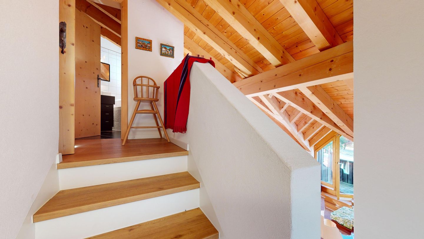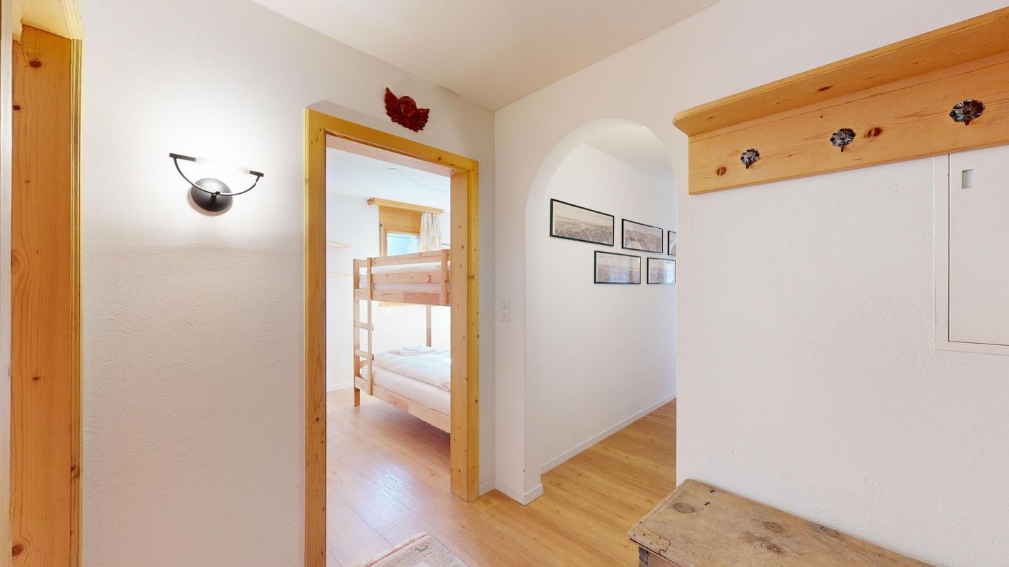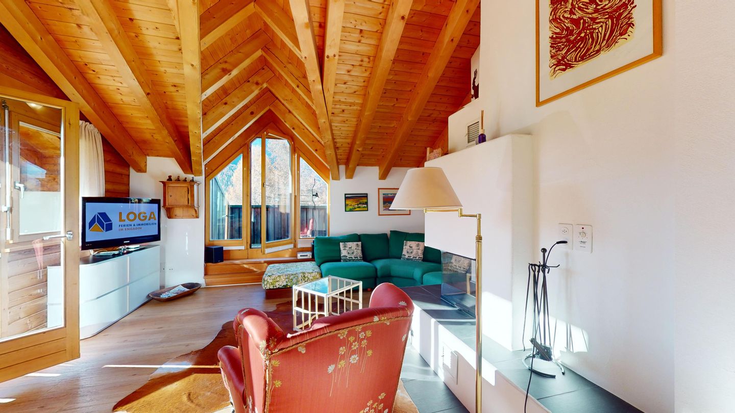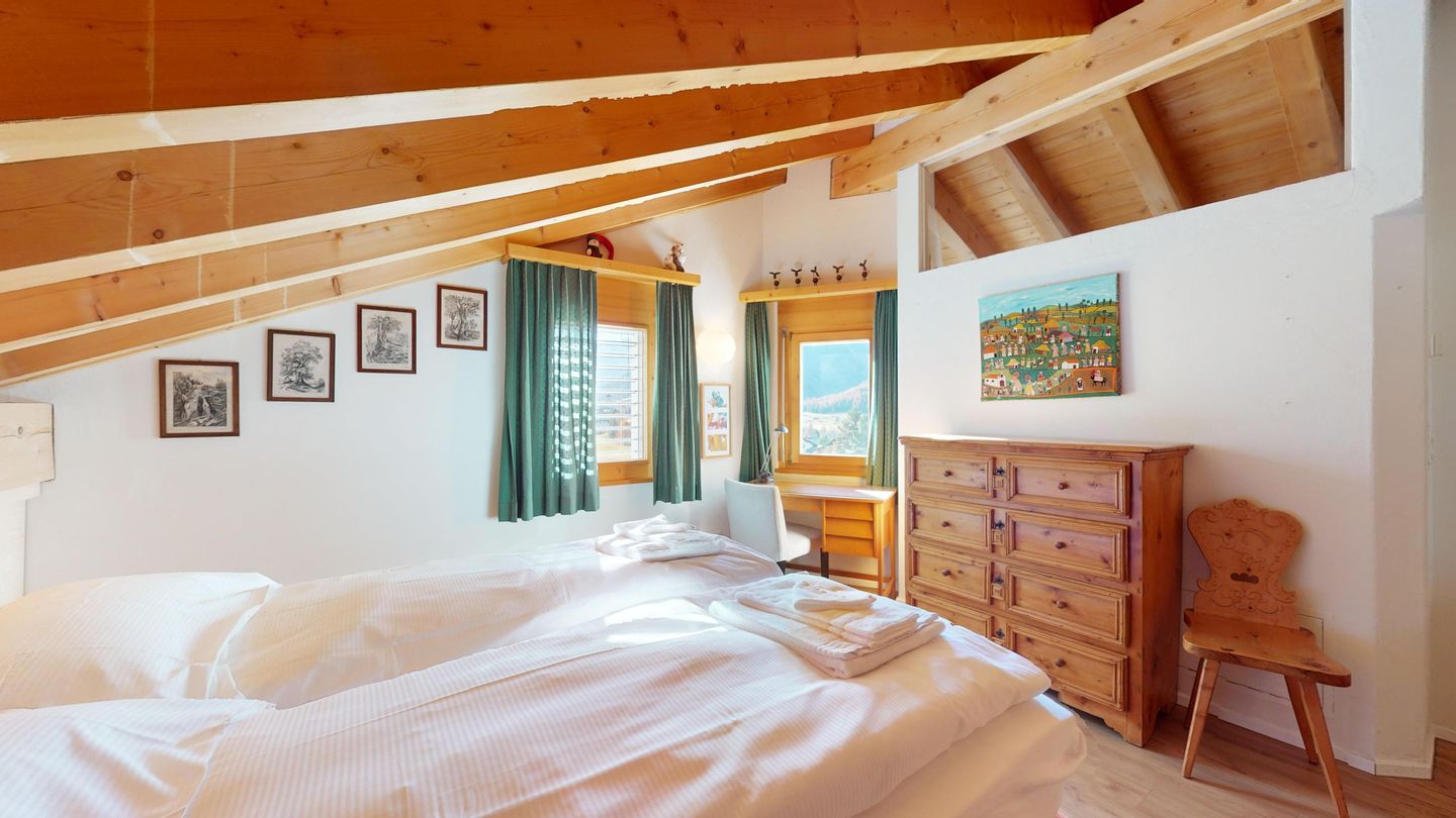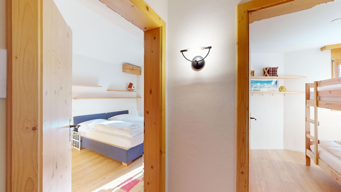 Maisonette 4-Zimmerwohnung im 1. Obergeschoss, Entrée mit Garderobe. Offene Küche mit Kühlschrank, Herd, Ofen und Geschirrspüler. Wohnzimmer mit Essecke, TV, Kamin und Ausgang auf den Balkon mit schöner Bergsicht. Ein Doppelzimmer mit Balkon und Treppe zur Wiese mit Gartensitzplatz (Gartenmöbel vorhanden). Badezimmer mit Dusche, WC, Lavabo, Waschmaschine und Tumbler. Ein Schlafzimmer mit zwei Etagenbetten. Auf der oberen Etage ein zweites Doppelzimmer und ein Badezimmer mit Wanne, Dusche, WC und Lavabo. Zwei Parkplätze in der Garage (Höhe 200cm, Breite 280cm). Nichtraucherwohnung. Haustiere sind nicht erlaubt.