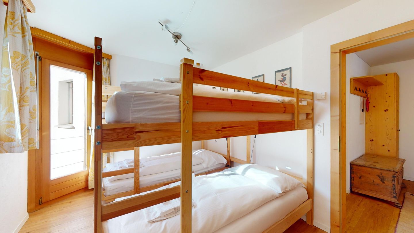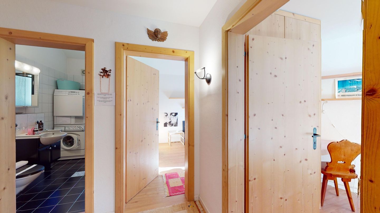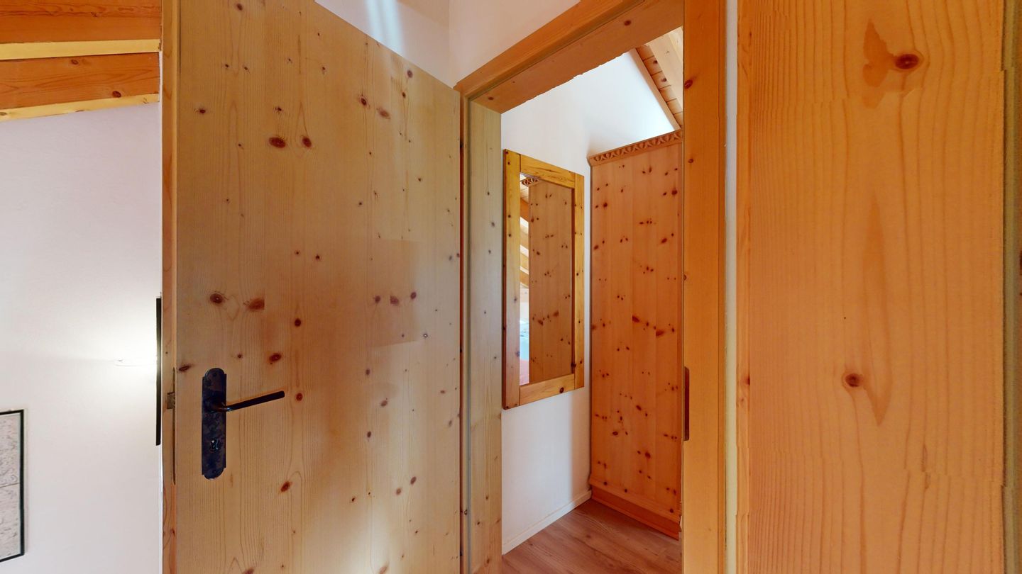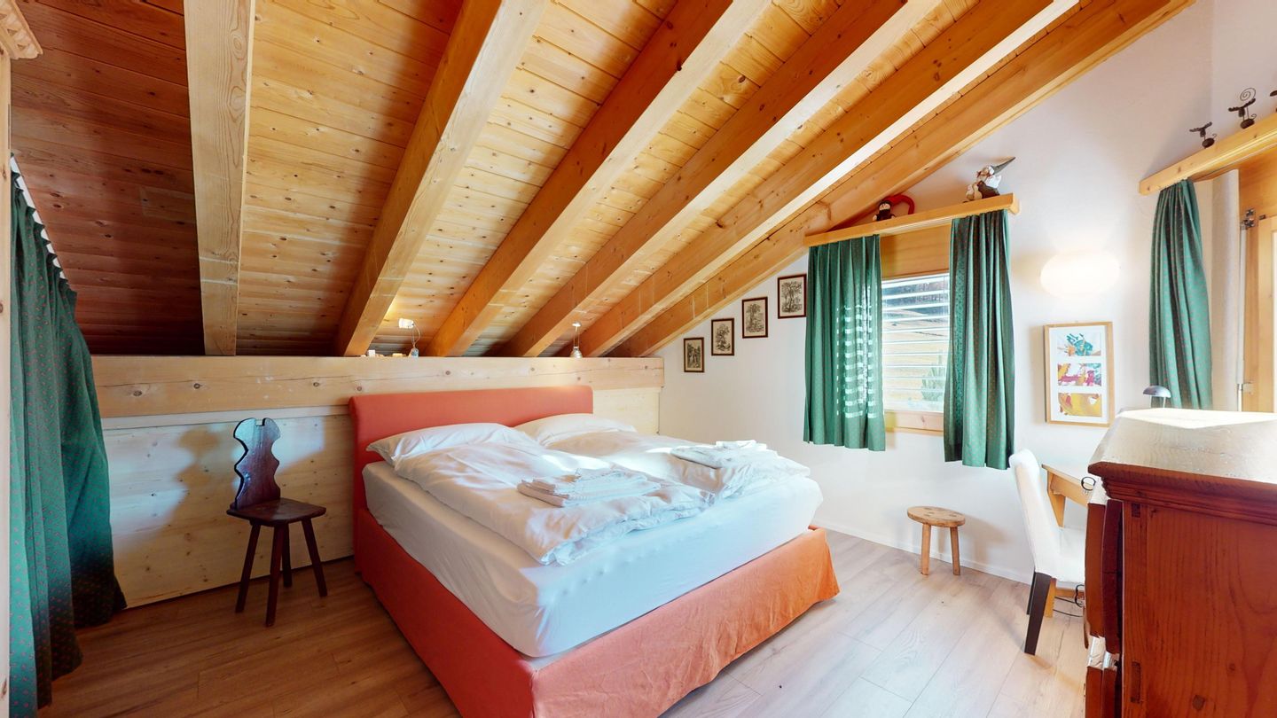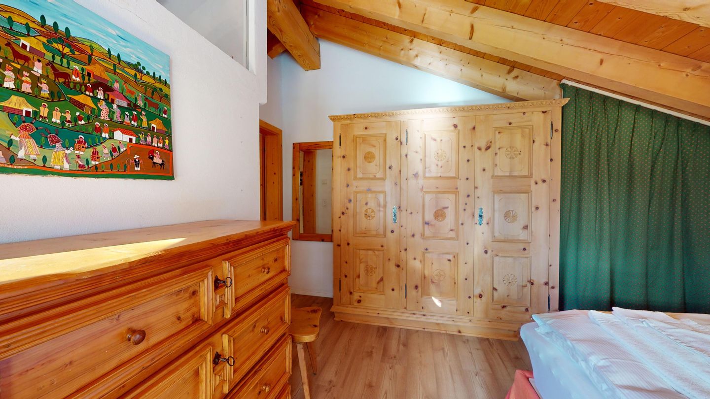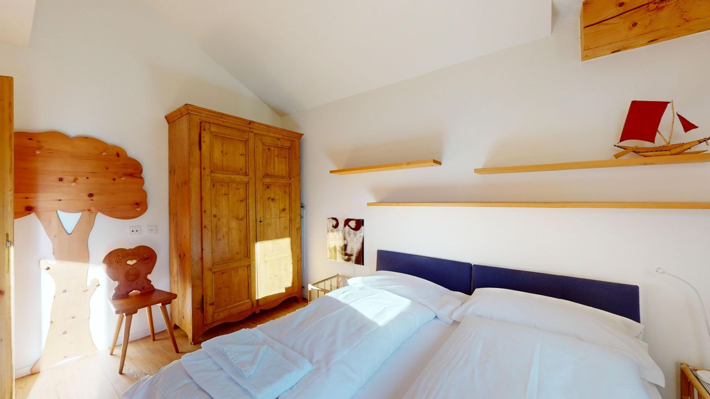 Maisonette 4-Zimmerwohnung im 1. Obergeschoss, Entrée mit Garderobe. Offene Küche mit Kühlschrank, Herd, Ofen und Geschirrspüler. Wohnzimmer mit Essecke, TV, Kamin und Ausgang auf den Balkon mit schöner Bergsicht. Ein Doppelzimmer mit Balkon und Treppe zur Wiese mit Gartensitzplatz (Gartenmöbel vorhanden). Badezimmer mit Dusche, WC, Lavabo, Waschmaschine und Tumbler. Ein Schlafzimmer mit zwei Etagenbetten. Auf der oberen Etage ein zweites Doppelzimmer und ein Badezimmer mit Wanne, Dusche, WC und Lavabo. Zwei Parkplätze in der Garage (Höhe 200cm, Breite 280cm). Nichtraucherwohnung. Haustiere sind nicht erlaubt.