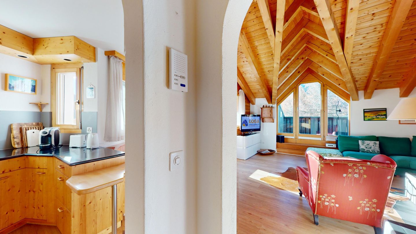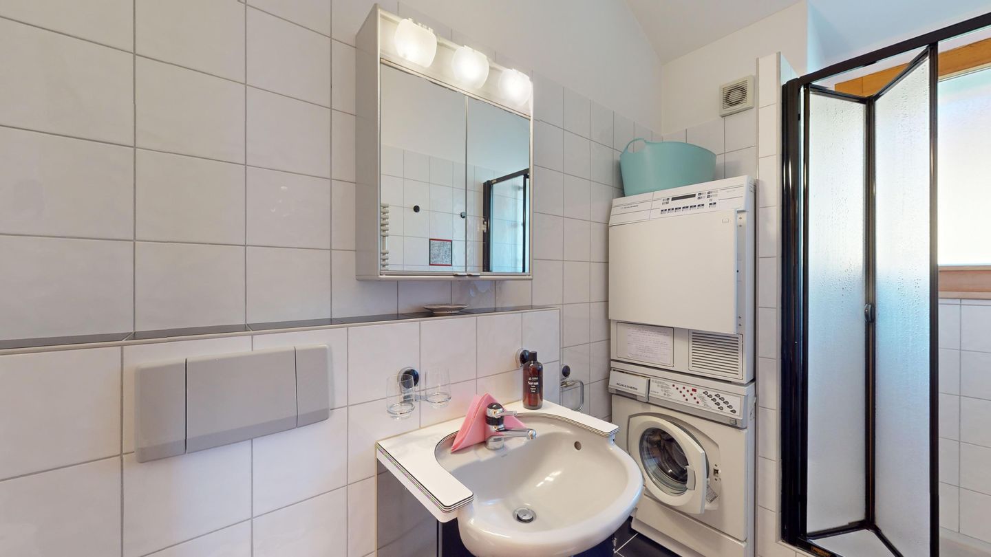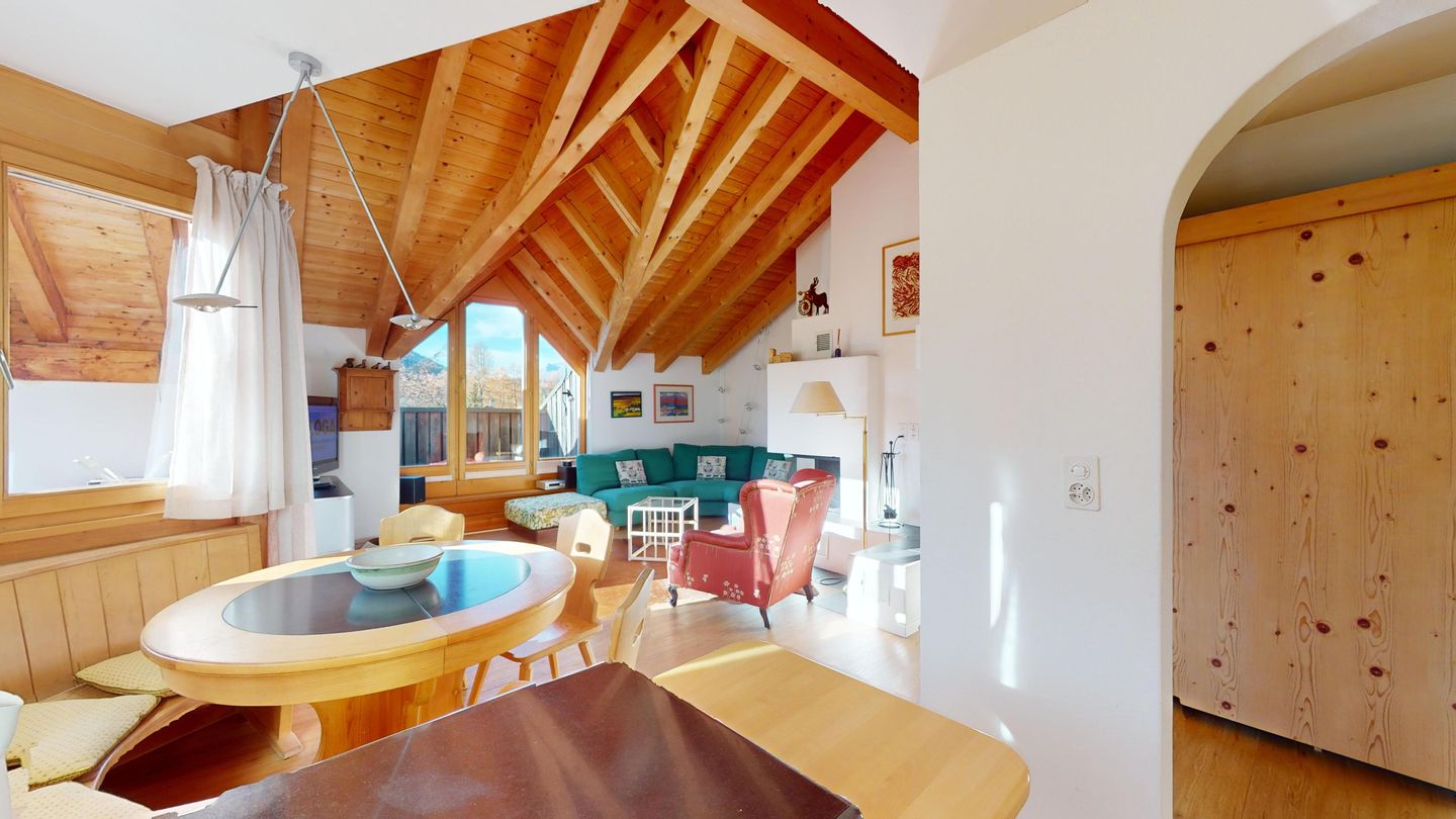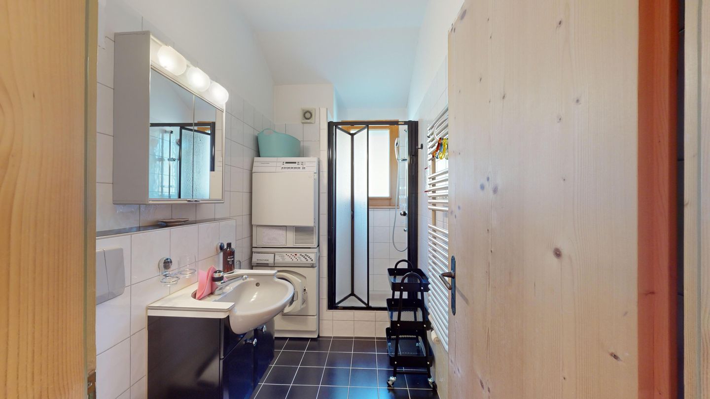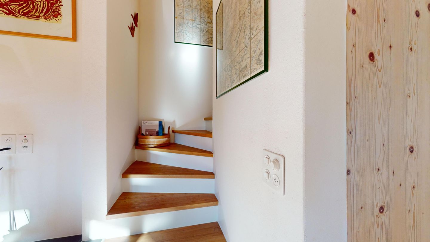 Maisonette 4-Zimmerwohnung im 1. Obergeschoss, Entrée mit Garderobe. Offene Küche mit Kühlschrank, Herd, Ofen und Geschirrspüler. Wohnzimmer mit Essecke, TV, Kamin und Ausgang auf den Balkon mit schöner Bergsicht. Ein Doppelzimmer mit Balkon und Treppe zur Wiese mit Gartensitzplatz (Gartenmöbel vorhanden). Badezimmer mit Dusche, WC, Lavabo, Waschmaschine und Tumbler. Ein Schlafzimmer mit zwei Etagenbetten. Auf der oberen Etage ein zweites Doppelzimmer und ein Badezimmer mit Wanne, Dusche, WC und Lavabo. Zwei Parkplätze in der Garage (Höhe 200cm, Breite 280cm). Nichtraucherwohnung. Haustiere sind nicht erlaubt.