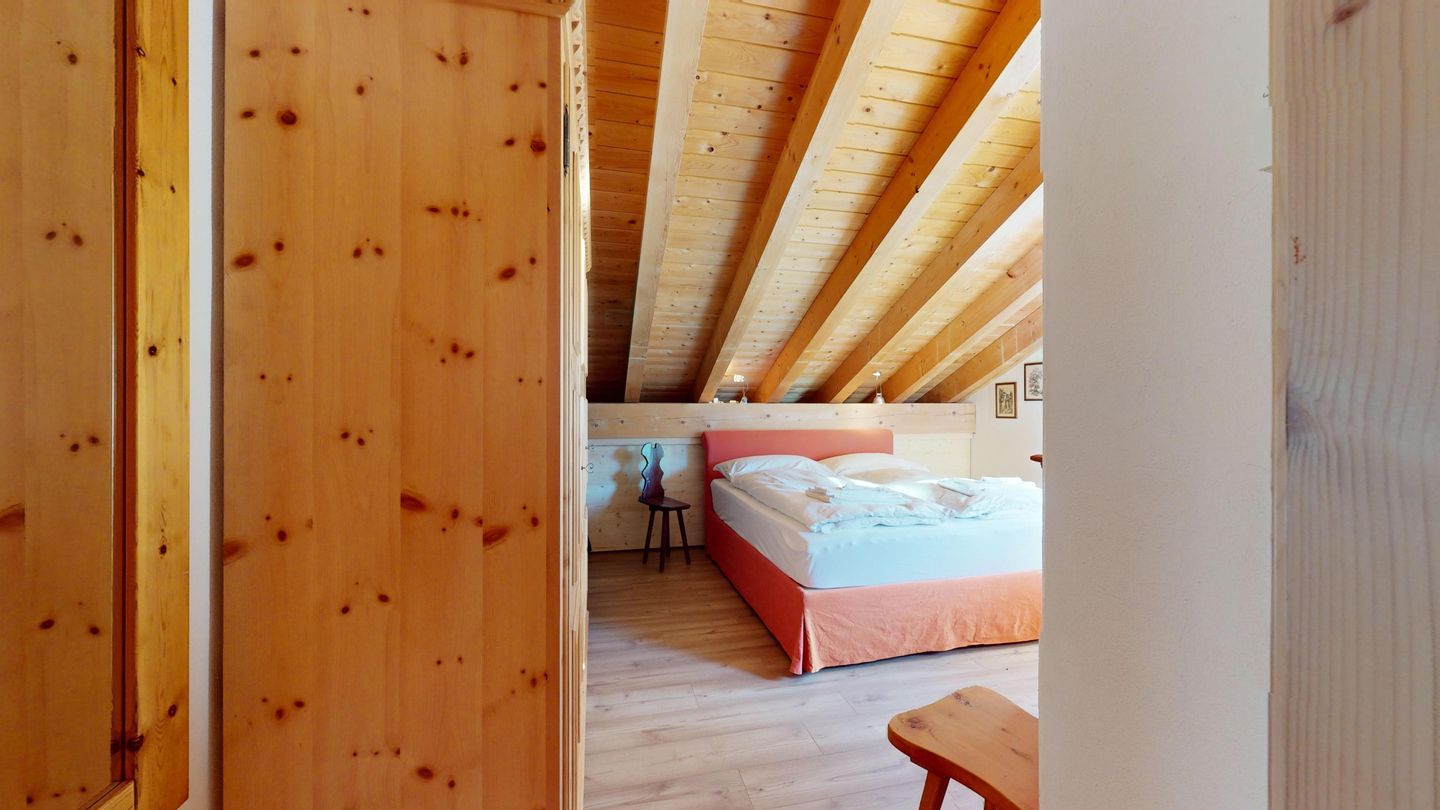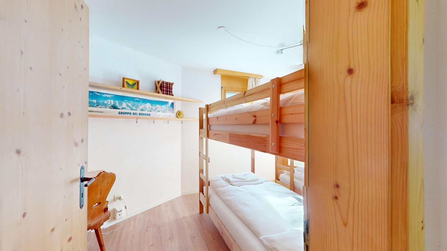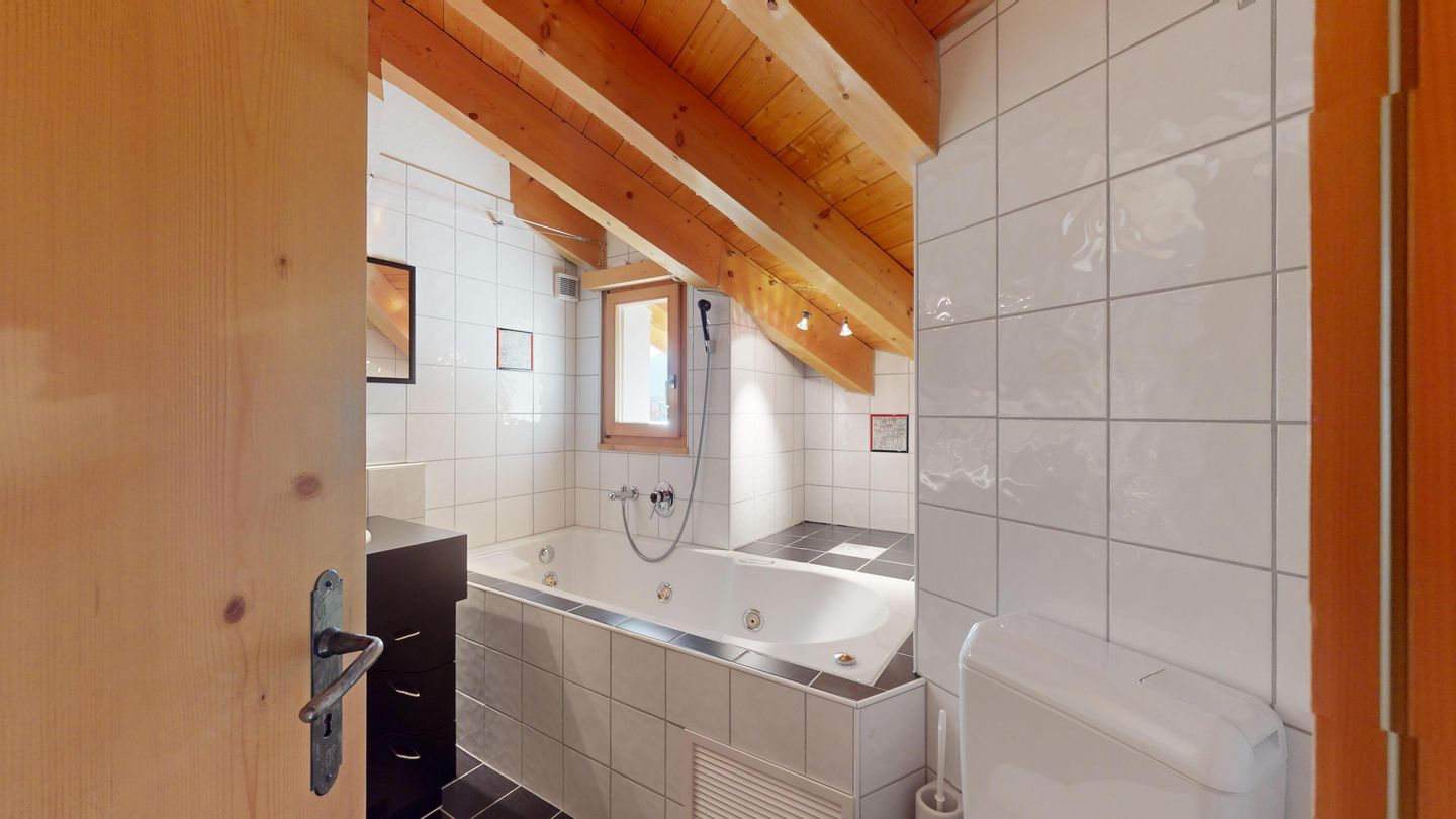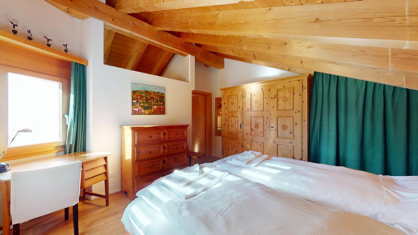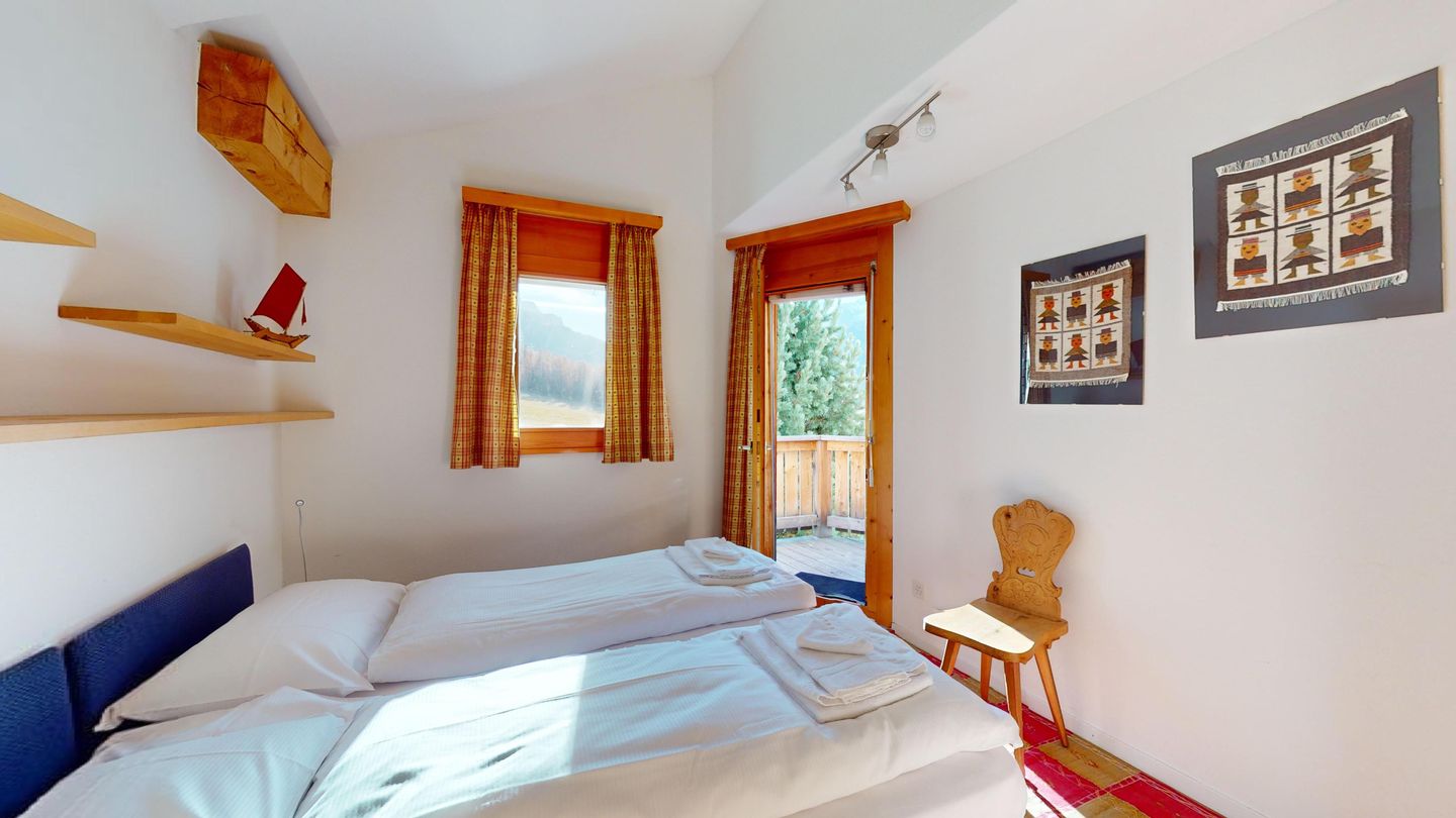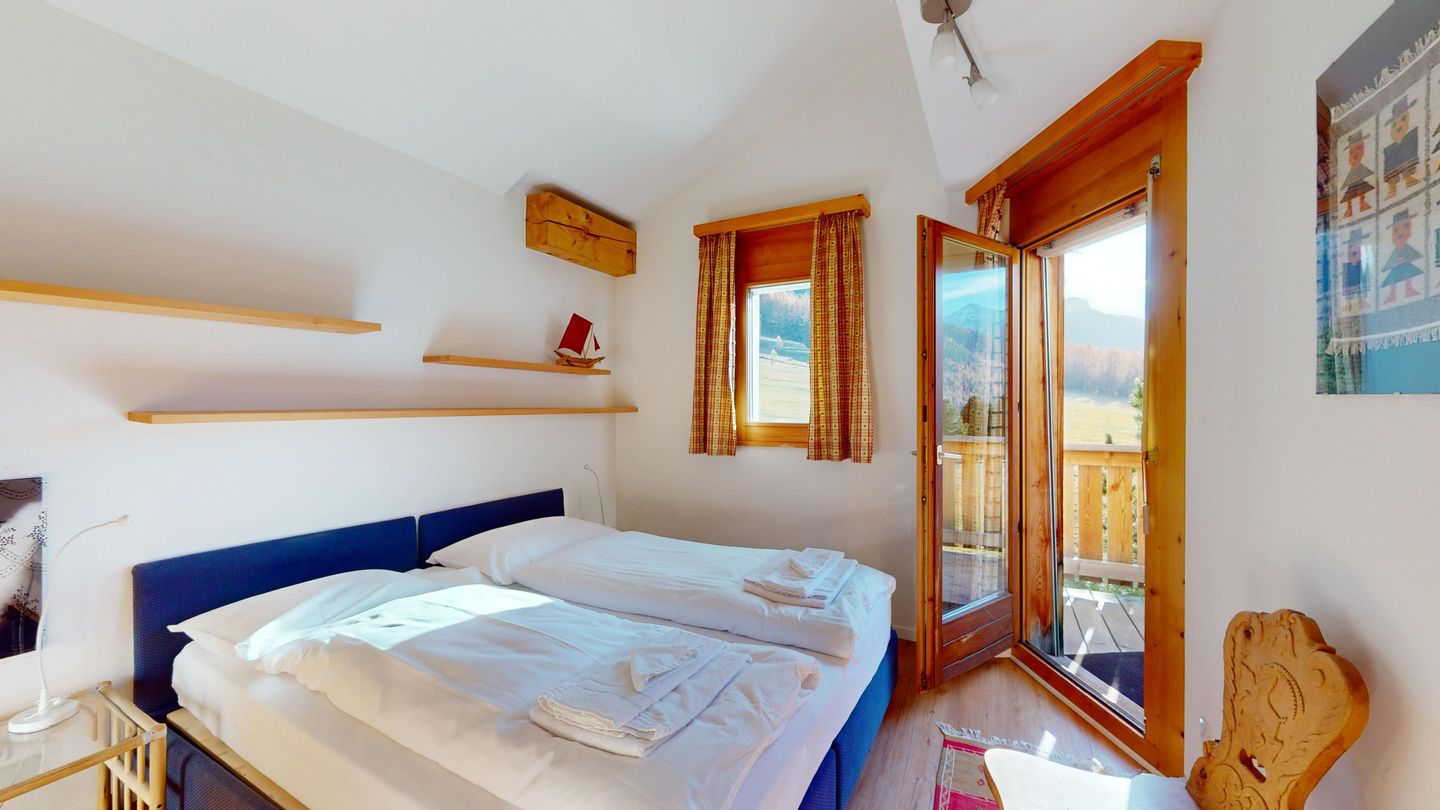 Maisonette 4-Zimmerwohnung im 1. Obergeschoss, Entrée mit Garderobe. Offene Küche mit Kühlschrank, Herd, Ofen und Geschirrspüler. Wohnzimmer mit Essecke, TV, Kamin und Ausgang auf den Balkon mit schöner Bergsicht. Ein Doppelzimmer mit Balkon und Treppe zur Wiese mit Gartensitzplatz (Gartenmöbel vorhanden). Badezimmer mit Dusche, WC, Lavabo, Waschmaschine und Tumbler. Ein Schlafzimmer mit zwei Etagenbetten. Auf der oberen Etage ein zweites Doppelzimmer und ein Badezimmer mit Wanne, Dusche, WC und Lavabo. Zwei Parkplätze in der Garage (Höhe 200cm, Breite 280cm). Nichtraucherwohnung. Haustiere sind nicht erlaubt.
