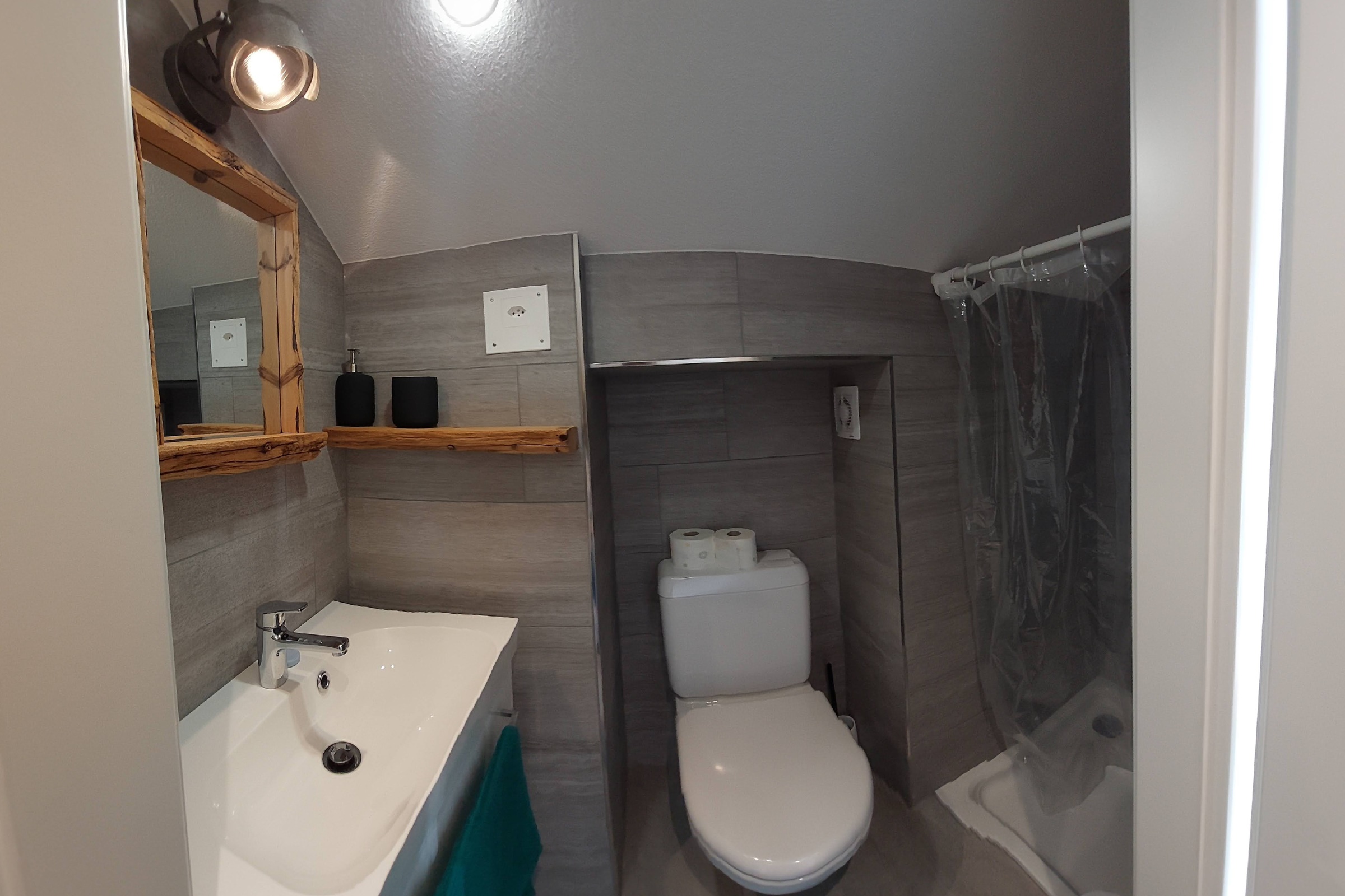 Ein Badezimmer mit Dusche, WC und Lavabo. Wohnbereich
