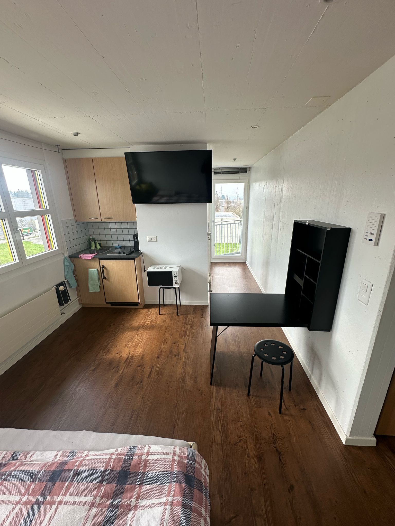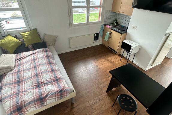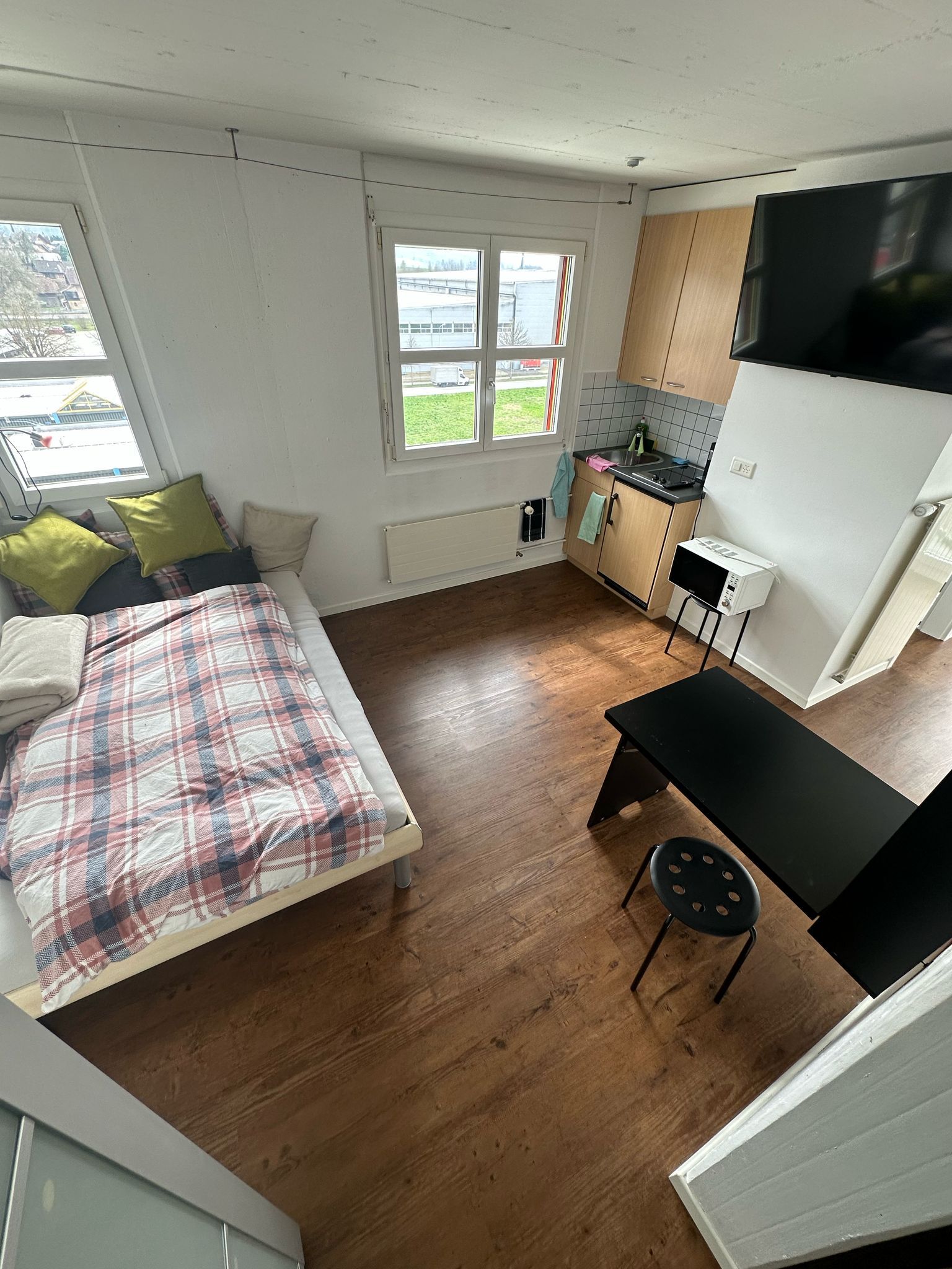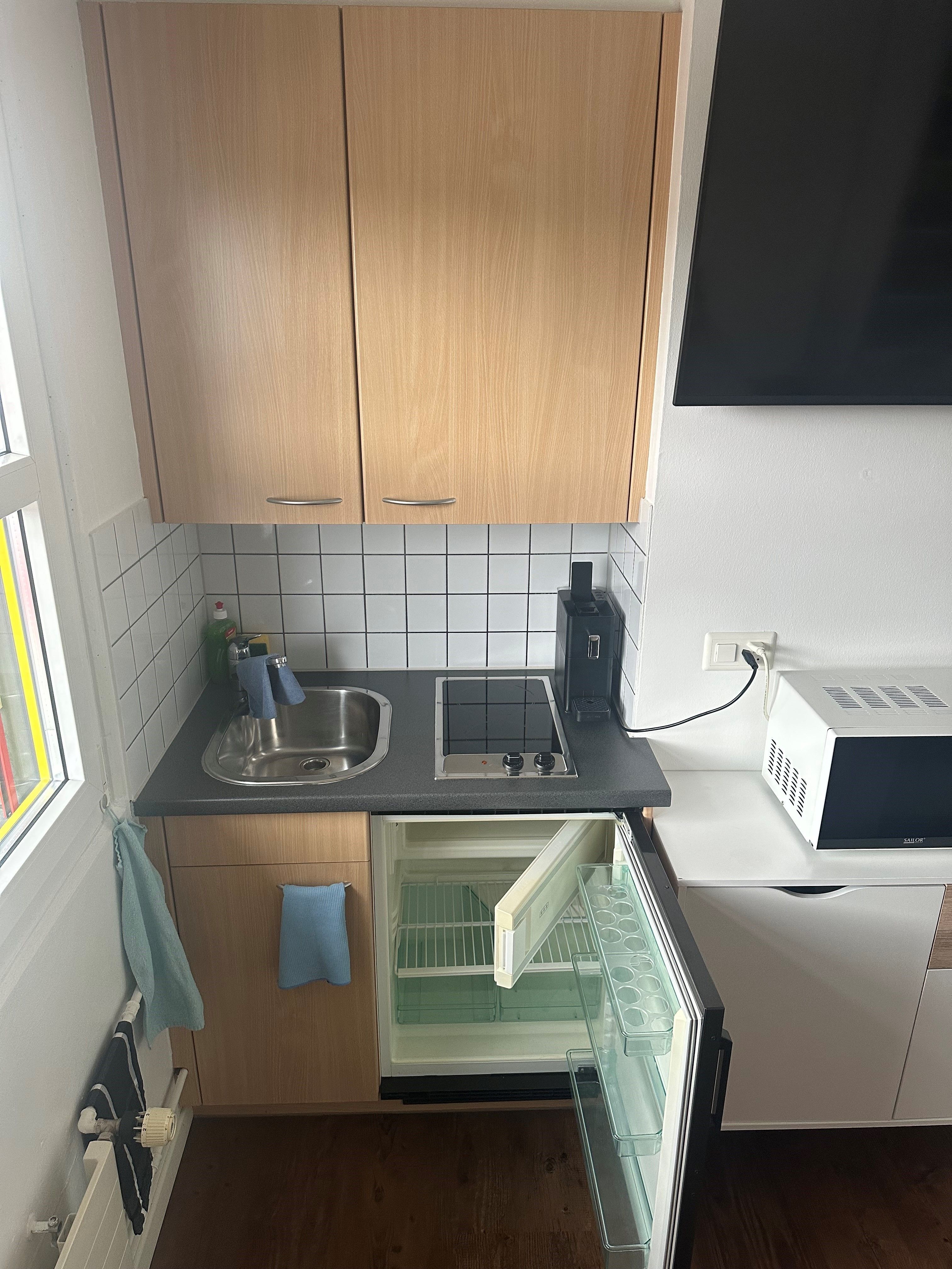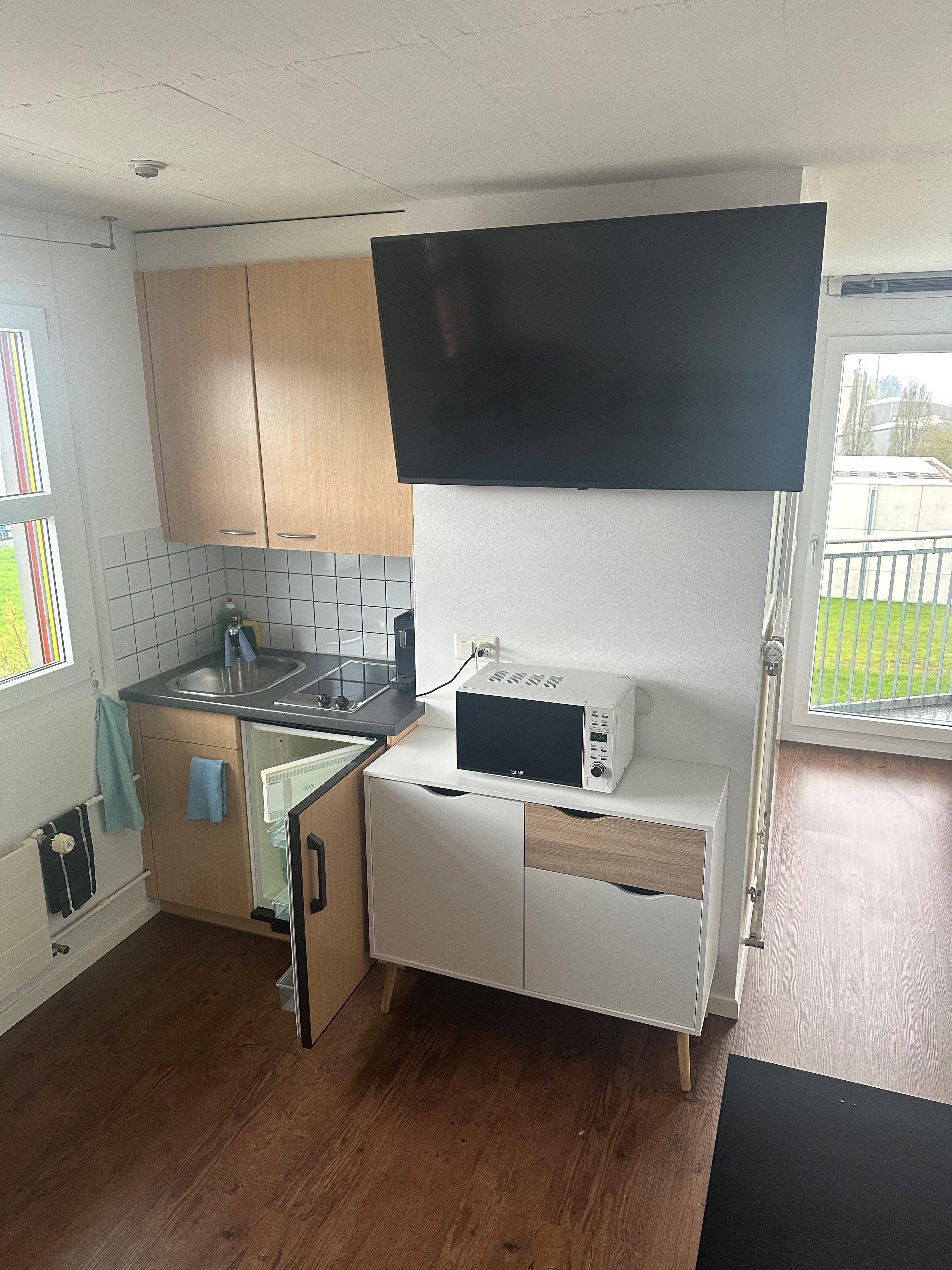 Die Innenausstattung dieses Studios ist sorgfältig zusammengestellt, um den Bedürfnissen eines Alleinreisenden gerecht zu werden. Es verfügt über einen 2-Platten-Herd und eine Kapsel-Kaffeemaschine, die Ihnen ermöglichen, sich eine Mahlzeit oder einen Kaffee zu jeder Tageszeit zu bereiten. Die vorhandene Waschmaschine und der Wäschetrockner zur alleinigen Nutzung garantieren zusätzlich Komfort für einen längerfristigen Aufenthalt.