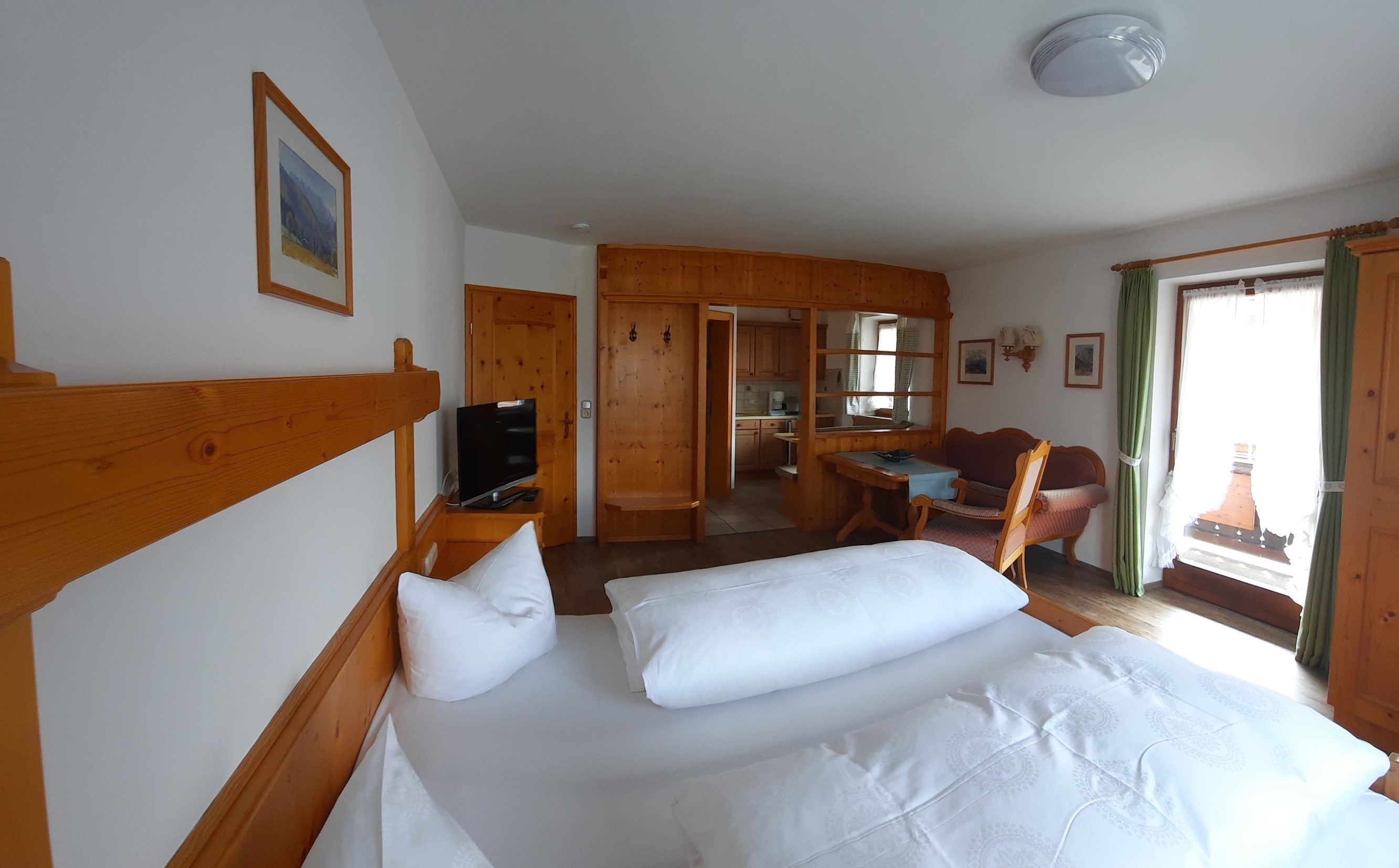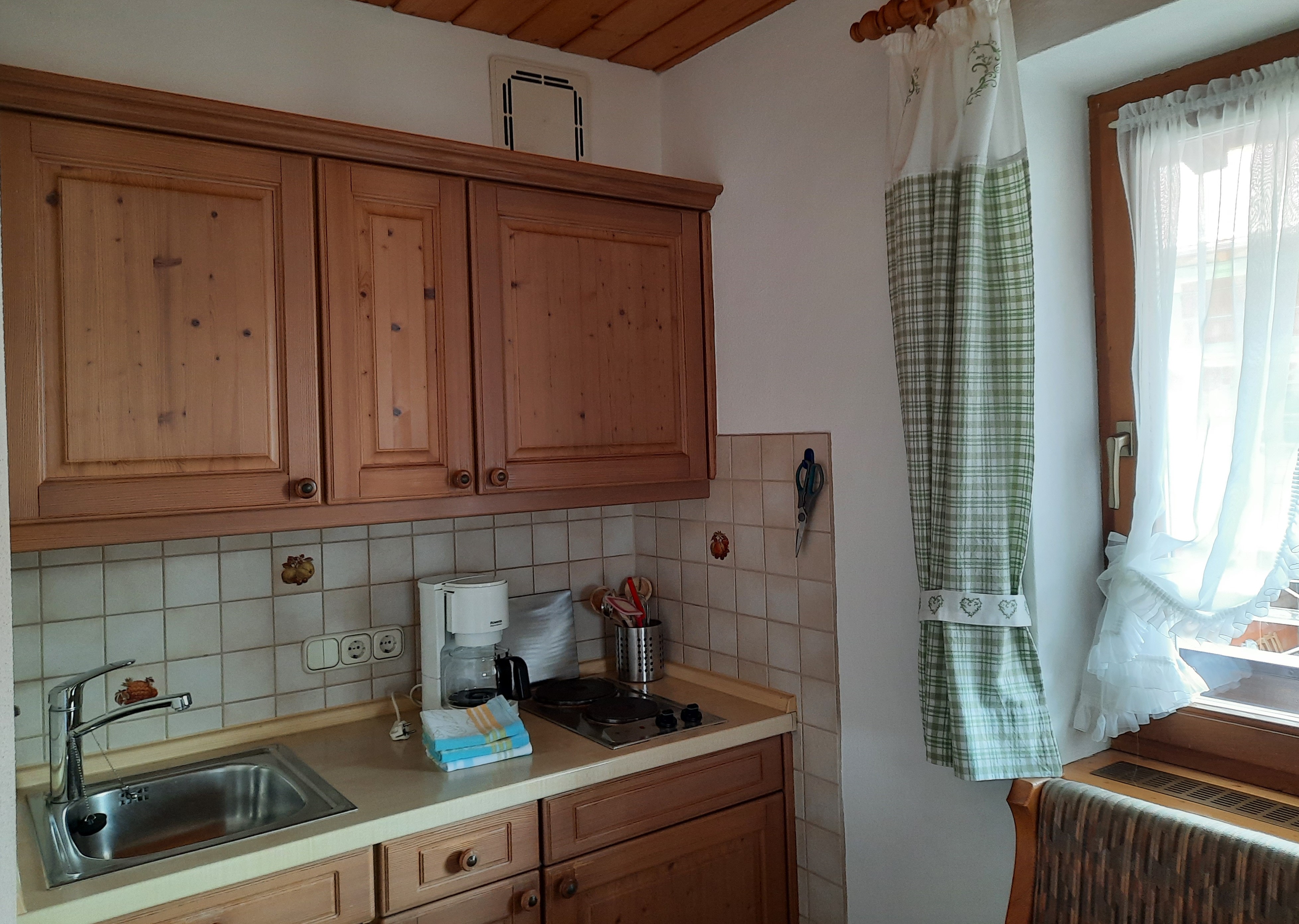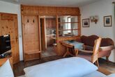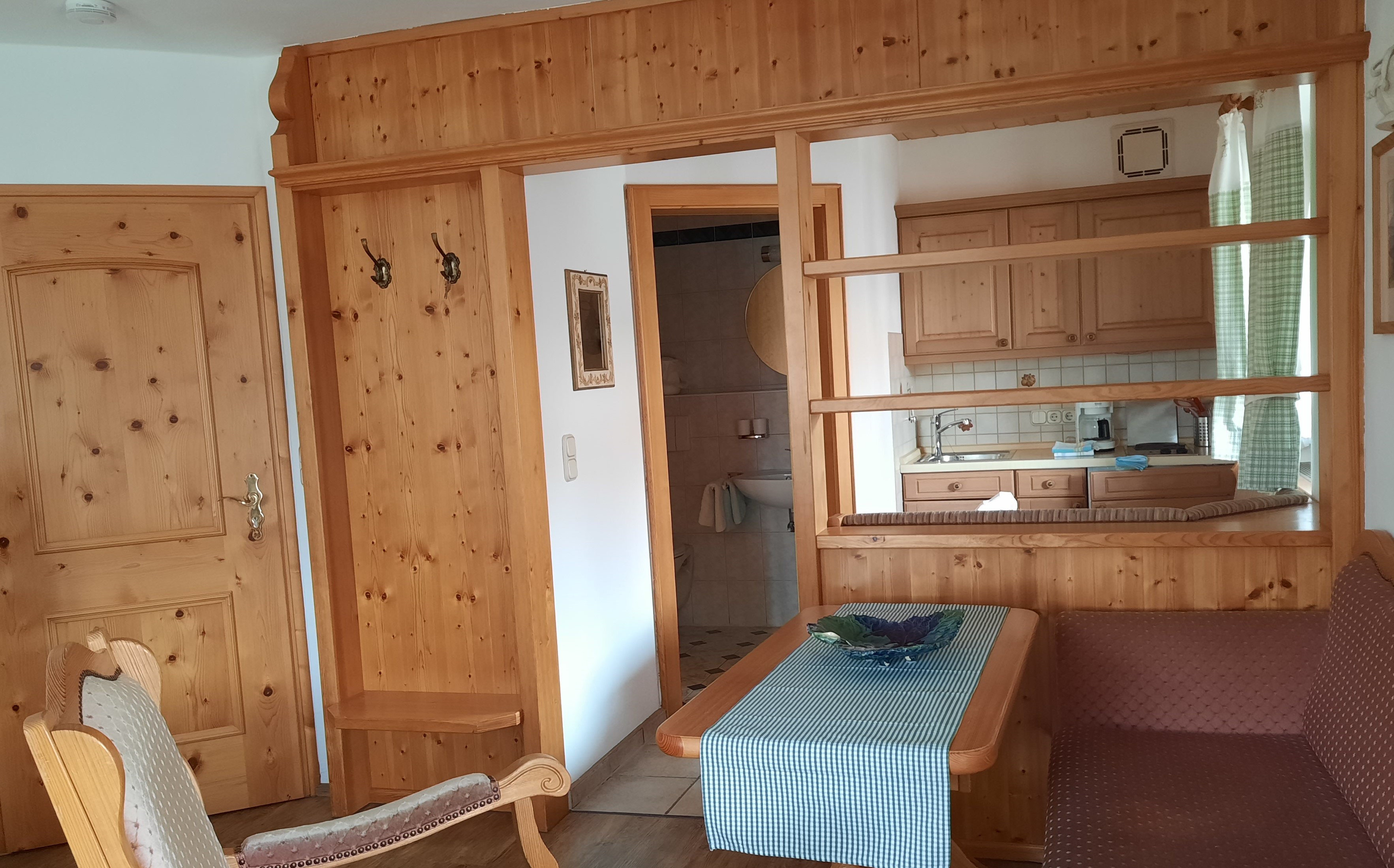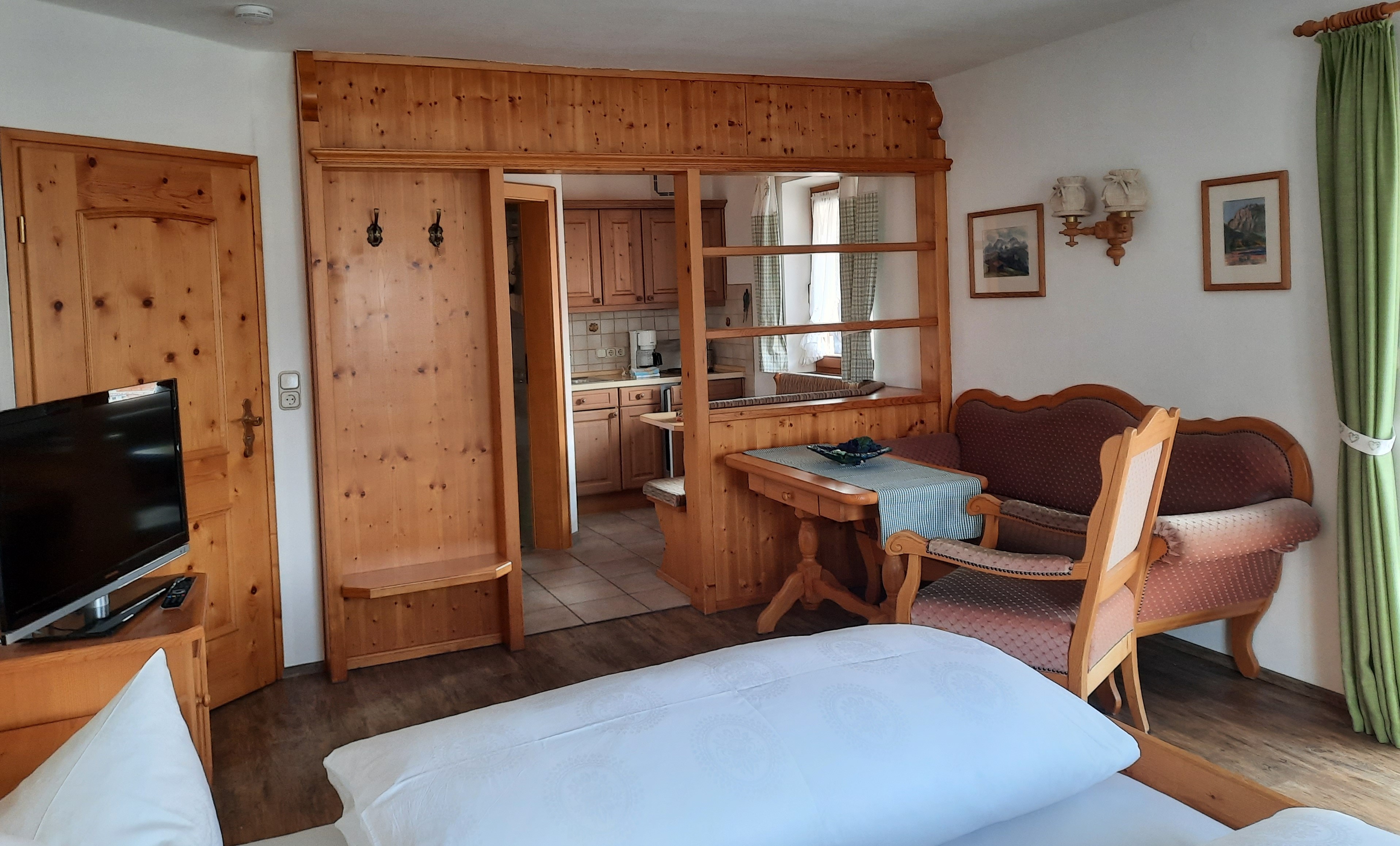 Schöne mit viel Holz eingerichtete Einraum-Ferienwohnung mit kleiner Küche und Eßecke separat. Schöner großer Balkon zur Südseite mit Bergblick. Sowie Bad mit Dusche/WC und großer Ablagefläche.