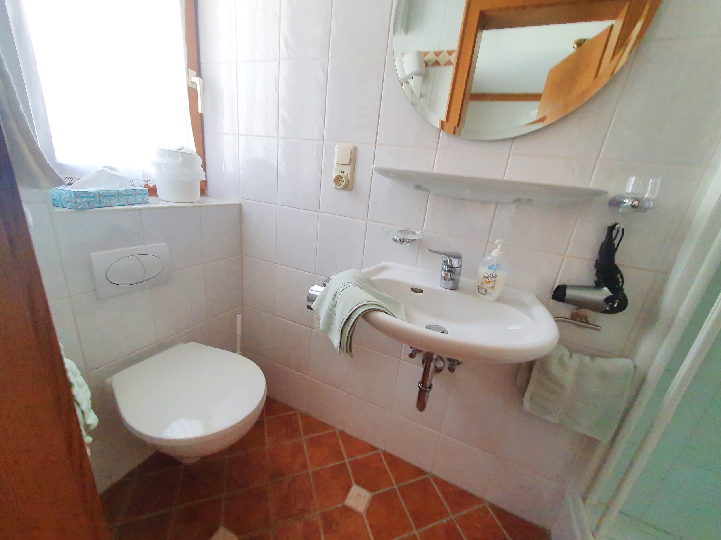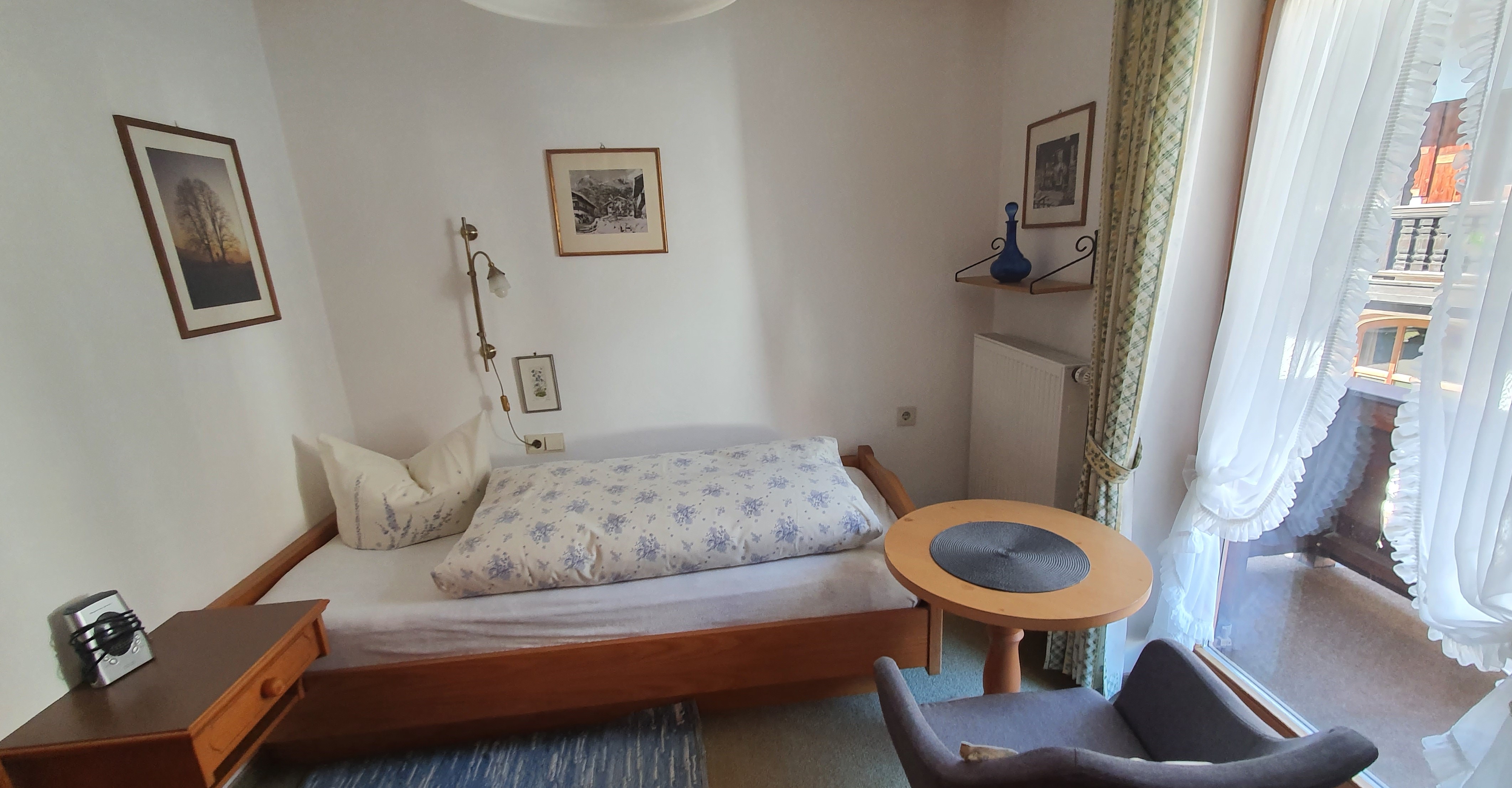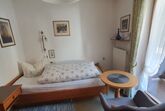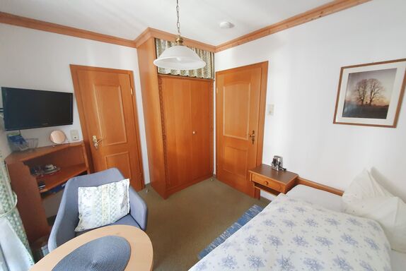 Schönes Einzelzimmer, klein, jedoch gemütlich mit TV-Ecke eingerichtet. Der Schrank verfügt über eine Kofferablage. Ein schönes, modernes Bad mit Dusche/WC befindet sich im Zimmer. Der Balkon bietet Ihnen einen Blick auf die anliegenden Häuser und in Richtung Ortsmitte