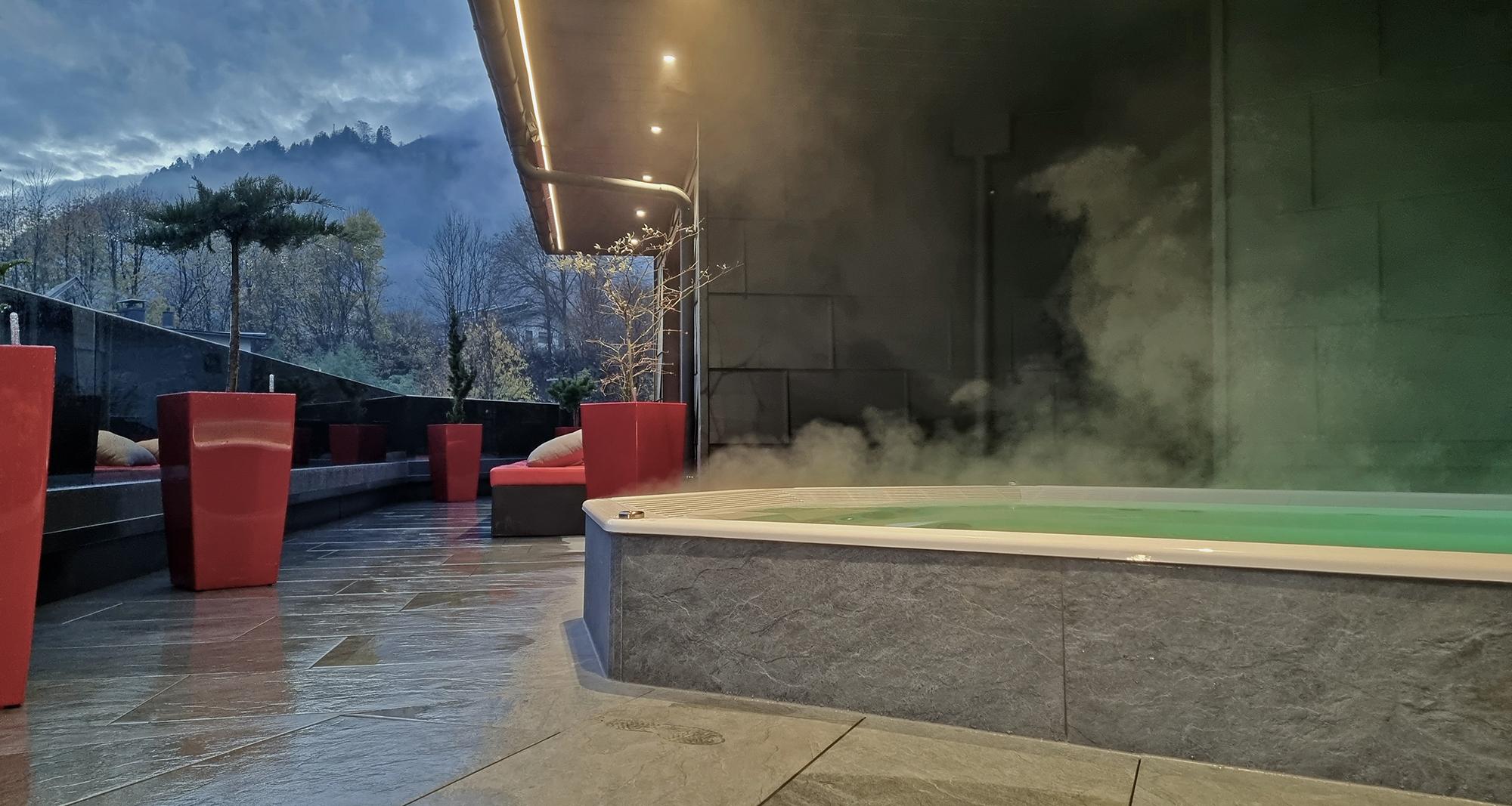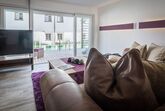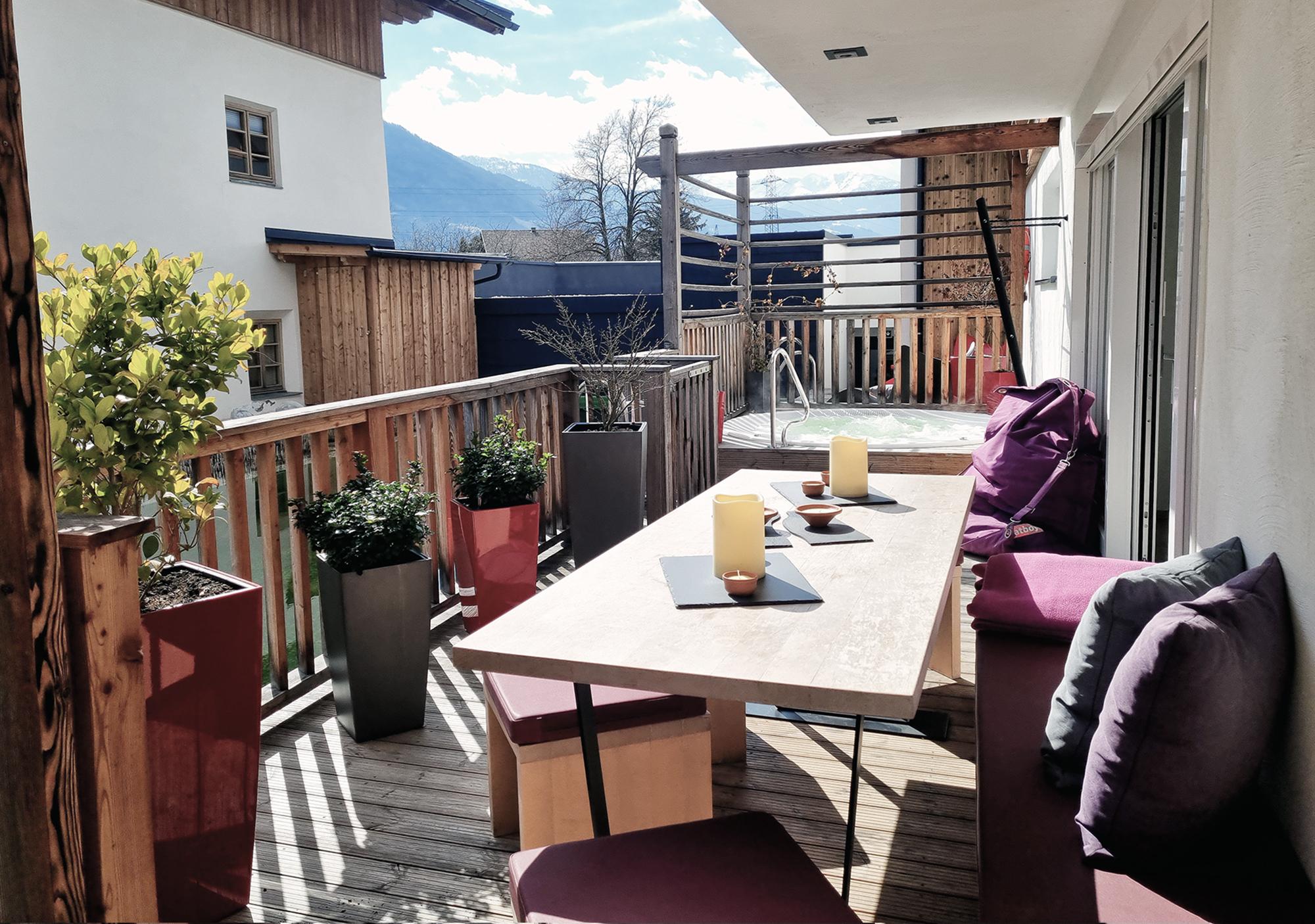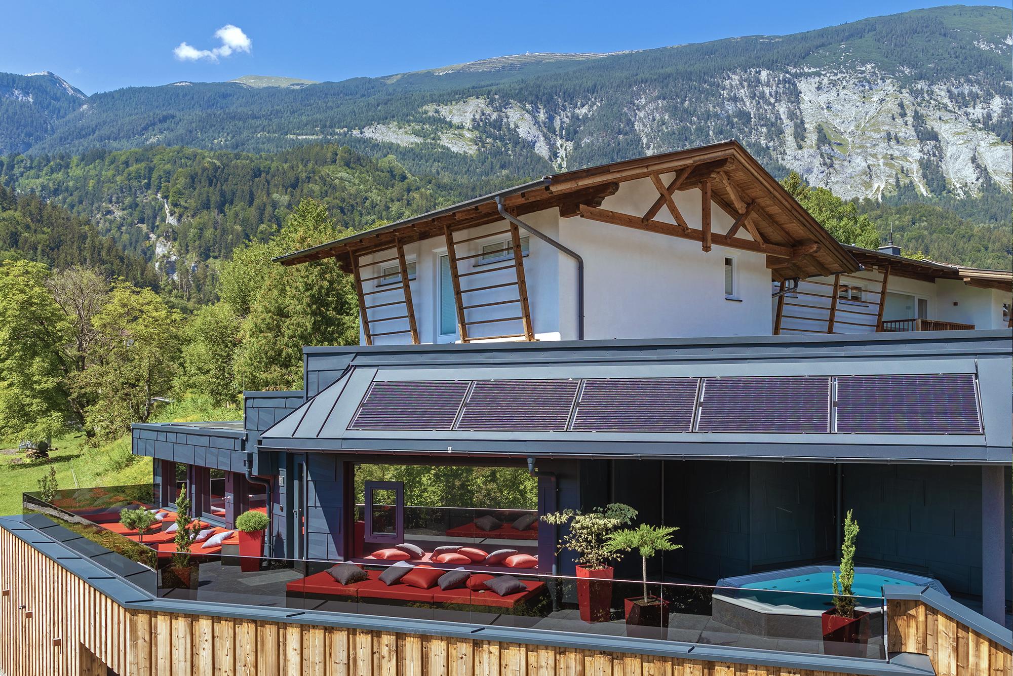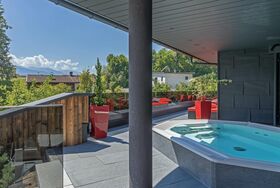 Die große Fensterfront eröffnet den Blick zum Schwimmteich und auf die Holzterrasse, die einen direkten Zugang zum Pool hat. Auf der Terrasse befindet sich zusätzlich ein Außen-Whirlpool.